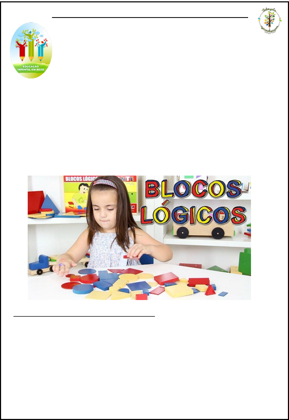 EXPERIÊNCIAS COM BLOCOS LÓGICOS NA EDUCAÇÃO INFANTIL Criado pelo matemático húngaro Zoltan Paul Dienes (1916), os blocos lógicos como material didático permitem associar a dinâmica, a lógica e o raciocínio abstrato. Os professores devem realizar ATIVIDADES COM OS BLOCOS LÓGICOS que objetivam desenvolver o pensamento das crianças. Quando aplicado na Educação Infantil, o material permite que a criança desenvolva suas primeiras noções de lógica, além das relações como correspondência e classificação. Os blocos lógicos constituem-se de caixas contendo 48 peças divididas. Os atributos são: três cores (vermelho, amarelo e azul), dois tamanhos (pequeno e grande), duas espessuras (fino e grosso), quatro formas (retângulo, quadrado, triângulo e círculo). Os trabalhos com blocos lógicos em atividades exigem da criança a manipulação, construção e representação de objetos estruturados, auxilia no desenvolvimento de habilidades de discriminação e memória visual; constância de forma e tamanho, sequência e simbolização. As atividades com esse material permitem à criança avançar do reconhecimento das formas para a percepção de suas propriedades, ou seja, caminhar do nível da visualização para o da análise. Com o auxílio dos “Blocos Lógicos organiza o pensamento, assimilando conceitos básicos de cor, forma e tamanho, além de realizar atividades mentais de seleção, comparação, classificação e ordenação. Sugestões de experIências com blocos lógicos: Exploração das figuras geométricas. Compreender e desenvolver as noções básicas das figuras geométricas. Desenvolver conceitos, semelhanças e diferenças, comparações, identificações das formas. Sequência de cores e formas. Conceitos: Grande / pequeno Maior / menor Grosso / fino CORRESPÔNDENCIA E CLASSIFICAÇÃO POR FORMAS E CORES ESPESSURA E TAMANHO SEPARAÇÃO POR CORES E FORMAS SEGUE SUGESTÕES DE EXPERIÊNCIAS DE APRENDIZAGEM: 1. DE SURPRESAS Material: Um saco de papel ou pano, algumas peças do Bloco Lógico. Desenvolvimento: Colocar todas as peças dentro do saco. Pedir que os alunos se sentem em círculo e vão passando o saco de pano de um para o outro sem pular ninguém. A professora em determinado momento diz “Já o aluno que estiver neste momento segurando o saco, deve pegar uma das peças e falar para os colegas os atributos da peça que pegou. Se ele esquecer algum atributo, a professora pode lembrá-lo de perguntas. Variação: Ao invés de dizer “já” pode-se usar uma radiola ou simular cuja interrupção da música marcará a hora de parar. Ou ainda, usar cartões coloridos com significados pré-estabelecidos. Ex.: Cartão Vermelho parar e pegar uma das peças, sentido de rotação. 2. SALTA POÇAS Material: Algumas peças de Blocos Lógicos. Desenvolvimento: Inventar uma estória sobre um personagem que para alcançar seu objetivo tenha que saltar sobre umas poças mágicas. Mas que ele descobriu uma maneira de conseguir pular todas sem escorregar. Para isto ele deveria falar tudo o que soubesse sobre a poça. Em seguida a professora espalha algumas peças pelo chão e diz que serão as poças. Um aluno por vez deve tentar percorrer o caminho. Para saltar a poça, ele primeiro deve dizer os atributos que ela tem. Quem conseguir saltar todas as peças recebe o “Troféu salta-poças”. Variação: Pode-se de acordo com o que foi trabalhado, pedir que digam apenas dois ou três atributos. Ex.: forma e cor, ou forma, cor e tamanho. 3. CADA QUAL EM SUA CASA Material: Cartolina ou chão riscado com o diagrama A ou B. Desenvolvimento: Entregar uma peça para cada criança. Contar a história de um menino que foi trabalhar de treinador de cachorros. Só que na hora de levar os cachorros de volta as suas casas, fez a maior confusão porque não respeitou as placas que indicavam quem morava naquela casa. Dizer que cada peça é um cachorro e que eles devem tentar colocar cada cachorro em sua casa. 4. PEDIDO MUDO Material: Os mesmos cartões do exercício anterior. 1 a 2 jogos de Blocos Lógicos de acordo com o número de crianças. Desenvolvimento: Separar a classe em duas filas, sentando uma defronte à outra. No espaço entre as duas filas, espalhar os Bloco Lógicos. Distribuir os 11 cartões, para as crianças. Uma criança levanta os cartões pedindo uma peça par ao companheiro da frente. Se este pegar a certa e entregá-la a quem pediu, marcar um ponto para fila correspondente. 5. EU FALO, ELE ANOTA Material: Um saco de papel ou pano, quadro de giz previamente preparado como o modelo, algumas peças de “Blocos Lógicos”. Desenvolvimento: Os alunos devem se subdividirem em duplas. Metade das duplas devem pertencer a um grupo de a outra metade a outro grupo. Uma das duplas inicia o jogo. Um dos alunos pega uma das peças de dentro do saco, e vai descrevendo-a para seu colega da dupla que simultaneamente deve ir anotando no quadro de giz. Se os dois acertaram marca um ponto para o grupo no qual pertencem. 6. SEU MESTRE CHAMOU Material: Uma peça de “Blocos Lógicos” para cada participante. Desenvolvimento: As crianças devem sentar-se em círculo. A professora distribui uma peça para cada criança e fica no centro da roda. Este exercício pode ser graduado: Vêm para o centro os que tiverem quadrado. “Vem para o centro os que tiverem quadrado amarelos”. Vêm para o centro onde tiver quadrados amarelos grossos. “Os que errarem podem esperar sentados no centro, até o começo de uma nova rodada”. Variação: A professora pode fazer o chamado através de cartões como os do exercício 4, só que em tamanho maior. Faixa Etária: Variando o número de atributos, conforme atividade descrita. 7. QUEM É O DIFERENTE? Material: Um jogo de Blocos Lógicos Desenvolvimento: A professora escolhe peças que tenham atributos em comum e entre elas coloca uma que seja diferente. Ex.: uma peça azul pequena entre outras azuis e grandes. A professora fala ou