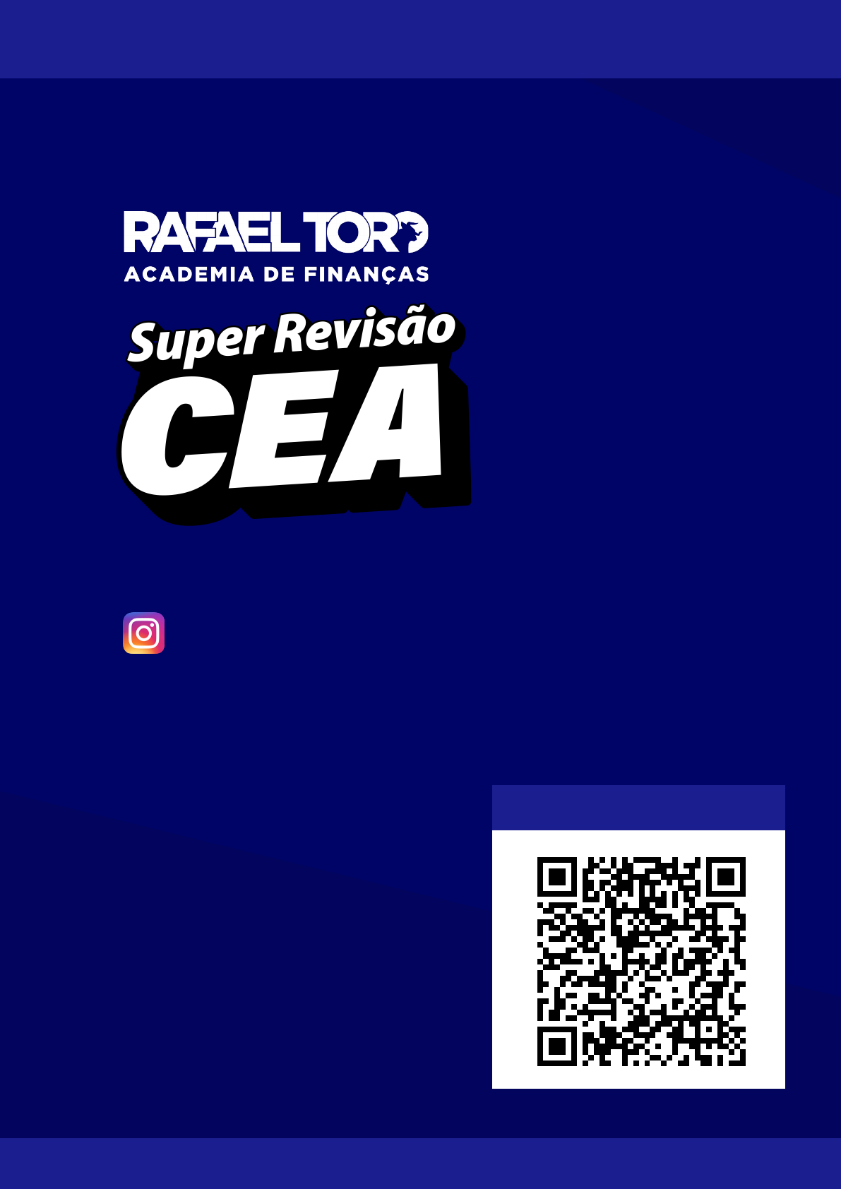 Simulados CPA-20 MATERIAL ATUALIZADO Pra ficar por dentro de todas as novidades, siga a gente no Instagram: Clique aqui para acessar os outros materiais @academiarafaeltoro ou Escaneie o QR Code AAttuuaalliizzaaddoo em 02 de julho/2024 https://www.instagram.com/academiarafaeltoro/ https://www.academiarafaeltoro.com.br/central-de-materiais-gratuitos/ SOBRE NÓS Com mais de 50 mil alunos, a Academia Rafael Toro (também chamada de ART), foi fundada em 2017, tendo o professor Rafael Toro como idealizador e fundador. Movido pela vontade de transformar a maneira com que as pessoas aprendiam, o Toro desenvolveu uma metodologia de aprendizado que revolucionou o mercado de Certificações no Brasil e já aprovou milhares de pessoas nas principais provas da Anbima, Planejar, Ancord e Apimec. SOBRE NÓS Com mais de 50 mil alunos, a Academia Rafael Toro (também chamada de ART), foi fundada em 2017, tendo o professor Rafael Toro como idealizador e fundador. Movido pela vontade de transformar a maneira com que as pessoas aprendiam, o Toro desenvolveu uma metodologia de aprendizado que revolucionou o mercado de Certificações no Brasil e já aprovou milhares de pessoas nas principais provas da Anbima, Planejar, Ancord e Apimec. Apostila Super Revisão - 04-08-2024 Super revisão - 70 em 60 - 04 de agosto 2024 01 [101175] São atribuições da Superintendência de Seguros Privados (SUSEP) adotar medidas às sociedades seguradoras, tais como I – estabelecer as taxas aplicáveis às condições de cobertura especial. II – fixar os critérios para a aprovação dos limites de operações. III – determinar as tarifas e condições facultativas de apólices. IV – nomear um diretor fiscal em casos de má-situação econômico-financeira. Está correto o que se afirmar APENAS em a) l e IV. b) I e ll. c) III e IV. d) II e IV. 02 [201211] De acordo com a Instrução CVM 554 (e suas atualizações), são considerados investidores profissionais: a) As pessoas jurídicas não-financeiras com patrimônio líquido superior a R$ 10.000.000,00. b) As companhias seguradoras. c) As pessoas físicas com patrimônio superior a R$ 1.000.000,00 e que adicionalmente, atestem por escrito sua condição de investidor profissional. d) Os investidores individuais que possuam investimentos financeiros com valor igual ou superior a R$ 1.000.000,00 e que, adicionalmente, atestem por escrito sua condição de investidor profissional. 03 [102186] Um especialista em investimentos, que atua como gerente de private banking em uma instituição financeira, visitou seu cliente e obteve as seguintes informações sobre as operações I e II realizadas recentemente por intermédio de sua instituição: I – Compra de debêntures no valor de R$ 100.000,00 de uma empresa de médio porte, com remuneração equivalente a 60% do DI, com data de vencimento em 10 anos. II – Aquisição de uma participação em uma empresa, por R$ 40.000,00 e, após 30 dias, venda dessa participação a um terceiro por R$ 200.000,00. Esse profissional reportou à área de controles internos responsável pela análise de operações suspeitas de lavagem de dinheiro da instituição as informações obtidas, após a visita. Inexistindo justificativa adicional para as condições das operações I e II, essa instituição financeira: a) Deverá comunicar I e II ao Banco Central do Brasil. b) Deverá comunicar I e II ao Conselho de Controle de Atividades Financeiras (COAF). c) Deverá comunicar apenas II ao Conselho de Controle de Atividades Financeiras (COAF) d) Não deverá comunicar I e II à autoridade competente, mas manter o registro dessas operações por, no mínimo, 10 anos. 2 Apostila Super Revisão - 04-08-2024 04 [101318] São obrigações de instituições participantes do Código de Certificação da ANBIMA assegurar que seus profissionais. I – Sejam diligentes e não contribuam para a veiculação de notícias e/ou informações inverídicas sobreo mercado financeiro e de capitais. II – Não tenham sido punidos definitivamente, a qualquer tempo, em decorrência de atuarem como membro de conselho fiscal de entidade supervisionada pelo BACEN ou pela CVM. III – Evitem a adoção de práticas de concorrência desleal. IV – Não sejam influenciadores digitais de investimento, de forma a mitigar a exposição ao risco dessa instituição por sua vinculação. Está correto o que se afirma, APENAS em: a) I e III b) I e II c) III e IV d) II e IV 05 [202506] Segundo o Código de Distribuição da ANBIMA, o serviço de Private compreende a distribuição de Produtos de Investimento para pessoas que tenham capacidade financeira de, no mínimo, a) R$ 3.000.000,00 b) R$ 10.000.000,00 c) R$ 1.000.000,00 d) R$ 5.000.000,00 06 [108111] Em 1986, ocorreu o acidente nuclear da usina de Chernobyl na Ucrânia (então parte da União Soviética). Ele foi considerado um dos piores acidentes da história da energia nuclear, gerando grandes impactos por meio da emissão de uma nuvem radioativa que alcançou diversos países na Europa. Grandes regiões na Ucrânia, Bielorrússia e Rússia foram atingidas, causando a evacuação de aproximadamente 200 mil pessoas. Considerando o caso mencionado, podemos citar exemplos dos impactos socioambientais causados pelo acidente: a) conflitos entre os países pela disputa de áreas não atingidas pelo acidente e pelas usinas radioativas operacionais. b) aumento das emissões de gases de efeito estufa provocados pelo acidente, intensificando o aquecimento global. c) aumento do número de doenças nas pessoas e de perda de biodiversidade causadas pelas emissões radioativas. d) desligamento de usinas nucleares em outros países para reduzir o consumo de materiais radioativos. 07 [203162] O Balanço de Pagamentos de um país apresenta, em um determinado período de tempo, um déficit em Transações Correntes e um superávit nos Ativos de Reserva. Supondo que o saldo de Erros e Omissões, seja zero: a) o movimento da Conta
