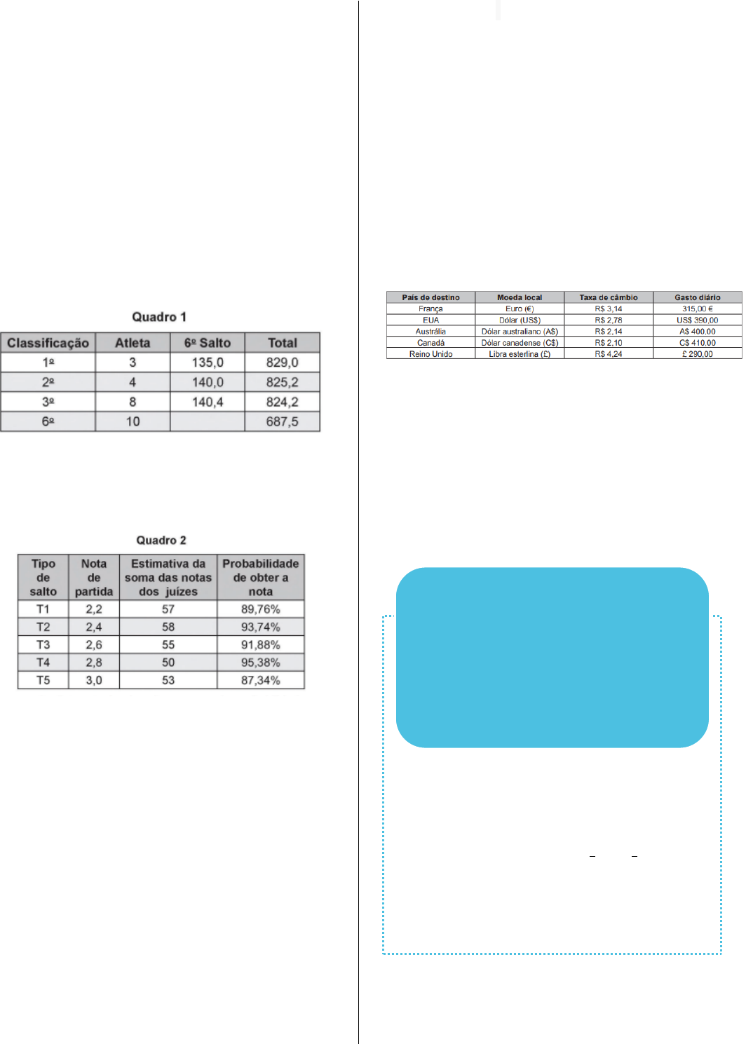 53 22 (Enem 2018) O salto ornamental é um esporte em que cada competidor realiza seis saltos. A nota em cada salto é calculada pela soma das notas dos juízes, multiplicada pela nota de partida (o grau de dificuldade de cada salto). Fica em primeiro lugar o atleta que obtiver a maior soma das seis notas recebidas. O atleta 10 irá realizar o último salto da final. Ele observa no Quadro 1, antes de executar o salto, o recorte do quadro parcial de notas com a sua classificação e a dos três primeiros lugares até aquele momento. Ele precisa decidir com seu treinador qual salto deverá realizar. Os dados dos possíveis tipos de salto estão no Quadro 2. O atleta optará pelo salto com a maior probabilidade de obter a nota estimada, de maneira que lhe permita alcançar o primeiro lugar. Considerando essas condições, o salto que o atleta deverá escolher é o de tipo A) T1. B) T2. C) T3. D) T4. E) T5. 23 (Enem 2019) Um casal planejou uma viagem e definiu como teto para o gasto diário um valor de até R$ 1 000,00. Antes de decidir o destino da viagem, fizeram uma pesquisa sobre a taxa de câmbio vigente para as moedas de cinco países que desejavam visitar e também sobre as estimativas de gasto diário em cada um, com o objetivo de escolher o destino que apresentasse o menor custo diário em real. O quadro mostra os resultados obtidos com a pesquisa realizada. Nessas condições, qual será o destino escolhido para a viagem? A) Austrália. B) Canadá. C) EUA. D) França. E) Reino Unido *01 Deve se considerar que o tempo de duração de cada viagem é de 4 dias, caso contrário, existe mais de uma resposta. *16 Admita que a carta na mesa é 6 8 e não 8 9 . *17 Lembre-se que a pena é mínima quando a redução for máxima e a pena é máxima quando a redução for mínima. (Questão Anulada pelo INEP) GABARITO 1. 𝐶∗ 2. 𝐷 3. 𝐷 4. 𝐵 5. 𝐸 6. 𝐵 7. 𝐷 8. 𝐸 9. 𝐶 10. 𝐵 11. 𝐴 12.𝐶 13. 𝐸 14. 𝐵 15. 𝐵 16. 𝐸∗ 17. 𝐴∗ 18.𝐵 19. 𝐶 20. 𝐶 21. 𝐷 22. 𝐶 23. 𝐴 54 01 (Enem 2011) O medidor de energia elétrica de uma residência, conhecido por “relógio de luz”, é constituído de quatro pequenos relógios, cujos sentidos de rotação estão indicados conforme a figura: A medida é expressa em kWh. O número obtido na leitura é composto por 4 algarismos. Cada posição do número é formada pelo último algarismo ultrapassado pelo ponteiro. O número obtido pela leitura em kWh, na imagem, é: A) 2 614. B) 2 624. C) 2 715. D) 2 725. E) 4 162. 02 (Enem 2012) Num projeto da parte elétrica de um edifício residencial a ser construído, consta que as tomadas deverão ser colocadas a 0,20 m acima do piso, enquanto os interruptores de luz deverão ser colocados a 1,47 m acima do piso. Um cadeirante, potencial comprador de um apartamento desse edifício, ao ver tais medidas, alerta para o fato de que elas não contemplarão suas necessidades. Os referenciais de alturas (em metros) para atividades que não exigem o uso de força são mostrados na figura seguinte. Uma proposta substitutiva, relativa às alturas de tomadas e interruptores, respectivamente, que atenderá àquele potencial comprador é A) 0,20 m e 1,45 m. B) 0,20 m e 1,40 m. C) 0,25 m e 1,35 m. D) 0,25 m e 1,30 m. E) 0,45 m e 1,20 m. 03 (Enem 2014) Os incas desenvolveram uma maneira de registrar quantidades e representar números utilizando um sistema de numeração decimal posicional: um conjunto de cordas com nós denominado quipus. O quipus era feito de uma corda matriz, ou principal (mais grossa que as demais), na qual eram penduradas outras cordas, mais finas, de diferentes tamanhos e cores (cordas pendentes). De acordo com a sua posição, os nós significavam unidades, dezenas, centenas e milhares. Na Figura 1, o quipus representa o número decimal 2 453. Para representar o “zero” em qualquer posição, não se coloca nenhum nó. Disponível em: www.culturaperuana.com.br. Acesse em: 13 dez. 2012. O número da representação do quipus da Figura 2, em base decimal, é A) 364. B) 463. C) 3 064. D) 3 640. E) 4 603. 2.7 Sistema de Numeração Decimal 55 04 (Enem 2012) João decidiu contratar os serviços de uma empresa por telefone através do SAC (Serviço de Atendimento ao Consumidor). O atendente ditou para João o número de protocolo de atendimento da ligação e pediu que ele anotasse. Entretanto, João não entendeu um dos algarismos ditados pelo atendente e anotou o número 1 3 _ 9 8 2 0 7, sendo que o espaço vazio é o do algarismo que João não entendeu. De acordo com essas informações, a posição ocupada pelo algarismo que falta no número de protocolo é a de: A) centena. B) dezena de milhar. C) centena de milhar. D) milhão. E) centena de milhão. 05 (Enem 2016) O ábaco é um antigo instrumento de cálculo que usa notação posicional de base dez para representar números naturais. Ele pode ser apresentado em vários modelos, um deles é formado por hastes apoiadas em uma base. Cada haste corresponde a uma posição no sistema decimal e nelas são colocadas argolas; a quantidade de argolas na haste representa o algarismo daquela posição. Em geral, colocam-se adesivos abaixo das hastes com os símbolos U, D, C, M, DM e CM que correspondem, respectivamente, a unidades, dezenas, centenas, unidades de milhar, dezenas de milhar e centenas de milhar, sempre começando com a unidade na haste da direita e as demais ordens do número no sistema decimal nas hastes subsequentes (da direita para esquerda), até a haste que se encontra mais à esquerda. Entretanto, no ábaco da figura, os adesivos não seguiram a disposição usual. Nessa disposição, o número que está representado na figura é: A) 46 171. B) 147 016 C) 171 064. D) 460 171. E) 610 741. 01 (Enem 2011) Um jovem investidor precisa escolher qual investimento lhe trará maior retorno financeiro em uma aplicação de R$ 500,00. Para isso, pesquisa o rendimento e o imposto a ser pago em dois invest