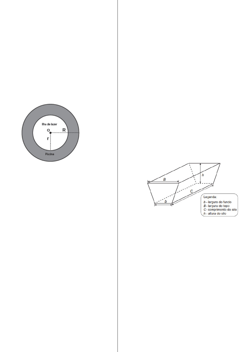 77 11 (Enem 2013) Num parque aquático existe uma piscina infantil na forma de um cilindro circular reto, de 1 m de profundidade e volume igual a 12 m³, cuja base tem raio R e centro O. Deseja-se construir uma ilha de lazer seca no interior dessa piscina, também na forma de um cilindro circular reto, cuja base estará no fundo da piscina e com centro da base coincidindo com o centro do fundo da piscina, conforme a figura. O raio da ilha de lazer será r. Deseja-se que após a construção dessa ilha, o espaço destinado à água na piscina tenha um volume de, no mínimo, 4 m³. Considere 3 como valor aproximado para π Para satisfazer as condições dadas, o raio máximo da ilha de lazer r, em metros, estará mais próximo de: A) 1,6 B) 1,7 C) 2,0 D) 3,0 E) 3,8 12 (Enem 2014) Uma empresa farmacêutica produz medicamentos em pílulas, cada uma na forma de um cilindro com uma semiesfera com o mesmo raio do cilindro em cada uma de suas extremidades. Essas pílulas são moldadas por uma máquina programada para que os cilindros tenham sempre 10 mm de comprimento, adequando o raio de acordo com o volume desejado. Um medicamento é produzido em pílulas com 5 mm de raio. Para facilitar a deglutição, deseja-se produzir esse medicamento diminuindo o raio para 4 mm, e, por consequência, seu volume. Isso exige a reprogramação da máquina que produz essas pílulas. Use 3 como valor aproximado para π. A redução do volume da pílula, em milímetros cúbicos, após a reprogramação da máquina, será igual a: A) 168. B) 304. C) 306. D) 378. E) 514. 13 (Enem 2014) Na alimentação de gado de corte, o processo de cortar a forragem, colocá-la no solo, compactá-la e protegê-la com uma vedação denomina-se silagem. Os silos mais comuns são os horizontais, cuja forma é a de um prisma reto trapezoidal, conforme mostrado na figura. Considere um silo de 2 m de altura, 6 m de largura de topo e 20 m de comprimento. Para cada metro de altura do silo, a largura do topo tem 0,5 m a mais do que a largura do fundo. Após a silagem, 1 tonelada de forragem ocupa 2 m³ desse tipo de silo. EMBRAPA. Gado de corte. Disponível em: www.cnpgc.embrapa.br. Acesso em: 1 ago. 2012 (adaptado). Após a silagem, a quantidade máxima de forragem que cabe no silo, em toneladas, é: A) 110. B) 125. C) 130. D) 220. E) 260. 78 14 (Enem 2014) Um sinalizador de trânsito tem o formato de um cone circular reto. O sinalizador precisa ser revestido externamente com adesivo fluorescente, desde sua base (base do cone) até a metade de sua altura, para sinalização noturna. O responsável pela colocação do adesivo precisa fazer o corte do material de maneira que a forma do adesivo corresponda exatamente à parte da superfície lateral a ser revestida. Qual deverá ser a forma do adesivo? A) D) B) E) C) 15 (Enem 2015) Para o modelo de um troféu foi escolhido um poliedro P, obtido a partir de cortes nos vértices de um cubo. Com um corte plano em cada um dos cantos do cubo, retira-se o canto, que é um tetraedro de arestas menores do que metade da aresta do cubo. Cada face do poliedro P, então, é pintada usando uma cor distinta das demais faces. Com base nas informações, qual é a quantidade de cores que serão utilizadas na pintura das faces do troféu? A) 6 B) 8 C) 14 D) 24 E) 30 16 (Enem 2015) Uma fábrica de sorvetes utiliza embalagens plásticas no formato de paralelepípedo retangular reto. Internamente, a embalagem tem 10 cm de altura e base de 20 cm por 10 cm. No processo de confecção do sorvete, uma mistura é colocada na embalagem no estado líquido e, quando levada ao congelador, tem seu volume aumentado em 25%, ficando com consistência cremosa. Inicialmente é colocada na embalagem uma mistura sabor chocolate com volume de 1 000 cm³ e, após essa mistura ficar cremosa, será adicionada uma mistura sabor morango, de modo que, ao final do processo de congelamento, a embalagem fique completamente preenchida com sorvete, sem transbordar. O volume máximo, em cm³, da mistura sabor morango que deverá ser colocado na embalagem é: A) 450. B) 500. C) 600. D) 750. E) 1 000. 17 (Enem 2015) O índice pluviométrico é utilizado para mensurar a precipitação da água da chuva, em milímetros, em determinado período de tempo. Seu cálculo é feito de acordo com o nível de água da chuva acumulada em 1 m², ou seja, se o índice for de 10 mm, significa que a altura do nível de água acumulada em um tanque aberto, em formato de um cubo com 1 m² de área de base, é de 10 mm. Em uma região, após um forte temporal, verificou-se que a quantidade de chuva acumulada em uma lata de formato cilíndrico, com raio 300 mm e altura 1 200 mm, era de um terço da sua capacidade. Utilize 3,0 como aproximação para π. O índice pluviométrico da região, durante o período do temporal, em milímetros, é de: A) 10,8. B) 12,0. C) 32,4. D) 108,0. E) 324,0. 79 18 (Enem 2015) Para resolver o problema de abastecimento de água foi decidida, numa reunião do condomínio, a construção de uma nova cisterna. A cisterna atual tem formato cilíndrico, com 3 m de altura e 2 m de diâmetro, e estimou-se que a nova cisterna deverá comportar 81 m³ de água, mantendo o formato cilíndrico e a altura da atual. Após a inauguração da nova cisterna a antiga será desativada. Utilize 3,0 como aproximação para π. Qual deve ser o aumento, em metros, no raio da cisterna para atingir o volume desejado? A) 0,5 B) 1,0 C) 2,0 D) 3,5 E) 8,0 19 (Enem 2016) É comum os artistas plásticos se apropriarem de entes matemáticos para produzirem, por exemplo, formas e imagens por meio de manipulações. Um artista plástico, em uma de suas obras, pretende retratar os diversos polígonos obtidos pelas intersecções de um plano com uma pirâmide regular de base quadrada. Segundo a classificação dos polígonos, quais deles são possíveis de serem obtidos pelo artista plástico? A) Quadrados, apenas B) Triângulos e quadrados, apenas C) Triângulos, 