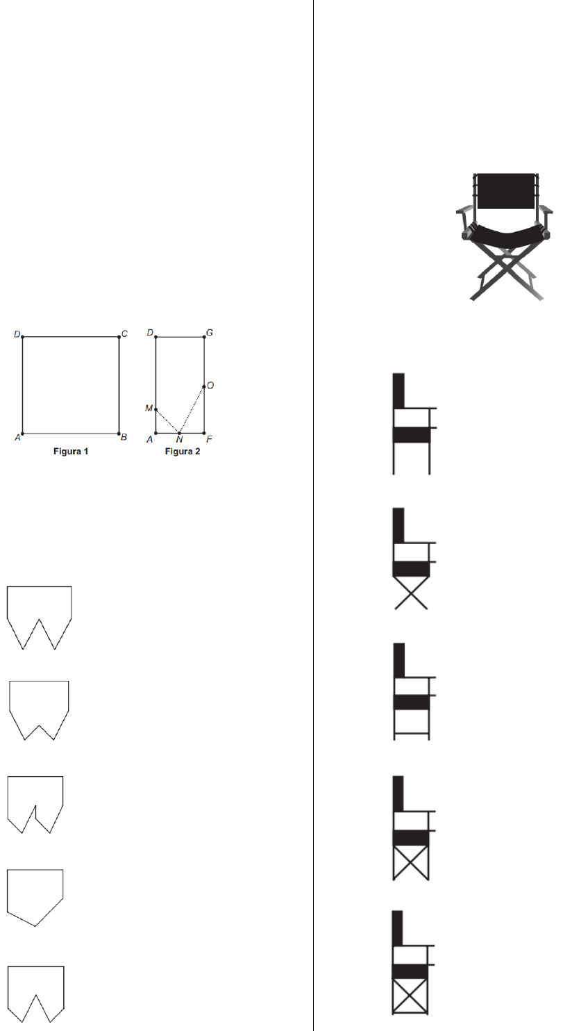 92 06 (Enem 2015) Uma família fez uma festa de aniversário e enfeitou o local da festa com bandeirinhas de papel. Essas bandeirinhas foram feitas da seguinte maneira: inicialmente, recortaram as folhas de papel em forma de quadrado, como mostra a Figura 1. Em seguida, dobraram as folhas quadradas ao meio sobrepondo os lados BC e AD, de modo que C e D coincidam, e o mesmo ocorra com A e B, conforme ilustrado na Figura 2. Marcaram os pontos médios O e N, dos lados FG e AF, respectivamente, e o ponto M do lado AD, de modo que AM seja igual a um quarto de AD. A seguir, fizeram cortes sobre as linhas pontilhadas ao longo da folha dobrada. Após os cortes, a folha é aberta e a bandeirinha está pronta. A figura que representa a forma da bandeirinha pronta é: A) B) C) D) E) 07 (Enem 2016) Os alunos de uma escola utilizaram cadeiras iguais às da figura para uma aula ao ar livre. A professora, ao final da aula, solicitou que os alunos fechassem as cadeiras para guardá-las. Depois de guardadas, os alunos fizeram um esboço da vista lateral da cadeira fechada. Qual é o esboço obtido pelos alunos? A) B) C) D) E) 93 08 (Enem 2016) A figura representa o globo terrestre e nela estão marcados os pontos A, B e C. Os pontos A e B estão localizados sobre um mesmo paralelo, e os pontos B e C, sobre um mesmo meridiano. É traçado um caminho do ponto A até C, pela superfície do globo, passando por B, de forma que o trecho de A até B se dê sobre o paralelo que passa por A e B e, o trecho de B até C se dê sobre o meridiano que passa por B e C. Considere que o plano α é paralelo à linha do equador na figura. A projeção ortogonal, no plano α, do caminho traçado no globo pode ser representada por: A) B) C) D) E) 09 (Enem 2018) Minecraft é um jogo virtual que pode auxiliar no desenvolvimento de conhecimentos relacionados a espaço e forma. É possível criar casas, edifícios, monumentos e até naves espaciais, tudo em escala real, através do empilhamento de cubinhos. Um jogador deseja construir um cubo com dimensões 4 x 4 x 4. Ele já empilhou alguns dos cubinhos necessários, conforme a figura. Os cubinhos que ainda faltam empilhar para finalizar a construção do cubo, juntos, formam uma peça única, capaz de completar a tarefa. O formato da peça capaz de completar o cubo 4 x 4 x 4 é A) B) C) D) E) 94 10 (Enem 2019) Um grupo de países criou uma instituição responsável por organizar o Programa Internacional de Nivelamento de Estudos (PINE) com o objetivo de melhorar os índices mundiais de educação. Em sua sede foi construída uma escultura suspensa, com a logomarca oficial do programa, em três dimensões, que é formada por suas iniciais, conforme mostrada na figura. Essa escultura está suspensa por cabos de aço, de maneira que o espaçamento entre letras adjacentes é o mesmo, todas têm igual espessura e ficam dispostas em posição ortogonal ao solo, como ilustrado a seguir. Ao meio-dia, com o sol a pino, as letras que formam essa escultura projetam ortogonalmente suas sombras sobre o solo. A sombra projetada no solo é A) B) C) D) E) GABARITO 1. 𝐶 2. 𝐸 3. 𝐸 4. 𝐵 5. 𝐶 6. 𝐸 7. 𝐶 8. 𝐸 9. 𝐴 10. 𝐸
