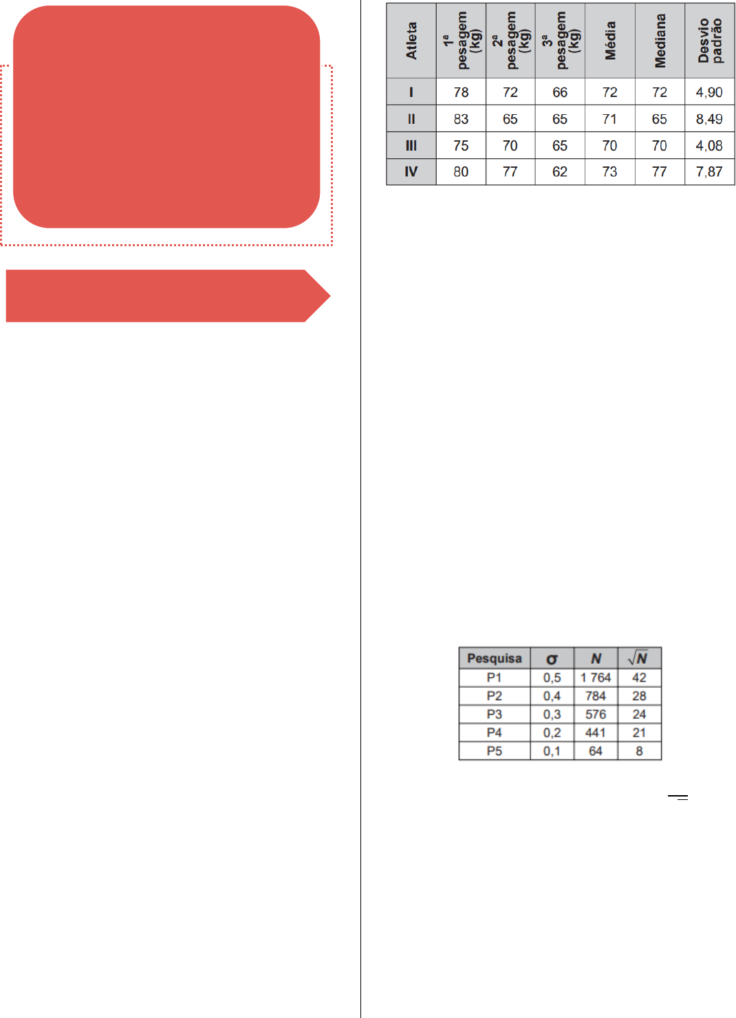 113 01 (Enem 2012) Um produtor de café irrigado em Minas Gerais recebeu um relatório de consultoria estatística, constando, entre outras informações, o desvio padrão das produções de uma safra dos talhões de sua propriedade. Os talhões têm a mesma área de 30 000 m² e o valor obtido para o desvio padrão foi de 90 kg/talhão. O produtor deve apresentar as informações sobre a produção e a variância dessas produções em sacas de 60 kg por hectare (10 000 m²). A variância das produções dos talhões expressa em (sacas/hectare)² é: A) 20,25. B) 4,50. C) 0,71. D) 0,50. E) 0,25. 02 (Enem 2016) O procedimento de perda rápida de “peso” é comum entre os atletas dos esportes de combate. Para participar de um torneio, quatro atletas da categoria até 66 kg, Peso-Pena, foram submetidos a dietas balanceadas e atividades físicas. Realizaram três “pesagens” antes do início do torneio. Pelo regulamento do torneio, a primeira luta deverá ocorrer entre o atleta mais regular e o menos regular quanto aos “pesos”. As informações com base nas pesagens dos atletas estão no quadro. Após as três “pesagens”, os organizadores do torneio informaram aos atletas quais deles se enfrentariam na primeira luta. A primeira luta foi entre os atletas A) I e III B) I e IV C) II e III D) II e IV E) III e IV 03 (Enem 2017) Um instituto de pesquisas eleitorais recebe uma encomenda na qual a margem de erro deverá ser de, no máximo, 2 pontos percentuais (0,02). O instituto tem 5 pesquisas recentes, P1 a P5, sobre o tema objeto da encomenda e irá usar a que tiver o erro menor que o pedido. Os dados sobre as pesquisas são os seguintes: O erro 𝑒 pode ser expresso por |𝑒|