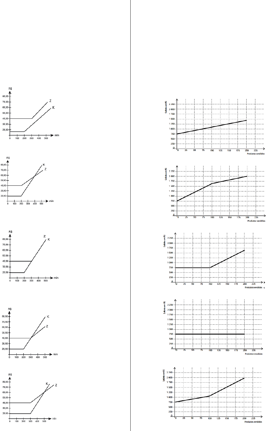 134 03 (Enem 2011) Uma empresa de telefonia fixa oferece dois planos aos seus clientes: no plano K, o cliente paga R$ 29,90 por 200 minutos mensais e R$ 0,20 por cada minuto excedente; no plano Z, paga R$ 49,90 por 300 minutos mensais e R$ 0,10 por cada minuto excedente. O gráfico que representa o valor pago, em reais, nos dois planos em função dos minutos utilizados é: A) B) C) D) E) 04 (Enem 2012) Certo vendedor tem seu salário mensal calculado da seguinte maneira: ele ganha um valor fixo de R$ 750,00, mais uma comissão de R$ 3,00 para cada produto vendido. Caso ele venda mais de 100 produtos, sua comissão passa a ser de R$ 9,00 para cada produto vendido, a partir do 101º produto vendido. Com essas informações, o gráfico que melhor representa a relação entre salário e o número de produtos vendidos é A) B) C) D) E) 135 05 (Enem 2012) Existem no mercado chuveiros elétricos de diferentes potências, que representam consumos e custos diversos. A potência (P) de um chuveiro elétrico é dada pelo produto entre sua resistência elétrica (R) e o quadrado da corrente elétrica (i) que por ele circula. O consumo de energia elétrica (E), por sua vez, é diretamente proporcional à potência do aparelho. Considerando as características apresentadas, qual dos gráficos a seguir representa a relação entre a energia consumida (E) por um chuveiro elétrico e a corrente elétrica (i) que circula por ele? A) B) C) D) E) 06 (Enem 2011) O saldo de contratações no mercado formal no setor varejista da região metropolitana de São Paulo registrou alta. Comparando as contratações deste setor no mês de fevereiro com as de janeiro deste ano, houve incremento de 4 300 vagas no setor, totalizando 880 605 trabalhadores com carteira assinada. Disponível em: http://www.folha.uol.com.br. Acesso em: 26 abr. 2010 (adaptado). Considerando-se que y e x representam, respectivamente, as quantidades de trabalhadores no setor varejista e os meses, janeiro sendo o primeiro, fevereiro, o segundo, e assim por diante, a expressão algébrica que relaciona essas quantidades nesses meses é: A) y = 4 300x B) y = 884 905x C) y = 872 005 + 4 300x D) y = 876 305 + 4 300x E) y = 880 605 + 4 300x 07 (Enem 2013) A parte interior de uma taça foi gerada pela rotação de uma parábola em torno de um eixo z, conforme mostra a figura. A função real que expressa a parábola, no plano cartesiano da figura, é dada pela lei 𝑓(𝑥) = 3 2 𝑥² − 6𝑥 + 𝐶 onde C é a medida da altura do líquido contido na taça, em centímetros. Sabe-se que o ponto V, na figura, representa o vértice da parábola, localizado sobre o eixo x. Nessas condições, a altura do líquido contido na taça, em centímetros, é: A) 1 B) 2 C) 4 D) 5 E) 6 136 08 (Enem 2014) A figura mostra uma criança brincando em um balanço no parque. A corda que prende o assento do balanço ao topo do suporte mede 2 metros. A criança toma cuidado para não sofrer um acidente, então se balança de modo que a corda não chegue a alcançar a posição horizontal. Na figura, considere o plano cartesiano que contém a trajetória do assento do balanço, no qual a origem está localizada no topo do suporte do balanço, o eixo X é paralelo ao chão do parque, e o eixo Y tem orientação positiva para cima. A curva determinada pela trajetória do assento do balanço é parte do gráfico da função: A) 𝑓(𝑥) = −√2 − 𝑥² B) 𝑓(𝑥) = √2 − 𝑥² C) 𝑓(𝑥) = 𝑥² − 2 D) 𝑓(𝑥) = −√4 − 𝑥² E) 𝑓(𝑥) = √4 − 𝑥² 09 (Enem 2019) Uma empresa tem diversos funcionários. Um deles é o gerente, que recebe R$ 1 000,00 por semana. Os outros funcionários são diaristas. Cada um deles trabalha 2 dias por semana, recebendo R$ 80,00 por dia trabalhado. Chamando de X a quantidade total de funcionários da empresa, a quantia Y, em reais, que esta empresa gasta semanalmente para pagar seus funcionários é expressa por A) 𝑌 = 80𝑋 + 920. B) 𝑌 = 80𝑋 + 1 000. C) 𝑌 = 80𝑋 + 1 080. D) 𝑌 = 160𝑋 + 840. E) 𝑌 = 160𝑋 + 1 000. 10 (Enem 2013) Durante uma aula de Matemática, o professor sugere aos alunos que seja fixado um sistema de coordenadas cartesianas (x, y) e representa na lousa a descrição de cinco conjuntos algébricos, I, II, III, IV e V, como se segue: I — é a circunferência de equação x 2 + y 2 = 9; II — é a parábola de equação y = − x 2 − 1, com x variando de −1 a 1; III — é o quadrado formado pelos vértices (−2, 1), (−1, 1), (−1, 2) e (−2, 2); IV — é o quadrado formado pelos vértices (1, 1), (2, 1), (2, 2) e (1, 2); V — é o ponto (0, 0). A seguir, o professor representa corretamente os cinco conjuntos sobre uma mesma malha quadriculada, composta de quadrados com lados medindo uma unidade de comprimento, cada, obtendo uma figura. Qual destas figuras foi desenhada pelo professor? A) B)