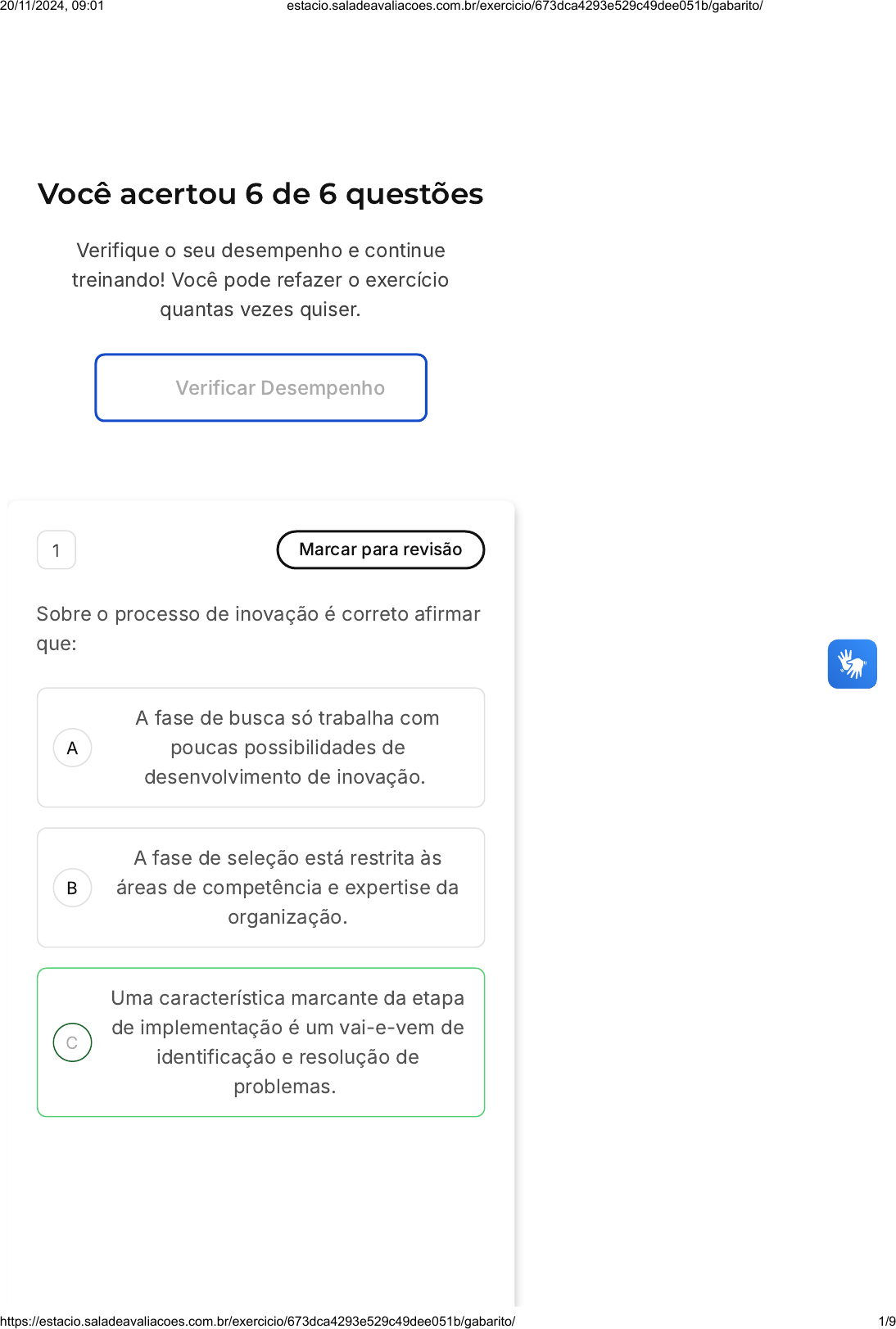 Você acertou 6 de 6 questões Verifique o seu desempenho e continue treinando! Você pode refazer o exercício quantas vezes quiser. Verificar Desempenho A B C 1 Marcar para revisão Sobre o processo de inovação é correto afirmar que: A fase de busca só trabalha com poucas possibilidades de desenvolvimento de inovação. A fase de seleção está restrita às áreas de competência e expertise da organização. Uma característica marcante da etapa de implementação é um vai-e-vem de identificação e resolução de problemas. 20/11/2024, 09:01 estacio.saladeavaliacoes.com.br/exercicio/673dca4293e529c49dee051b/gabarito/ https://estacio.saladeavaliacoes.com.br/exercicio/673dca4293e529c49dee051b/gabarito/ 1/9 D E A B C A fase de seleção está concentrada em colher os frutos financeiros da inovação implementada. Os problemas são resolvidos antes da fase de implementação. Resposta correta Parabéns, você selecionou a alternativa correta. Confira o gabarito comentado! Gabarito Comentado A resposta correta é: Uma característica marcante da etapa de implementação é um vai-e-vem de identificação e resolução de problemas. 2 Marcar para revisão Qual a principal função das patentes? Proteger os direitos de criação de trabalhos científicos, industriais, artísticos e literários. Proteger o direito de expropriação de segredos industriais. Captar recursos para o governo através de impostos. 20/11/2024, 09:01 estacio.saladeavaliacoes.com.br/exercicio/673dca4293e529c49dee051b/gabarito/ https://estacio.saladeavaliacoes.com.br/exercicio/673dca4293e529c49dee051b/gabarito/ 2/9 D E Dar titulação aos conhecimentos dos profissionais de uma empresa. Impedir o acesso a inovações científicas. Resposta correta Parabéns, você selecionou a alternativa correta. Confira o gabarito comentado! Gabarito Comentado A principal função das patentes é proteger os direitos de criação de trabalhos científicos, industriais, artísticos e literários. Isso significa que o detentor da patente tem o direito exclusivo de produzir, usar, vender ou importar a invenção ou processo patenteado por um período determinado, geralmente 20 anos. Isso incentiva a inovação, pois oferece um incentivo para os inventores investirem tempo, esforço e dinheiro em novas invenções, sabendo que eles terão o direito exclusivo de lucrar com sua invenção durante o período de validade da patente. 3 Marcar para revisão Sobre as vantagens do trabalho em equipe, é correto afirmar que: 20/11/2024, 09:01 estacio.saladeavaliacoes.com.br/exercicio/673dca4293e529c49dee051b/gabarito/ https://estacio.saladeavaliacoes.com.br/exercicio/673dca4293e529c49dee051b/gabarito/ 3/9 A B C D E A pressão social para o consenso e uniformidade de opiniões pode favorecer as contribuições individuais e levar a soluções de qualidade maior. Existem mais oportunidades de criar e melhorar ideias na interação de colegas de trabalho. Pessoas se tornam mais responsáveis por suas escolhas quando estão em um grupo. A competição por ideias é sempre saudável ao processo inovador. Quanto maior a equipe, mais ideias são geradas. Resposta correta Parabéns, você selecionou a alternativa correta. Confira o gabarito comentado! Gabarito Comentado A alternativa correta é a que afirma que existem mais oportunidades de criar e melhorar ideias na interação de colegas de trabalho. Isso ocorre porque, em um ambiente de trabalho em equipe, há uma maior troca de experiências e conhecimentos, o que favorece a geração de novas ideias e aprimoramento das já existentes. Além disso, a diversidade de 20/11/2024, 09:01 estacio.saladeavaliacoes.com.br/exercicio/673dca4293e529c49dee051b/gabarito/ https://estacio.saladeavaliacoes.com.br/exercicio/673dca4293e529c49dee051b/gabarito/ 4/9 A B C D E opiniões e perspectivas pode levar a soluções mais inovadoras e eficazes. 4 Marcar para revisão O processo de inovação envolve quatro etapas que devem ser gerenciadas para melhores resultados. Sobre esse tema, assinale a alternativa que corresponde à etapa de seleção. É a primeira fase da inovação e envolve a identificação de oportunidades de mudança. Fase em que ocorre a escolha de quais ideias irão seguir adiante. Fase em que a ideia é desenvolvida e deve envolver o usuário o mais cedo possível. Fase em que a empresa colhe os frutos da inovação. Fase onde todas as ideias são aceitas sem restrição. Resposta correta Parabéns, você selecionou a alternativa correta. Confira o gabarito comentado! Gabarito Comentado Questão 6 de 6 Corretas �6� Em branco �0� 1 2 3 4 5 6 Exercicio Inovação Sair 20/11/2024, 09:01 estacio.saladeavaliacoes.com.br/exercicio/673dca4293e529c49dee051b/gabarito/ https://estacio.saladeavaliacoes.com.br/exercicio/673dca4293e529c49dee051b/gabarito/ 5/9 A B C A etapa de seleção é a fase do processo de inovação em que ocorre a escolha de quais ideias irão prosseguir. Esta fase é crucial, pois é nela que se decide quais ideias têm potencial para serem transformadas em decisões estratégicas. De todas as soluções propostas na etapa anterior, é necessário selecionar a que será levada adiante. Portanto, a alternativa correta é a que descreve adequadamente essa etapa do processo de inovação. 5 Marcar para revisão O processo de inovação envolve quatro etapas que devem ser gerenciadas para melhores resultados. Sobre esse tema, assinale a alternativa que corresponde à etapa de busca. É a primeira fase da inovação e envolve a identificação de oportunidades de mudança. Fase em que ocorre a escolha de quais ideias irão seguir adiante. Fase em que a ideia é desenvolvida e deve envolver o usuário o mais cedo possível. 20/11/2024, 09:01 estacio.saladeavaliacoes.com.br/exercicio/673dca4293e529c49dee051b/gabarito/ https://estacio.saladeavaliacoes.com.br/exercicio/673dca4293e529c49dee051b/gabarito/ 6/9 D E Fase em que a empresa colhe os frutos da inovação. Fase em que a empre
