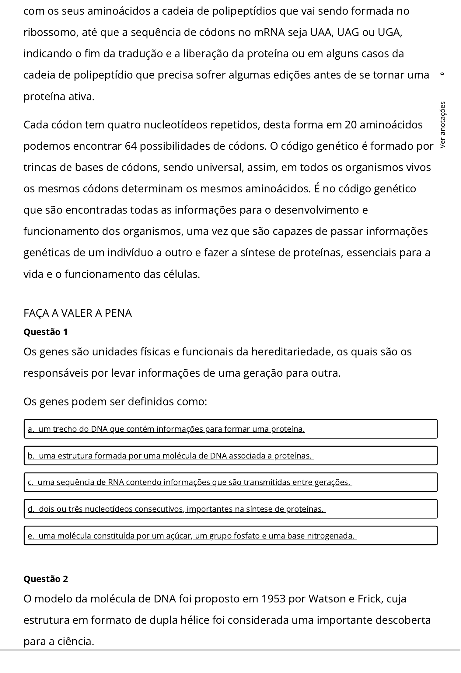 com os seus aminoácidos a cadeia de polipeptídios que vai sendo formada no ribossomo, até que a sequência de códons no mRNA seja UAA, UAG ou UGA, indicando o �m da tradução e a liberação da proteína ou em alguns casos da cadeia de polipeptídio que precisa sofrer algumas edições antes de se tornar uma proteína ativa. Cada códon tem quatro nucleotídeos repetidos, desta forma em 20 aminoácidos podemos encontrar 64 possibilidades de códons. O código genético é formado por trincas de bases de códons, sendo universal, assim, em todos os organismos vivos os mesmos códons determinam os mesmos aminoácidos. É no código genético que são encontradas todas as informações para o desenvolvimento e funcionamento dos organismos, uma vez que são capazes de passar informações genéticas de um indivíduo a outro e fazer a síntese de proteínas, essenciais para a vida e o funcionamento das células. FAÇA A VALER A PENA Questão 1 Os genes são unidades físicas e funcionais da hereditariedade, os quais são os responsáveis por levar informações de uma geração para outra. Os genes podem ser de�nidos como: a. um trecho do DNA que contém informações para formar uma proteína. b. uma estrutura formada por uma molécula de DNA associada a proteínas. c. uma sequência de RNA contendo informações que são transmitidas entre gerações. d. dois ou três nucleotídeos consecutivos, importantes na síntese de proteínas. e. uma molécula constituída por um açúcar, um grupo fosfato e uma base nitrogenada. Questão 2 O modelo da molécula de DNA foi proposto em 1953 por Watson e Frick, cuja estrutura em formato de dupla hélice foi considerada uma importante descoberta para a ciência. 0 V e r a n o ta çõ e s Neste contexto, analise o trecho a seguir: A molécula de DNA consiste em duas cadeias de __________, que formam a dupla hélice. As �tas são complementares, unidas por __________, formando pares de bases. As bases que têm um duplo anel de átomo de carbono são conhecidas por __________ e são compostas pela __________ e guanina. Já as bases que têm um único anel simples, são as __________, compostas pela citosina e __________. (GARCIA; MACEDO, 2007). Assinale a alternativa que completa as lacunas corretamente. a. proteínas / nucleotídeos / purinas / timina / pirimidinas / adenina. b. nucleotídeos / pentoses / pirimidinas / timina / purinas / adenina. c. carboidratos / pontes de hidrogênio / purinas / adenina / pirimidinas / uracila. d. nucleotídeos / pontes de hidrogênio / purinas / adenina / pirimidinas / timina. e. cromossomos / proteínas / pirimidinas / adenina / purinas / timina. Questão 3 A proteína é considerada uma das macromoléculas essenciais para a manutenção dos organismos. A síntese de proteínas é um processo no qual são produzidas proteínas através das células e, para isso, participam do processo biológico o DNA da célula, os três tipos de RNA (ribossômico, mensageiro e transportador), os ribossomos e algumas enzimas e aminoácidos. Assinale a alternativa correta em relação à síntese de proteínas. a. O mecanismo de síntese proteica ocorre em todas as células sem gasto de energia. b. Na etapa de transcrição ocorre a produção de uma molécula de RNA a partir de uma molécula de DNA utilizada como molde. c. A síntese de proteínas inclui a etapa de transcrição e tradução, as quais ocorrem no núcleo. d. A transcrição pode ocorrer tanto nos ribossomos livres (citoplasma) quanto nos ribossomos ligados (retículo endoplasmático). e. O RNA mensageiro tem um anticódon, enquanto o RNA transportador tem um códon para a transcrição da proteína. 0 V e r a n o ta çõ e s