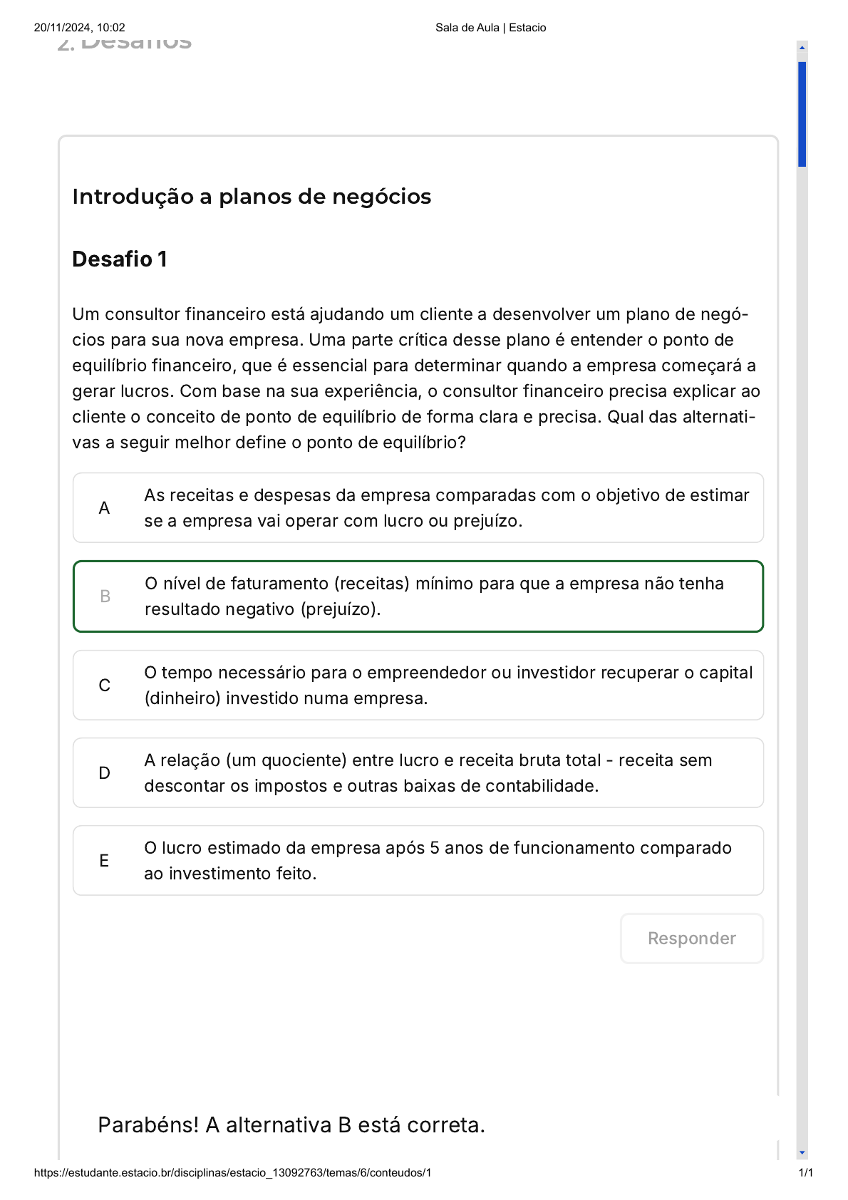 2.Desa�os Introdução a planos de negócios Desafio 1 Um consultor financeiro está ajudando um cliente a desenvolver um plano de negó- cios para sua nova empresa. Uma parte crítica desse plano é entender o ponto de equilíbrio financeiro, que é essencial para determinar quando a empresa começará a gerar lucros. Com base na sua experiência, o consultor financeiro precisa explicar ao cliente o conceito de ponto de equilíbrio de forma clara e precisa. Qual das alternati- vas a seguir melhor define o ponto de equilíbrio? A As receitas e despesas da empresa comparadas com o objetivo de estimar se a empresa vai operar com lucro ou prejuízo. B O nível de faturamento (receitas) mínimo para que a empresa não tenha resultado negativo (prejuízo). C O tempo necessário para o empreendedor ou investidor recuperar o capital (dinheiro) investido numa empresa. D A relação (um quociente) entre lucro e receita bruta total - receita sem descontar os impostos e outras baixas de contabilidade. E O lucro estimado da empresa após 5 anos de funcionamento comparado ao investimento feito. Parabéns! A alternativa B está correta. Responder 20/11/2024, 10:02 Sala de Aula | Estacio https://estudante.estacio.br/disciplinas/estacio_13092763/temas/6/conteudos/1 1/1