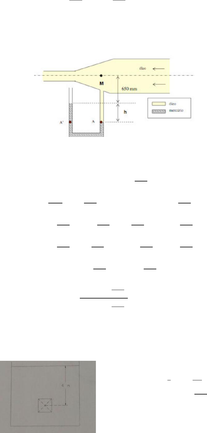 1 𝑎𝑡𝑚 = 760 𝑚𝑚ℎ𝑔 = 1 𝑘𝑔𝑓 𝑐𝑚2 = 10000 𝑘𝑔𝑓 𝑚2 = 1 𝑏𝑎𝑟 = 100 𝑐𝑏𝑎𝑟 = 100 𝑚𝑚𝑏𝑎𝑟 = 100000 𝑃𝑎 = 100 𝐾𝑝𝑎 = 14,7 𝑃𝑠𝑖 = 10 𝑚𝑐𝑎 1. Um óleo (γ = 880 kgf/m³) passa pelo conduto da figura abaixo. Um manômetro de mercúrio, (γ = 13600 kgf/m³) ligado ao conduto, apresenta a deflexão indicada. A pressão efetiva em M é de 20 mca. Obter h. 650𝑚𝑚 = 0,65𝑚 20𝑚𝑐𝑎 = 20000 𝑘𝑔𝑓 𝑚2 20000 𝑘𝑔𝑓 𝑚2 + 880 𝑘𝑔𝑓 𝑚3 ∗ (0,65𝑚 + ℎ𝑚) = 13600 𝑘𝑔𝑓 𝑚3 ∗ ℎ 20000 𝑘𝑔𝑓 𝑚2 + 880 ℎ 𝑘𝑔𝑓 𝑚3 + 572 𝑘𝑔𝑓 𝑚2 = 13600 ℎ 𝑘𝑔𝑓 𝑚3 20000 𝑘𝑔𝑓 𝑚2 + 572 𝑘𝑔𝑓 𝑚2 = 13600 ℎ 𝑘𝑔𝑓 𝑚3 − 880 ℎ 𝑘𝑔𝑓 𝑚3 20572 𝑘𝑔𝑓 𝑚2 = 12720 ℎ 𝑘𝑔𝑓 𝑚3 ℎ = (20572 ℎ 𝑘𝑔𝑓 𝑚2 ) (12720 ℎ 𝑘𝑔𝑓 𝑚3 ) = 1,617 𝑚 𝒉 = 𝟏, 𝟔𝟏𝟕𝒎 2. Que dimensões deve ter o orifício quadrado da figura abaixo para fornecer uma vazão de 500 l/s? (Dado - cd = 0,61). 500 𝑙 𝑠 = 0,5 𝑚3 𝑠 𝑄 = 𝑐𝑑 ∗ 𝐴 ∗ √2𝑔ℎ A = Q (cd ∗ √2𝑔ℎ) 𝐴 = (0,5 𝑚3 𝑠 ) 0,61∗√2∗9,81 𝑚 𝑠2 ∗4𝑚 Logo. 𝐴 = (0,5 𝑚3 𝑠 ) 0,61∗8,86 𝑚 𝑠2 Logo. 𝐴 = 0,092 𝑚2 logo. 𝐿 = 𝐴, sendo assim 𝐿 = √0,092 𝑪𝒐𝒏𝒄𝒍𝒖𝒊 𝒆𝒏𝒕ã𝒐 𝒒𝒖𝒆 𝑳 = 𝟎, 𝟑𝟎𝟑 ∗ 𝟎, 𝟑𝟎𝟑 𝒎 𝒐𝒖 𝟑𝟎, 𝟑 ∗ 𝟑𝟎, 𝟑 𝒄𝒎 3. Um manômetro em U é fixado a um reservatório fechado contendo três fluidos diferentes como mostra a Figura abaixo. A pressão (relativa) do ar no reservatório é igual a 30 kPa. A densidade do óleo (γ = 820 kgf/m³) e a da água de 1000 kgf/m³. Determine qual será a elevação da coluna de mercúrio do manômetro. 30 𝐾𝑝𝑎 = 30000 𝑝𝑎 30000 𝑝𝑎 + (820 𝑘𝑔𝑓 𝑚3 ∗ (5 − 2 𝑚) ∗ 9,81 𝑚 𝑠2 ) + (1000 𝑘𝑔𝑓 𝑚3 ∗ (2 − 0 + 1 𝑚) ∗ 9,81 𝑚 𝑠2 ) = 13600 𝑘𝑔𝑓 𝑚3 ∗ 𝑦 𝑚 ∗ 9,81 𝑚 𝑠2 30000 𝑝𝑎 + 24132,6 𝑝𝑎 + 29430 𝑝𝑎 = 133416 𝑘𝑔𝑓/𝑚 ∗ 𝑦 83562,6 𝑝𝑎 = 133416 𝑦 𝑘𝑔𝑓/𝑚 𝑦 = 83562,6 𝑝𝑎 (133416 𝑘𝑔𝑓/𝑚) = 𝟎, 𝟔𝟐𝟔 𝒎 𝒐𝒖 𝟔𝟐, 𝟔 𝒄𝒎 4. Considerar que a água escoa no sentido vertical descendente, em um tubo tronco- cônico de 1,83 m de altura. As extremidades superior e inferior do tubo têm os diâmetros de 150 mm e 75 mm, respectivamente. Se a vazão é de 30 L/s, achar a diferença de pressão entre as extremidades do tubo. 𝐴1 = 𝜋 ∗ 𝐷2 4 𝐴2 = 𝜋 ∗ 𝐷2 4 𝑣 = 𝑄 𝐴 𝑣1 = (0,03 𝑚3 𝑠 ) ( 𝜋 ∗ (0,15𝑚)² 4 ) = 1,7 𝑚/𝑠 𝑣2 = (0,03 𝑚3 𝑠 ) ( 𝜋 ∗ (0,075𝑚)² 4 ) = 6,79 𝑚/𝑠 𝑝1 𝛾 + 𝑣12 2 ∗ 𝑔 + ℎ1 = 𝑝2 𝛾 + 𝑣22 2 ∗ 𝑔 + ℎ2 𝑝1 𝛾 − 𝑝2 𝛾 𝑜𝑢 ∆𝑝 𝛾 = (( 𝑣22 − 𝑣12 2 ∗ 𝑔 )) + ℎ2 − ℎ1 𝑉22 = 6,792 = 46,10 𝑚2 𝑠2 𝑉1² = 1,72 = 2,89 𝑚2 𝑠2 𝑝1 𝛾 − 𝑝2 𝛾 𝑜𝑢 ∆𝑝 𝛾 = ( ( 46,10 𝑚2 𝑠2 − 2,89 𝑚2 𝑠2 2 ∗ 9,81 𝑚 𝑠2 ) ) + 1,83𝑚 − 0𝑚 ∆𝑝 𝛾 = ( ( 46,10 𝑚2 𝑠2 − 2,89 𝑚2 𝑠2 2 ∗ 9,81 𝑚 𝑠2 )+ 1,83𝑚 ) 𝛾 = 𝜌 ∗ 𝑔 → 𝛾 = 1000 𝑘𝑓𝑔 𝑚3 ∗ 9,81 𝑚 𝑠2 → 𝛾 = 9810 𝑁/𝑚³ ∆𝑝 = ( ( 46,10 𝑚2 𝑠2 − 2,89 𝑚2 𝑠2 2 ∗ 9,81 𝑚 𝑠2 )+ 1,83𝑚 ) ∗ 9810𝑁/𝑚³ ∆𝑝 = 4,032 𝑚 ∗ 9810 𝑁 𝑚3 ∆𝒑 = 𝟑𝟗𝟓𝟓𝟔, 𝟑 𝒑𝒂 𝒐𝒖 𝟑𝟗, 𝟓𝟓 𝒌𝒑𝒂 5. Um bocal à extremidade de uma mangueira plástica, como mostra a figura 4, fornece uma vazão de 1,0 l/s. Calcule: Despreze a perda localizada na saída do reservatório. Despreze a energia cinética apenas quando o bocal for retirado. Mangueira: L = 30 m, D = 30 mm, Bocal: D = 10 mm, cc = 0,95, cv = 0,90 a) A altura do nível da água no reservatório (despreze as perdas). 𝑝1 𝛾 + 𝑣12 2 ∗ 𝑔 + ℎ1 = 𝑝2 𝛾 + 𝑣22 2 ∗ 𝑔 + ℎ2 0 + 0 + ℎ1 = 0 + 𝑣22 2 ∗ 𝑔 + 0 ℎ1 = 𝑣22 2 ∗ 𝑔 𝑣 = 𝑄 𝐴 → 𝑣 = 0,001 𝑚3 𝑠 𝜋 ∗ (0,01𝑚)2 4 → 𝑣 = 0,001 𝑚3 𝑠 0,00007854 𝑚2 → 𝑣 = 12,732 𝑚 𝑠 ℎ1 = 𝑣22 2 ∗ 𝑔 → ℎ1 = (12,732 𝑚 𝑠 ) 2 19,62 𝑚 𝑠2 → ℎ1 = 8,26 𝑚 ℎ1 = (0,001 𝑚 𝑠 )² 19,62 𝑚/𝑠² → ℎ1 = 𝟖, 𝟐𝟔 𝒎 b) A pressão efetiva num ponto imediatamente junto ao bocal (A). 𝑝 = 𝜌 ∗ 𝑔 ∗ ℎ 𝑝 = 1000 𝑘𝑔𝑓 𝑚3 ∗ 9,81 𝑚 𝑠2 ∗ 8,26𝑚 𝑝 = 𝟖𝟏𝟎𝟑𝟎, 𝟔 𝒑𝒂 𝒐𝒖 𝟖𝟏, 𝟎𝟑 𝒌𝒑𝒂 c) A nova vazão, quando o bocal for retirado de extremidade da mangueira 𝑄 = 𝑐𝑑 ∗ 𝐴 ∗ √2𝑔ℎ 𝐶𝑑 = 𝐶𝑐 ∗ 𝑐𝑣 → 𝐶𝑑 = 0,95 ∗ 0,90 → 𝐶𝑑 = 0,855 𝐴 = 𝜋 ∗ 𝐷2 4 → 𝐴 = 𝜋 ∗ (0,03 𝑚)2 4 → 0,0007069 𝑚2 𝑄 = 0,855 ∗ 0,0007069 𝑚² ∗ √2 ∗ 9,81 𝑚 𝑠2 ∗ 8,26𝑚 → 𝑸 = 𝟎, 𝟎𝟎𝟕𝟕 𝒎𝟑/𝒔 C) A velocidade da água para as duas situações (com e sem bocal) e o número de Reynoalds 𝑉 = 𝑄/𝐴 𝐴 = 𝜋 ∗ 𝐷2 4 → 𝐴 = 𝜋 ∗ (0,01𝑚)2 4 → 0,0000785 𝑚2 𝑉 = 0,001 𝑚3 𝑠 0,0000785 𝑚² = 𝟏𝟐, 𝟕𝟑 𝒎 𝒔 𝒄𝒐𝒎 𝒃𝒐𝒄𝒂𝒍 𝐴 = 𝜋 ∗ 𝐷2 4 → 𝐴 = 𝜋 ∗ (0,03 𝑚)2 4 → 0,0007069 𝑚2 𝑉 = 0,0077 𝑚3 𝑠 0,0007069 𝑚² = 𝟏𝟎, 𝟖𝟗 𝒎 𝒔 𝒔𝒆𝒎 𝒐 𝒃𝒐𝒄𝒂𝒍 𝑅𝑒𝑦 = 𝑣 ∗ 𝐷 𝜇 𝑅𝑒𝑦 = 12,73 𝑚 𝑠 ∗ 0,01 𝑚 1,02 ∗ 10−6 𝑅𝑒𝑦 = 0,1273 𝑚2/𝑠 1,02 ∗ 10−6 𝑚2/𝑠 → 𝑹𝒆𝒚 = 𝟏𝟐𝟒𝟖𝟎𝟑, 𝟗𝟐 𝒕𝒖𝒓𝒃𝒖𝒍𝒆𝒏𝒕𝒐 06. Um sistema de abastecimento de