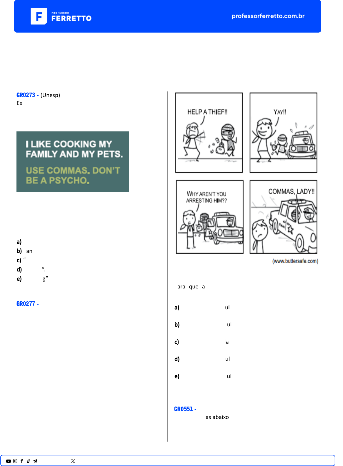 Não respondidas Vestibulares Pontuação GR0273 - (Unesp) Examine o meme publicado pela comunidade “The Language Nerds” em sua conta no Instagram em 28.02.2020. Para se evitar o qualifica�vo de “psicopata”, seria aconselhável seguir a recomendação do meme e inserir uma vírgula logo após a) “I”. b) “and”. c) “like”. d) “family”. e) “cooking”. GR0277 - (Unesp) Para que a história �vesse um desfecho favorável à garota, seria necessário a) inserir uma vírgula após “Help” (1º quadrinho) e suprimir a vírgula após “Commas” (4º quadrinho). b) inserir uma vírgula após “Help” (1º quadrinho), apenas. c) suprimir a vírgula após “Commas” (4º quadrinho), apenas. d) inserir uma vírgula após “Why” (3º quadrinho) e suprimir a vírgula após “Commas” (4º quadrinho). e) inserir uma vírgula após “Why” (3º quadrinho), apenas. GR0551 - (Eear) As alterna�vas abaixo compõem um texto. Assinale a que apresenta um erro de pontuação. 1@professorferretto @prof_ferretto a) Em 2005, Marisa Lajolo revelou ao país um lado desconhecido de Monteiro Lobato: o sen�mental. b) Ela escreveu um livro que reúne postais enviados por Lobato a Purezinha, sua noiva e futura esposa. c) Numa época em que a internet não exis�a, os cartões- postais foram durante dois anos, o principal veículo de comunicação entre eles. d) Esses cartões, cuja leitura é prazerosa por si só, são também um importante registro de como os jovens namoravam no início do século XX. GR0244 - (Uel) Leia a crônica a seguir, de Luis Fernando Veríssimo. Ser um �mido notório é uma contradição. O �mido tem horror a ser notado, quanto mais a ser notório. Se ficou notório por ser �mido, então tem que se explicar. Afinal, que retumbante �midez é essa, que atrai tanta atenção? Se ficou notório apesar de ser �mido, talvez es�vesse se enganando junto com os outros e sua �midez seja apenas um estratagema para ser notado. Tão secreto que nem ele sabe. É como no paradoxo psicanalí�co: só alguém que se acha muito superior procura o analista para tratar um complexo de inferioridade, porque só ele acha que se sen�r inferior é doença. Todo mundo é �mido, os que parecem mais �midos são apenas os mais salientes. Defendo a tese de que ninguém é mais �mido do que o extrover�do. O extrover�do faz questão de chamar atenção ̲ para sua extroversão, assim ninguém descobre sua �midez. Já no notoriamente �mido a �midez que usa ̲para disfarçar sua extroversão tem o tamanho de um carro alegórico. Daqueles que sempre quebram na concentração. Segundo minha tese, dentro de cada Elke Maravilha existe um �mido tentando se esconder e dentro de cada �mido existe um exibido gritando “Não me olhem! Não me olhem!”, só para chamar a atenção. O �mido nunca tem a menor dúvida de que, quando entra numa sala, todas as atenções se voltam para ele e para sua �midez espetacular. Se cochicham, é sobre ele. Se riem, é dele. Mentalmente, o �mido nunca entra num lugar. Explode no lugar, mesmo que chegue com a maciez estudada de uma noviça. Para o �mido, não apenas todo mundo mas o próprio des�no não pensa em outra coisa a não ser nele e no que pode fazer para embaraçá-lo. O �mido vive acossado pela catástrofe possível. Vai tropeçar e cair e levar junto a anfitriã. Vai ser acusado do que não fez, vai descobrir que estava com a braguilha aberta o tempo todo. E tem certeza de que cedo ou tarde vai acontecer o que o �mido mais teme, o que �ra o seu sono e apavora os seus dias: alguém vai lhe passar a palavra. O �mido tenta se convencer de que só tem problemas com mul�dões, mas isto não é vantagem. Para o �mido, duas pessoas são uma mul�dão. Quando não consegue escapar e se vê diante de uma plateia, o �mido não pensa nos membros da plateia como indivíduos. Mul�plica-os por quatro, pois cada indivíduo tem dois olhos e dois ouvidos. Quatro vias, portanto, para receber suas gafes. Não adianta pedir para a plateia fechar os olhos, ou tapar um olho e um ouvido para cortar o desconforto do �mido pela metade. Nada adianta. O �mido, em suma, é uma pessoa convencida de que é o centro do Universo, e que seu vexame ainda será lembrado quando as estrelas virarem pó. (VERISSIMO, Luis Fernando. Da Timidez. In: Comédias para se ler na escola. Rio de Janeiro: Obje�va, 2001. p. 111-112.) Sobre o trecho “E tem certeza de que cedo ou tarde vai acontecer o que o �mido mais teme, o que �ra o seu sono e apavora os seus dias: alguém vai lhe passar a palavra”, assinale a alterna�va que subs�tui, corretamente, os dois pontos, sem alterar o sen�do original. a) Isto é. b) Nesse sen�do. c) Afinal. d) Por conseguinte. e) Até que. GR0353 - (Uerj) COM O OUTRO NO CORPO, O ESPELHO PARTIDO O que acontece com o sen�mento de iden�dade de uma pessoa que se depara, diante do espelho, com um rosto que não é seu? Como é possível manter a convicção razoavelmente estável que nos acompanha pela vida, a respeito do nosso ser, no caso de sofrermos uma alteração radical em nossa imagem? Perguntas como essas provocaram intenso debate a respeito da é�ca médica depois do transplante de parte da face em uma mulher que teve o rosto desfigurado por seu cachorro em Amiens, na França. Nosso sen�mento de permanência e unidade se estabelece diante do espelho, a despeito de todas as mudanças que o corpo sofre ao longo da vida. A criança humana, em um determinado estágio de maturação, iden�fica-se com sua imagem no espelho. Nesse caso, um transplante (ainda que parcial) que altera tanto os traços feno�picos quanto as marcas da história de vida inscritas na face destruiria para sempre o sen�mento de iden�dade do transplantado? Talvez não. Ocorre que o poder do espelho – esse de vidro e aço pendurado na parede – não é tão absoluto: o espelho que importa, 