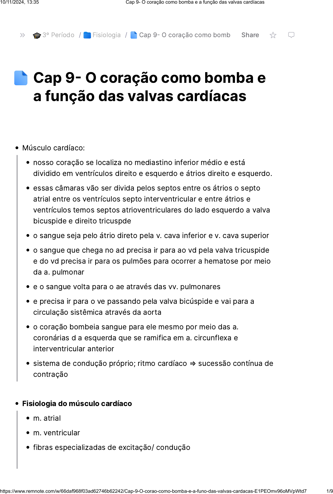 🎓3º Período Fisiologia Cap 9� O coração como bomb Share Cap 9� O coração como bomba e a função das valvas cardíacas Músculo cardíaco: nosso coração se localiza no mediastino inferior médio e está dividido em ventrículos direito e esquerdo e átrios direito e esquerdo. essas câmaras vão ser divida pelos septos entre os átrios o septo atrial entre os ventrículos septo interventricular e entre átrios e ventrículos temos septos atrioventriculares do lado esquerdo a valva bicuspide e direito tricuspde o sangue seja pelo átrio direto pela v. cava inferior e v. cava superior o sangue que chega no ad precisa ir para ao vd pela valva tricuspide e do vd precisa ir para os pulmões para ocorrer a hematose por meio da a. pulmonar e o sangue volta para o ae através das vv. pulmonares e precisa ir para o ve passando pela valva bicúspide e vai para a circulação sistêmica através da aorta o coração bombeia sangue para ele mesmo por meio das a. coronárias d a esquerda que se ramifica em a. circunflexa e interventricular anterior sistema de condução próprio; ritmo cardíaco ⇒ sucessão contínua de contração Fisiologia do músculo cardíaco m. atrial m. ventricular fibras especializadas de excitação/ condução 10/11/2024, 13:35 Cap 9- O coração como bomba e a função das valvas cardíacas https://www.remnote.com/w/66daf968f03ad62746b62242/Cap-9-O-corao-como-bomba-e-a-funo-das-valvas-cardacas-E1PEOmv96oMVpWtd7 1/9 entre uma célula e outra há uma junção do tipo gap⇒ junção comunicante discos intercalados dispostos em série ou em paralelo, para que haja uma rápida difusão de íons entre uma célula e outra a estimulação de uma célula pode fazer com que todas as outras se despolarizem, o coração trabalha como sincício sendo um sincício atrial e ventricular Potencial de ação do miocárdio O retículo sarcoplasmático do coração é pouco desenvolvido então o cálcio vem do líquido extracelular dando o caráter gráfico de platô fases da despolarização quem da o estímulo são as fibras especializada na fase 0 temos o início das despolarização abrem canais de sódio e Ca+ mas eles são mas lentos na fase 1� despolarização inicial fecham os canais de Na+ abrem canais de k+ que são canais rápidos e temos uma pequena repolarização antes de começar o platô fase 2� fecham canais de k+ rápidos e abrem canais de ca+ por completo- contração fase 3� polarização rápida fecham canais de ca+ e abrem canais de k+ lentos fase 4� termino da repolarização repouso durante a despolarização ele sai de �85mv vai até �20mv variação aproximada de 105 mv 10/11/2024, 13:35 Cap 9- O coração como bomba e a função das valvas cardíacas https://www.remnote.com/w/66daf968f03ad62746b62242/Cap-9-O-corao-como-bomba-e-a-funo-das-valvas-cardacas-E1PEOmv96oMVpWtd7 2/9 Períodos período refratário absoluto: muitas canais ativados que estão se recuperando durante esse período não é possível gerar novos potenciais pois ele está acontecendo � 0,25� 0,30s período refratário relativo: em estímulos muitos grande há possibilidade de gerar novo potencial 0,05s é no final da repolarização vemos esses fenômenos em extrasístole desfibrilador em sincronia no período refratário absoluto o coração é formado por: endocárdio miocárdio - transmural epicardio - transmural m. papilares essa despolarizações são juntas porém as repolarização é diferente a primeira repolarização acontece pelo epircadio, depois endocárdio e terceiro músculos papilares. 10/11/2024, 13:35 Cap 9- O coração como bomba e a função das valvas cardíacas https://www.remnote.com/w/66daf968f03ad62746b62242/Cap-9-O-corao-como-bomba-e-a-funo-das-valvas-cardacas-E1PEOmv96oMVpWtd7 3/9 acoplamento excitação e contração no coração nosso túbulo são maiores e que dentro no meio desses tubulos tem a proteína mucopolissacarideo e tem carga negativa e prene o cálcio dentro do túbulo T pois é onde tem a maior quantidade de canais de cálcio para que haja a entrada a maior parte do cálcio vem de fora então quando estamos no repouso a cargas positivas foras com a despolarização a inversão de cargas e cálcio entra e vai até o receptor de rianodina e estimula a estimulação da abertura do canais de cálcio do reticulo sarcoplasmático, o cálcio se une a troponina c desativa o complexo troponina-tropomiosina ⇒ contração quando começa a acontecer a repolarização e o calcío precisa ser bombeado para o retículo sarcopl e para a lec por meio da bomba de ca+ e há a entrada de sódio mas ele logo sai pela bomba nak+ atpase, e temos o relaxamento do músculo cardíaco pré-carga e pós-carga: pré-carga: a pressão final diastolica final quando o ventrículo está cheio, vai está aumentada quando estiver em um estado de hipervolemia e venodilatação pós-carga: pressão da aorta quando o sangue sai do VE e pode ser aumentada quando há vasoconstrição. energia vem principalmente vem através do metabolismo dos ácidos graxos nosso coração quando está bombeando em seu estado fisiológico, o coração é capaz de bombear de 4�6 L sangue/mim em média 5 L quando a aumento de demando o coração tem um mecanismo dele mesmo para se adaptar aos aumento de volume - mecanismo de frank-starling o SN autônomo vai atuar parassimpático - vago ach- promove uma diminuição da freq cardíaca 10/11/2024, 13:35 Cap 9- O coração como bomba e a função das valvas cardíacas https://www.remnote.com/w/66daf968f03ad62746b62242/Cap-9-O-corao-como-bomba-e-a-funo-das-valvas-cardacas-E1PEOmv96oMVpWtd7 4/9 simpático- noraepinefrina - promove o aumento da frq cardíaca ajudam a aumentar a diminuir a frequência cardíaca mas o coração não depende disso o aumento do K� em LEC � hipercalemia diminui o limiar e o coração deixa o corção flacido e dilatado o aumento do ca+ aumenta a contração ⇒ contração espasticas arritmias (fa) t