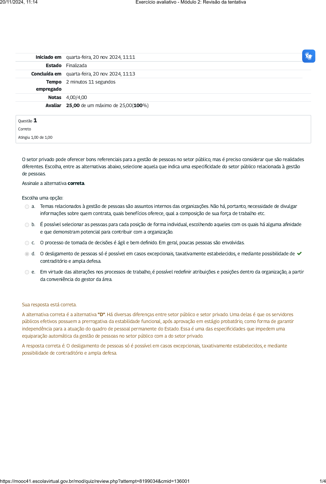 Iniciado em quarta-feira, 20 nov. 2024, 11:11 Estado Finalizada Concluída em quarta-feira, 20 nov. 2024, 11:13 Tempo empregado 2 minutos 11 segundos Notas 4,00/4,00 Avaliar 25,00 de um máximo de 25,00(100%) Questão 1 Correto Atingiu 1,00 de 1,00 O setor privado pode oferecer bons referenciais para a gestão de pessoas no setor público, mas é preciso considerar que são realidades diferentes. Escolha, entre as alternativas abaixo, selecione aquela que indica uma especi�cidade do setor público relacionada à gestão de pessoas. Assinale a alternativa correta. Escolha uma opção: a. Temas relacionados à gestão de pessoas são assuntos internos das organizações. Não há, portanto, necessidade de divulgar informações sobre quem contrata, quais benefícios oferece, qual a composição de sua força de trabalho etc. b. É possível selecionar as pessoas para cada posição de forma individual, escolhendo aqueles com os quais há alguma a�nidade e que demonstram potencial para contribuir com a organização. c. O processo de tomada de decisões é ágil e bem de�nido. Em geral, poucas pessoas são envolvidas. d. O desligamento de pessoas só é possível em casos excepcionais, taxativamente estabelecidos, e mediante possibilidade de contraditório e ampla defesa. e. Em virtude das alterações nos processos de trabalho, é possível rede�nir atribuições e posições dentro da organização, a partir da conveniência do gestor da área. Sua resposta está correta. A alternativa correta é a alternativa "D". Há diversas diferenças entre setor público e setor privado. Uma delas é que os servidores públicos efetivos possuem a prerrogativa da estabilidade funcional, após aprovação em estágio probatório, como forma de garantir independência para a atuação do quadro de pessoal permanente do Estado. Essa é uma das especi�cidades que impedem uma equiparação automática da gestão de pessoas no setor público com a do setor privado. A resposta correta é: O desligamento de pessoas só é possível em casos excepcionais, taxativamente estabelecidos, e mediante possibilidade de contraditório e ampla defesa. 20/11/2024, 11:14 Exercício avaliativo - Módulo 2: Revisão da tentativa https://mooc41.escolavirtual.gov.br/mod/quiz/review.php?attempt=8199034&cmid=136001 1/4 Questão 2 Correto Atingiu 1,00 de 1,00 Considerando os desa�os do setor público relacionados à gestão de pessoas, assinale a alternativa correta. Escolha uma opção: a. Uma análise cuidadosa evidencia que os desa�os relacionados à gestão de pessoas no setor público são complexos e praticamente impossíveis de solução. Nesse sentido, é melhor direcionar esforços para solucionar desa�os em outras dimensões da gestão pública. b. Os desa�os enfrentados pela gestão de pessoas no setor público são complexos e multifacetados e, ao buscar resolvê-los, é importante levar em consideração algumas premissas, como a importância da transparência e do diálogo. c. Em geral, é preferível que as transformações no setor público ocorram de modo disruptivo. Não vale a pena conduzir mudanças graduais, já que só movimentos reformadores da macroestrutura serão capazes de produzir bons resultados. d. Uma premissa importante para lidar com os desa�os da gestão de pessoas no setor público é evitar que processos e atividades sejam desorganizados por meio da tecnologia, que tende a gerar mais problemas que soluções. e. As lideranças, em geral, possuem pouco impacto para a solução dos desa�os da gestão de pessoas no setor público, já que representam um grupo reduzido e, portanto, iniciativas que alcancem mais pessoas tendem a gerar melhores resultados. Sua resposta está correta. A resposta correta é a alternativa "B". É evidente que os desa�os relacionados à gestão de pessoas no setor público não são simples, mas há algumas premissas que podem contribuir para soluções inovadoras. Transparência e diálogo, importância do papel das lideranças, evolução gradual com ganhos incrementais e percepção da tecnologia como aliada são algumas dessas premissas. A resposta correta é: Os desa�os enfrentados pela gestão de pessoas no setor público são complexos e multifacetados e, ao buscar resolvê-los, é importante levar em consideração algumas premissas, como a importância da transparência e do diálogo. 20/11/2024, 11:14 Exercício avaliativo - Módulo 2: Revisão da tentativa https://mooc41.escolavirtual.gov.br/mod/quiz/review.php?attempt=8199034&cmid=136001 2/4 Questão 3 Correto Atingiu 1,00 de 1,00 Questão 4 Correto Atingiu 1,00 de 1,00 Considerando o modelo de organização sistêmica de gestão de pessoas na administração pública federal, assinale a alternativa correta. Escolha uma opção: a. No modelo sistêmico, a relação preferencial dos órgãos seccionais é com o órgão central e, se necessário, o órgão central realiza contato com os órgãos setoriais. b. O Sistema de Pessoal Civil da Administração Federal – SIPEC é um dos sistemas estruturantes da administração federal, enquanto o Sigepe é um dos sistemas estruturadores que dão suporte aos processos de gestão de pessoas. c. Uma das vantagens do modelo sistêmico é que soluções comuns podem ser desenvolvidas pelo órgão central, como plataformas digitais de serviços que atendam a todos os órgãos e entidades da administração pública. d. As entidades da Administração Indireta (autarquias e funções) não participam do SIPEC, uma vez que o objetivo do sistema é a coordenação da gestão de pessoas na Administração Direta. e. Criado no mesmo ano do Ministério da Economia, o SIPEC tem alcançado bons resultados, o que tende a expandir esse modelo de organização sistêmica para outras áreas da gestão pública. Sua resposta está correta. A alternativa correta é a alternativa "C". Instituído no contexto da reforma administrativa de 1967, o Sistema de Pe