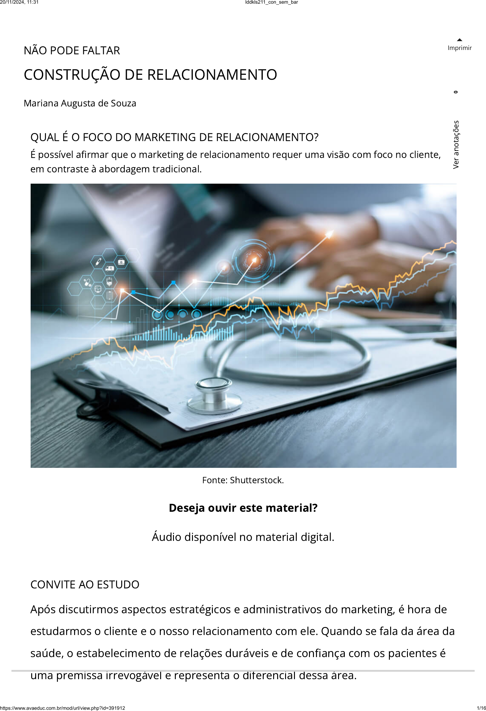 NÃO PODE FALTAR CONSTRUÇÃO DE RELACIONAMENTO Mariana Augusta de Souza Imprimir CONVITE AO ESTUDO Após discutirmos aspectos estratégicos e administrativos do marketing, é hora de estudarmos o cliente e o nosso relacionamento com ele. Quando se fala da área da saúde, o estabelecimento de relações duráveis e de con�ança com os pacientes é uma premissa irrevogável e representa o diferencial dessa área. QUAL É O FOCO DO MARKETING DE RELACIONAMENTO? É possível a�rmar que o marketing de relacionamento requer uma visão com foco no cliente, em contraste à abordagem tradicional. Fonte: Shutterstock. Deseja ouvir este material? Áudio disponível no material digital. 0 V e r a n o ta çõ e s 20/11/2024, 11:31 lddkls211_con_sem_bar https://www.avaeduc.com.br/mod/url/view.php?id=391912 1/16 Na relação do pro�ssional com o paciente não se busca necessariamente o lucro por parte do pro�ssional, nem somente o “uso” por parte do consumidor. Muitas vezes, o atendimento clínico ou hospitalar, por exemplo, signi�ca a cura de uma doença, o nascimento de uma vida ou até o salvamento de outra. Isso claramente vai além de uma relação comercial. Dessa forma, é preciso discutir amplamente o marketing em termos de relacionamento com seu público. É por tal motivo que a Unidade 4 busca aprofundar-se na construção emocional com o cliente. Para tanto, é necessário compreender as barreiras que podem in�uenciar negativamente a relação com pacientes; como avaliar o relacionamento do pro�ssional com o seu público; o que fazer para cada tipo de cliente, em termos de �delidade; quais os recursos importantes na relação interpessoal de pro�ssionais da área da saúde e seus consumidores e outras contribuições. A unidade explorará também algumas técnicas de conexão com os pacientes que podem ajudar não apenas no estabelecimento de uma relação duradoura com eles, mas também nos resultados que esses pacientes buscam. O bom tratamento de clientes, com humanidade e atenção, muitas vezes faz a diferença para aquele que está enfermo. Assim, esta unidade tratará das diferenças existentes nos serviços da área de saúde e como elas devem ser pensadas e trabalhadas no contexto do marketing de relacionamento. PRATICAR PARA APRENDER Em uma era de conexões digitais, rapidez na comunicação e amplo acesso à informação, muito tem se perdido em termos de contato e relacionamento interpessoal. A área da saúde, em particular, por mais que se modernize, ainda consiste amplamente no contato próximo entre pro�ssional e paciente, na comunicação franca entre esses dois agentes e na transmissão de empatia para com o enfermo. Essas ações di�cilmente podem ser transmitidas on-line, certo? Por esse motivo é necessário saber mais a respeito de como estabelecer relacionamentos duradouros, com con�ança e reciprocidade junto aos pacientes. Não só apenas visando a uma �delização de pacientes, mas focando também o 0 V e r a n o ta çõ e s 20/11/2024, 11:31 lddkls211_con_sem_bar https://www.avaeduc.com.br/mod/url/view.php?id=391912 2/16 atendimento de qualidade e o bem-estar de quem é atendido. Veremos que é possível analisar o nosso público-alvo de acordo com o conhecimento que ele tem acerca do nosso empreendimento, produto ou serviço e como abordar esses diferentes níveis de clientes em termos de sua �delidade. É importante destacar que o marketing de relacionamento, mesmo que tenha o foco no cliente, também vai considerar outros agentes importantes, como os acionistas e funcionários, a�nal, é preciso que todos estejam satisfeitos para que o serviço possa ser oferecido com qualidade. Considere um contexto em que funcionários da recepção estão insatisfeitos com o trabalho. Como eles atenderão ao paciente? E se os acionistas estão descontentes com o andamento dos negócios e decidem retirar os investimentos, como o empreendimento funcionará sem recursos? Dessa forma, é preciso também considerar a “saúde” da empresa para que o cliente possa ser atendido conforme o planejado. Com base nessas re�exões será possível entender de onde deve partir a orientação para o cliente e como devemos agir quando se trata da área da saúde. Para colocarmos em prática os conhecimentos a serem aprendidos, vamos analisar a seguinte situação-problema: um grupo de �sioterapeutas tem, na cidade onde moram, um centro de reabilitação física especializado no tratamento de pessoas da terceira idade. Como estratégia para aquisição de clientes, o grupo se dedicou ao marketing de relacionamento como diferencial. Pelo fato de os consumidores desse tipo de serviço serem pessoas com queixas físicas como dores, incômodos ou lesões, o grupo pensou ser essencial um atendimento personalizado, com grande dedicação e cuidado. Atualmente os �sioterapeutas estão pensando em ampliar seu escopo de atendimento para abranger também crianças, especialmente as com de�ciência física. Considerando que o grupo ainda pretende utilizar a estratégia de foco no cliente, aponte e explique quais barreiras de comunicação e relacionamento interpessoal os �sioterapeutas podem enfrentar com esse novo leque de consumidores. 0 V e r a n o ta çõ e s 20/11/2024, 11:31 lddkls211_con_sem_bar https://www.avaeduc.com.br/mod/url/view.php?id=391912 3/16 CONCEITO-CHAVE IMPORTÂNCIA DO RELACIONAMENTO O marketing evoluiu de uma simples relação de transação entre vendedor e comprador para um estado de relacionamento com o cliente, visando ao longo prazo. Para tanto, ele busca construir relações duradouras mutuamente satisfatórias com seus componentes-chave, assim, é possível, além de conquistar clientes, manter com eles negócios sustentáveis (KOTLER; KELLER, 2012). É importante destacar, no entanto, que o cliente, embora seja um dos agentes mais importantes no relacionamento, é apenas um dos componentes relevantes para o marketing. Além do 