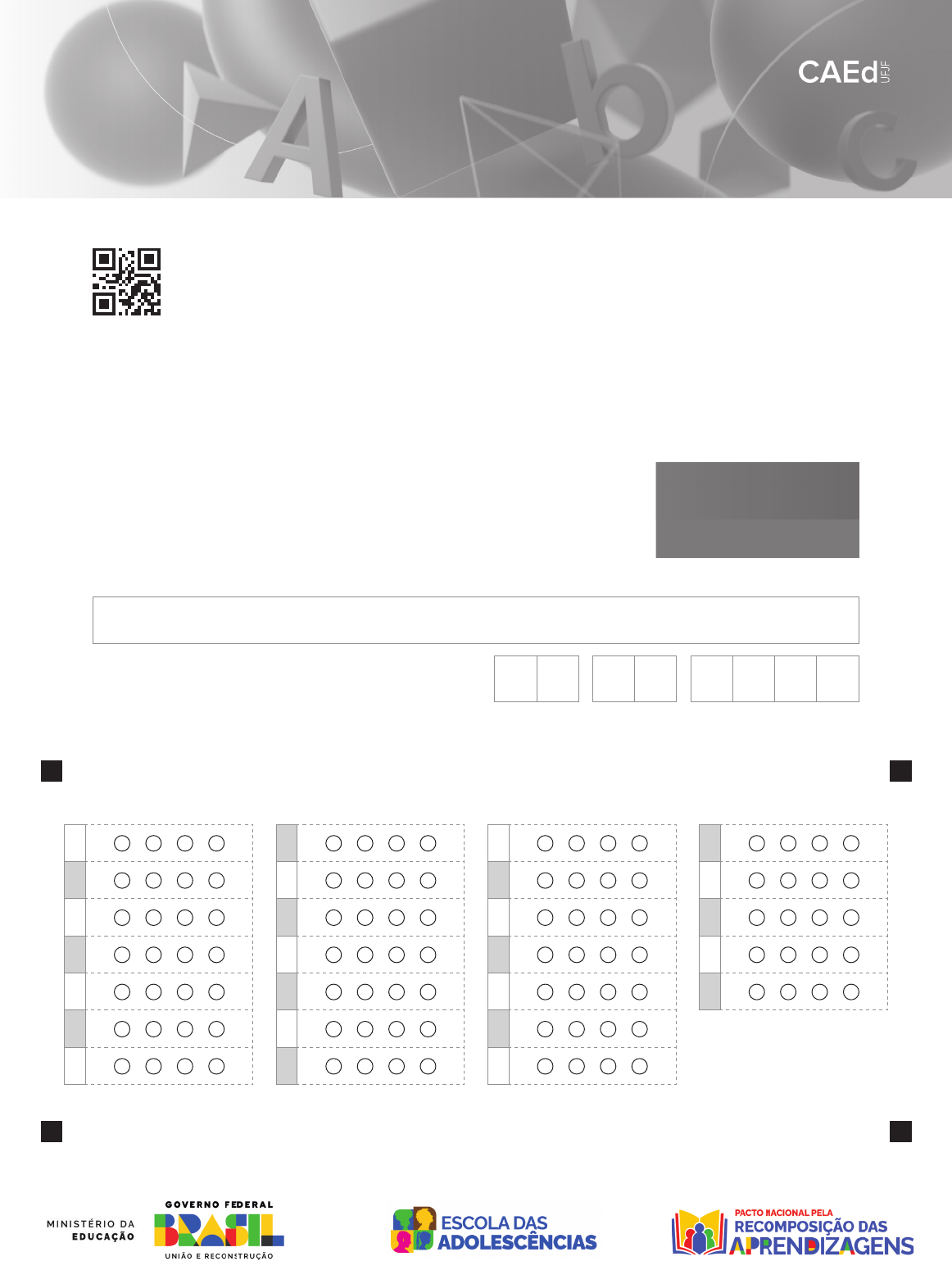 CADERNO Data de Nascimento do(a) estudante Nome do(a) estudante M 0 70 1 AVALIAÇÃO CONTÍNUA DA APRENDIZAGEM NOS ANOS FINAIS CICLO I 2024 1890M0701 7º ano do Ensino Fundamental MATEMÁTICA 66335577225566553322 01 DCBA 02 DCBA 03 DCBA 04 DCBA 05 DCBA 06 DCBA 07 DCBA 08 DCBA 09 DCBA 10 DCBA 11 DCBA 12 DCBA 13 DCBA 14 DCBA 15 DCBA 16 DCBA 17 DCBA 18 DCBA 19 DCBA 20 DCBA 21 DCBA 22 DCBA 23 DCBA 24 DCBA 25 DCBA 26 DCBA BL01M07 Leia e observe as informações do quadro abaixo para responder às cinco questões a seguir. Bruno comprou, recentemente, um apartamento para morar. Esse apartamento possui sala, escritório, dois quartos, banheiro, cozinha e lavanderia. Observe, no plano cartesiano abaixo, a representação da planta baixa desse apartamento que foi comprado por Bruno. 0 1 2 3 4 5 6 7 1 2 3 4 5 x –1 –2 –3 –4 –5 –1–2–3 y –6 6 8–4–5–6–7–8 1 m 1 m Quarto 1 Quarto 2 Banheiro Escritório Cozinha Sala Lavanderia M00061740_CEN 01) (M00061745) O quarto 1 do apartamento de Bruno tem 15 m2 de área. Ele colocou nesse quarto uma cama de casal que ocupou 5 1 da medida da área do cômodo. Qual é a medida da área, em metro quadrado, que a cama ocupou do quarto? A) 3 m2. B) 5 m2. C) 10 m2. D) 75 m2. 02) (M00061740) Observe o formato de cada um dos sete cômodos representados nessa planta baixa. Quais desses cômodos possuem formato retangular? A) Lavanderia e quarto 1. B) Banheiro, quarto 2 e sala. C) Banheiro, escritório e sala. D) Banheiro, escritório, quarto 2 e sala. 03) (M00061741) Na planta baixa do apartamento de Bruno, um objeto está posicionado no ponto de coordenadas (–2, 3) do plano cartesiano. Qual objeto está posicionado no ponto de coordenadas (–2, 3) desse plano? A) B) C) D) M0701 1 BL01M07 M0701 2 04) (M00061743) Bruno irá instalar uma moldura de gesso que contorna o teto da sala de seu apartamento. A instalação dessa moldura custa 14 reais por metro linear. Observe, na malha quadriculada abaixo, a representação da sala do apartamento de Bruno. Sala 1 m 1 m Qual será o valor que Bruno irá gastar, no mínimo, com a instalação dessa moldura de gesso? A) 140 reais. B) 280 reais. C) 294 reais. D) 392 reais. 05) (M00061742) Bruno irá contratar um marceneiro para instalar alguns armários na parede transversal de seu escritório. Para encomendá‑los, ele desenhou o formato desse escritório, indicou uma medida de ângulo interno de 146° e representou a outra medida de ângulo como α. Observe essa representação na malha quadriculada abaixo. Escritório146º � De acordo com essa representação, qual é a medida, em grau, do ângulo α? A) 34°. B) 56°. C) 146°. D) 214°. BL02M07 Leia e observe as informações do quadro abaixo para responder às cinco questões a seguir. Samuel é gerente de uma equipe de confecção de uniformes. No momento, essa equipe possui 10 funcionários que trabalham juntos diariamente durante 6 horas. Samuel recebeu uma encomenda de uma empresa para produzir 1 080 uniformes, com prazo de entrega de 8 dias. Observe, na imagem abaixo, uma ilustração que apresenta Samuel demonstrando preocupação com o prazo de entrega dessa encomenda. Com o ritmo de produção da minha equipe, serão necessários 12 dias de trabalho para entregar todos os uniformes dessa encomenda. (M00064015_CEN) 06) (M00064019) A empresa que fez essa encomenda vai pagar R$ 90,00 pela confecção de cada uniforme que será produzido, mais um acréscimo de 15% desse valor para bordar o emblema em cada uniforme. Quantos reais, no total, essa empresa vai pagar em cada um dos uniformes que serão produzidos? A) R$ 90,90. B) R$ 91,35. C) R$ 103,50. D) R$ 105,00. 07) (M00064016) Os dez funcionários da equipe de Samuel, trabalhando juntos 6 horas por dia, produzirão os uniformes dessa encomenda em 12 dias. Samuel resolveu fazer uma estimativa da quantidade de dias necessários para que essa equipe, mantendo o mesmo ritmo de trabalho, produza os uniformes dessa encomenda trabalhando 8 horas por dia. Em quantos dias de trabalho a equipe de Samuel vai produzir os uniformes dessa encomenda, se trabalharem 8 horas por dia? A) 4. B) 9. C) 10. D) 16. M0701 3 BL02M07 M0701 4 08) (M00064018) O emblema bordado em cada uniforme dessa encomenda é um círculo com cinco figuras geométricas em seu interior. Observe esse emblema na malha quadriculada abaixo. No total, esse emblema possui em seu interior quantos losangos? A) 1. B) 2. C) 3. D) 5. 09) (M00064020) Samuel fez um levantamento sobre a quantidade de uniformes que sua equipe produziu para outras empresas nos últimos seis meses do ano passado. Observe, na lista abaixo, os dados obtidos por Samuel. Julho ‑‑‑‑‑‑‑‑‑‑‑‑‑‑‑‑‑ 1 320 Agosto ‑‑‑‑‑‑‑‑‑‑‑‑‑‑‑‑‑ 240 Setembro ‑‑‑‑‑‑‑‑‑‑‑‑‑‑‑‑‑ 540 Outubro ‑‑‑‑‑‑‑‑‑‑‑‑‑‑‑‑‑ 240 Novembro ‑‑‑‑‑‑‑‑‑‑‑‑‑‑‑‑‑ 1 080 Dezembro ‑‑‑‑‑‑‑‑‑‑‑‑‑‑‑‑‑ 480 Qual foi a média da quantidade de uniformes produzidos pela equipe de Samuel nos últimos seis meses do ano passado? A) 240. B) 390. C) 510. D) 650. 10) (M00064015) Samuel percebeu que, com o ritmo de produção de sua equipe, em 12 dias de trabalho serão produzidos os 1 080 uniformes. Nessas condições, quantos uniformes essa equipe produzirá, no total, em 8 dias de trabalho? A) 98. B) 360. C) 720. D) 1 076. BL03M07 Leia e observe as informações do quadro abaixo para responder às cinco questões a seguir. Anete, Breno, Cirino, Dalmo, Elvira e Fabiana trabalham em diferentes setores de uma loja de departamentos. De segunda a sábado da semana passada, essa loja fez uma promoção. Observe abaixo a representação dessa loja com os setores onde esses funcionários trabalham. (M00064021_CEN) 11) (M00064021) Na segunda‑feira dessa semana de promoção, o setor de itens femininos vendeu 8 6 dos itens que havia em seu e