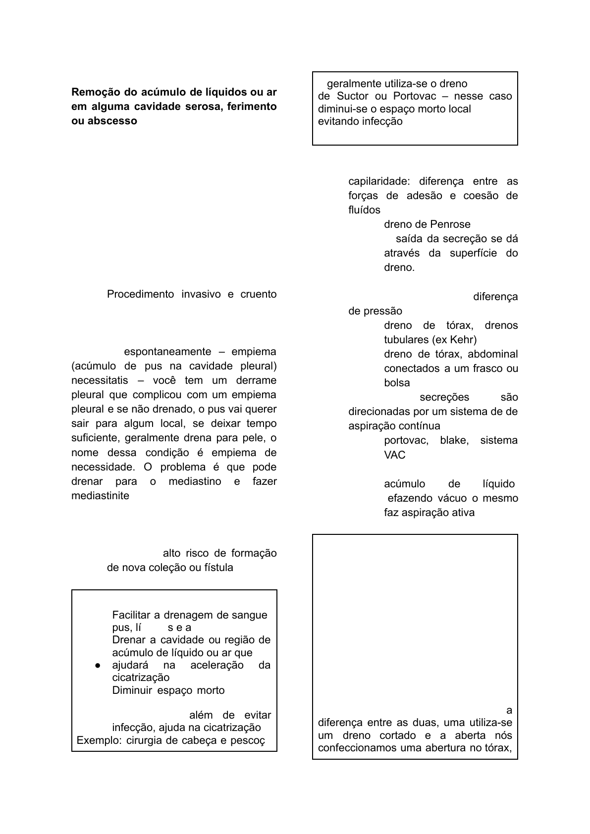 DRENAGENS Remoção do acúmulo de líquidos ou ar em alguma cavidade serosa, ferimento ou abscesso ● Incisão direta ● Auxílio de métodos de imagem (ex: ultrassom, tomografia) ● Dispositivos de drenagem (ex: agulhas, drenos, cateteres QUAIS SÃO OS MECANISMOS DE DRENAGEM? ● Espontaneamente ● Procedimento invasivo e cruento (abertura na pele) ○ Drenagem simples ○ Drenagem por aspiração Exemplo: espontaneamente – empiema (acúmulo de pus na cavidade pleural) necessitatis – você tem um derrame pleural que complicou com um empiema pleural e se não drenado, o pus vai querer sair para algum local, se deixar tempo suficiente, geralmente drena para pele, o nome dessa condição é empiema de necessidade. O problema é que pode drenar para o mediastino e fazer mediastinite (80% de chance de morte) Objetivo ● Terapêutico: coleção prévia ● Profilático: alto risco de formação de nova coleção ou fístula Por que usamos dreno? ● Facilitar a drenagem de sangue, pus, líquidos e ar ● Drenar a cavidade ou região de acúmulo de líquido ou ar que ● ajudará na aceleração da cicatrização ● Diminuir espaço morto evitando infecção ● A drenagem além de evitar infecção, ajuda na cicatrização Exemplo: cirurgia de cabeça e pescoço – geralmente utiliza-se o dreno de Suctor ou Portovac – nesse caso diminui-se o espaço morto local evitando infecção Mecanismos ● capilaridade: diferença entre as forças de adesão e coesão de fluídos ○ dreno de Penrose ○ A saída da secreção se dá através da superfície do dreno. Não há passagem de líquido pela sua luz ● Gradiente de pressão: diferença de pressão ○ dreno de tórax, drenos tubulares (ex Kehr) ○ dreno de tórax, abdominal conectados a um frasco ou bolsa ● Sucção: secreções são direcionadas por um sistema de de aspiração contínua ○ portovac, blake, sistema VAC ○ mais utilizados onde há acúmulo de líquido, refazendo vácuo o mesmo faz aspiração ativa Qual a importância da escolha do local? A escolha do local da drenagem é de fundamental importância, mas dependerá do diagnóstico e localização do líquido ou ar que será esvaziado Por exemplo, nos empiemas pleurais, quando não temos mais expansão pulmonar, há uma situação chamada de pleurostomia (comunica o espaço pleural com o meio externo). Isso é uma drenagem aberta. Existem dois tipos de pleurostomia (tubular e aberta), a diferença entre as duas, uma utiliza-se um dreno cortado e a aberta nós confeccionamos uma abertura no tórax, Highlight Highlight capilaridade Highlight Highlight Highlight Highlight Highlight Highlight retira-se 2 costelas, sutura a pele na pleura e deixa-se essa abertura A escolha do local onde vai realizado o empiema é de extrema importância, pois ele deve drenar por gravidade, não há sucção. Quando o paciente fica em pé por gravidade o líquido deve sair e quando ele deita a mesma coisa. Devemos buscar um ponto póstero-lateral adequado para que ocorra a drenagem por gravidade Um erro fatal é realizar uma pleurostomia alta ou em uma posição inadequada, pois não vai haver drenagem de secreção e vai ter acúmulo e o paciente vai começar a ter sintomas sistêmicos ● Nessa condição a fisiologia do espaço se perdeu, não preciso drenar fechado pois não há mais diferença de pressão ● Essencial o ponto de drenagem, se não colocado de maneira correta e no lugar certo não vai drenar – drenagens espontâneas no tórax necessita de dreno em baixos pontos do tórax O QUE FAZ UMA DRENAGEM NOS ABSCESSOS? A drenagem converte um abscesso em uma fístula controlada. Ou seja, comunica o interior com o meio externo Exemplos de drenagem de abcessos: ● Abertura de uma ferida infectada ● Colocação de dreno torácico (tratamento de empiema pleural) ● Nefrostomia percutânea ● Colecistostomia percutânea ● Drenagem de abscesso mediastinal (perfuração esofágica) ● Abertura do abdômen por peritonite difusa QUAL A IMPORTÂNCIA DA REMOÇÃO CIRÚRGICA DOS ABSCESSOS E TECIDOS NECROSADOS? O desbridamento, drenagem de abscesso, remoção de tecidos necrosados e corpos estranhos infectados permitem a chegada de antibióticos, nutrientes e células de defesa do hospedeiro ao local eliminando as colônias de microrganismos presentes INDICAÇÕES DE DRENAGEM Diagnóstica: ● Drenagem da cavidade pleural (toracocentese) ● Drenagem da cavidade abdominal (paracentese) ● Observar volume de drenagem (hemotórax) ● Observar o ritmo de drenagem ● Identificar a presença de infecção (derrames pleurais) Curativa: ● Eliminação de líquidos ● Eliminação de pus ● Evitar disseminação do processo infeccioso ○ Drenagem de abscesso e cavidade localizada (líquido); Cavidade pleural e cavidade abdominal (pus) Outras indicações: ● Infecção em ambiente fechado (abscesso) ● Remover sangue, exsudatos e corpos estranhos prevenir ● hematomas, seromas e espaço morto ● Após traumatismos com lesão extensa de tecido mole onde o desbridamento for incompleto Quando vamos remover sangue de cavidade, drenagem de hematoma em algumas situações, é justamente para evitar que isso caminhe para um abscesso DOENÇAS DO TRATO GASTROINTESTINAL E DA 5 ou 6 espaço intercostal Highlight CAVIDADE TORÁCICA QUE NECESSITA DE DRENAGEM ● Rafia de úlcera gastroduodenal perfurada ● Exclusão pilórica (lesões complexas duodenais ou pancreáticas) ● Ressecção de cólon nas doenças diverticulares (diverticulite perfurada) ● Colostomia proximal (perfuração dos cólons) ● Colecistectomia (colecistite aguda gangrenosa) ● Descorticação pulmonar (empiema pleural) ● Trauma torácico (pneumotórax ou hemotórax) ● Derrames pleurais (parapneumônico, tubérculose, ICC...) Rafia de úlcera: espero uma contaminação grande O dreno transforma uma infecção confinada em uma fístula controlada TÉCNICA PARA DRENAGEM TORÁCICA 1. Posicionar paciente 2