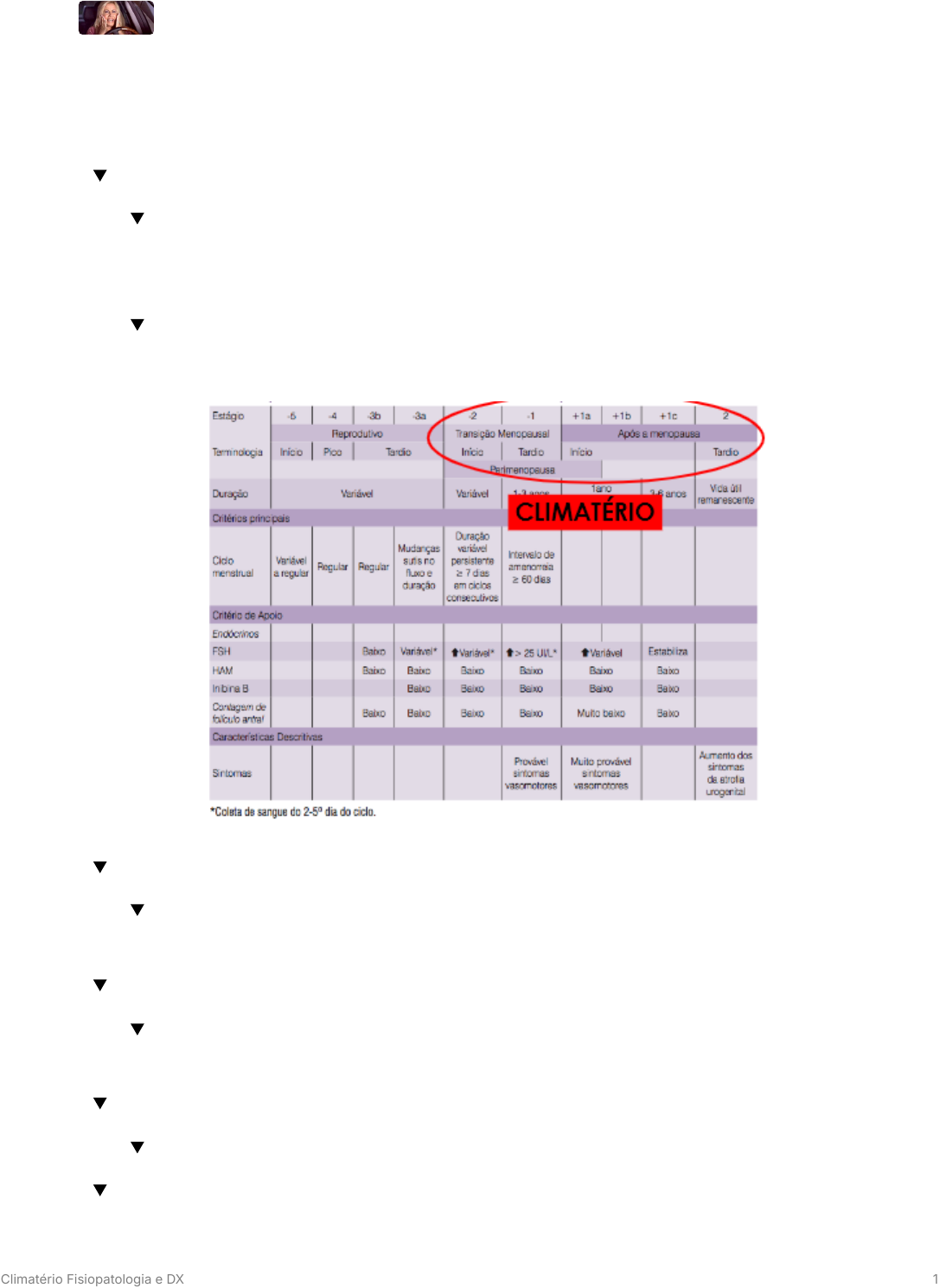 Climatério Fisiopatologia e DX 1 Climatério Fisiopatologia e DX o que é o climatério ? fase de evolução da mulher, onde o organismo, até então mais direcionado a gerar vida, se dirige a outros fins, possibilitando que ela desenvolva todas suas potencialidades. envolve o período de transição menopausal, está junto a chamada peri- menopausa, menopausa e após a menopausa. menopausa prematura ? ocorre 40 anos, tanto natural quanto induzida (cirúrgica ou química por ex.) insuficiência ovariana primária IOP ? ocorre 40 anos, levando a amenorreia tanto permanente quanto transitória. o que é menopausa ? último ciclo menstrual → última menstruação como é o dx clínico da menopausa ? Climatério Fisiopatologia e DX 2 pra dizer que a mulher está na menopausa temos que : aguardar 1 ano após a última menstruação , se não tiver mais sangramento significa que a mulher clinicamente está em menopausa. o que é a transição menopausal ? espaço de tempo onde começam a ter mudanças na frequência (intervalo) da menstruação e na duração do ciclo menstrual, assim como alterações endocrinológicas; transição menopausal → estágios : inicial → irregularidades do ciclo menstrual → duração variável persistente → mais de 7 dias em ciclos consecutivos, temos um espaçamento dos ciclos tardio → alterações hormonais → intervalos de amenorreia de mais de 60 dias → sintomas vasomotores (fogachos + sudorese) o que é perimenopausa ? inicia-se no estágio 2 ou início da transição menopausal, com término após 1 ano da data da última menstruação → sangramento irregular e queixas de ondas de calor mulheres que estudamos até 1 ano depois que parou de menstruar. o que é o período após a menopausa ? inicia na última menstruação até o último dia de vida da mulher como se divide o período após a menopausa ? após menopausa inicial → 6 primeiros anos depois da menopausa → provável sintomas vasomotores após a menopausa tardio 7 anos após última menstruação até o último dia de vida da mulher → aumenta dos sintomas de atrofia urogenital como é caracterizado as ondas de calor na menopausa ? sintomas de onda de calor → inicia no tórax e sobe para a região da cabeça → característico da menopausa. quais os sintomas vasomotores na menopausa ? Climatério Fisiopatologia e DX 3 sintomas vasomotores → fogachos e palpitações , nervosismo, irritabilidade, insônia , depressão, diminuição libido. quais os distúrbios genitais e sexuais envolvidos com a menopausa ? distúrbios genitais e sexuais → vaginite atrófica (processo inflamatório infeccioso pela falta do hormônio), infecções vaginais, secura vaginal, dispareunia quais os sinais e sintomas no período do climatério ? >risco doenças cardio-vasculares enfraquecimento e queda de cabelo, retração gengival , redução audição, afinamento da pele e ressecamento risco de osteoporose → propensão a fraturas atrofia das glândulas mamárias distúrbios urinários → ardor ao urinar e urgência urinária qual o significado da menopausa para a mulher ? parada menstruação fim de sua capacidade reprodutiva alterações hormonais mudança na vida sintomas mudança de humor mudança no corpo Climatério Fisiopatologia e DX 4 processo de envelhecimento aumento risco de doenças necessidade de cuidados médicos temos de acolher a paciente nesse momento visão atual da terapia hormonal no período do climatério ? mulheres 50 anos climatério quais os exames complementares básicos ? laboratoriais : sangue oculto → pesquisa de hemácias nas fezes citologia oncótica cervical → até 65 anos de idade, a cada 3 anos mamografia simples → anualmente ultrassonografia transvaginal → se fizer terapia hormonal pode pedir anualmente, pode de rotina solicitar a cada 3 anos densitometria óssea Não precisa pedir anual quais exames podemos complementar no caso do climatério? se estiver em novo relacionamento: rastrear para ISTs HIV, sífilis, HBsAg e Anti-hcv) verificar pressão arterial medir cintura abdominal → pensar em síndrome metabólica Climatério Fisiopatologia e DX 5 checar calendário vacinal se houver necessidade de avaliar função renal, hepática. Não pedir quando no climatério : prolactina estradiol LH progesterona testosterona testosterona total SHBG quando dosar o FSH no climatério ? se houver dúvida : dosar FSH com intervalo de 4 a 6 semanas FSH aumenta no 3 ou 5º dia do período do ciclo menstrual) valores 25 MUI/ml indicam transição menopausal sempre pra dosar o FSH a mulher tem que estar 30 dias sem hormônio. quando o ovário entra em colapso o FSH sobe Climatério Fisiopatologia e DX 6 prevenção primária da vacinação e climatério : hormônio antimulleriano HAM mulheres entre 45 a 48 anos 0,20 ng/ml → tempo médio menopausa 5,99 mulheres entre 35 a 39 anos 0,20ng/ml → tempo médio menopausa 9,94 o que leva a indicar uma terapia farmacológica no climatério ? SINTOMAS VASOMOTORES FOGACHOS E PALPITAÇÕES. Climatério Fisiopatologia e DX 7 Quais as indicações para o tratamento hormonal no climatério? para controlar os sintomas estrogênio isolado ou associado a progestagênio é aprovado como terapia de primeira linha para o alívio dos sintomas vasomotores, moderado a grave reduz a frequência e intensidade dos SVM em 7585% e nenhuma terapia farmacológica ou alternativa tem maior alívio fogachos no climatério : chama súbita e de pouca duração, pequena labareda sensação de calor no rosto Qual a ferramenta usada para avaliar a intensidade dos sintomas climatéricos e também ser usada para avaliar prognóstico? índice menopausal de Kupperman para cada sintoma é estabelecido um peso diferente de acordo com a intensidade. varia de leve , moderado a acentuado. leve 19, moderado 20 a 35, acentuado 35 Outra ferramenta mais simples para avaliar a intensidade dos fogachos e também ser usada para avaliar prognóstico? índice circu