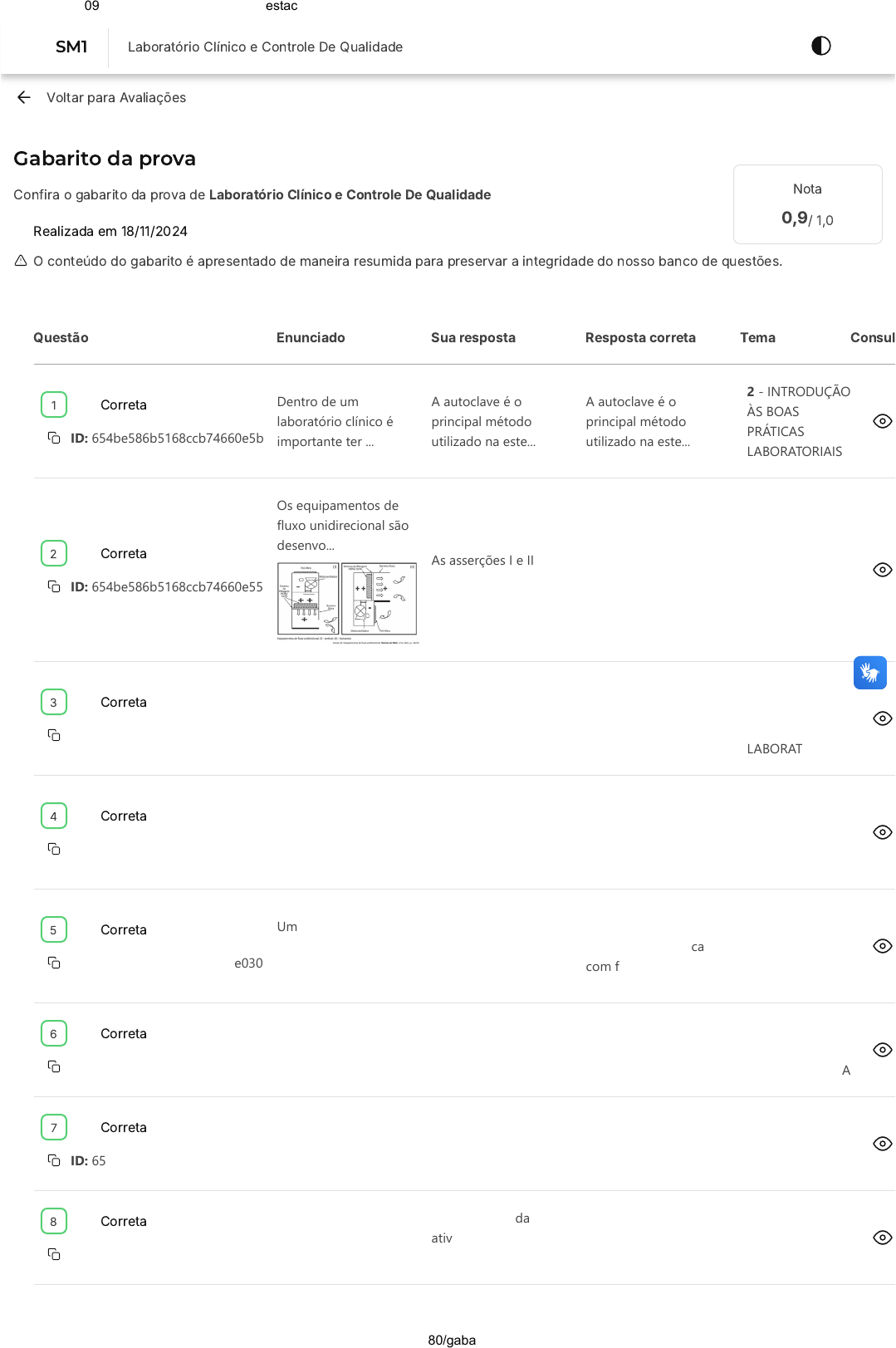 Voltar para Avaliações Gabarito da prova Confira o gabarito da prova de Laboratório Clínico e Controle De Qualidade Realizada em 18/11/2024 Nota 0,9/ 1,0 O conteúdo do gabarito é apresentado de maneira resumida para preservar a integridade do nosso banco de questões. Questão Enunciado Sua resposta Resposta correta Tema Consul Correta ID: 654be586b5168ccb74660e5b Dentro de um laboratório clínico é importante ter ... A autoclave é o principal método utilizado na este... A autoclave é o principal método utilizado na este... 2 - INTRODUÇÃO ÀS BOAS PRÁTICAS LABORATORIAIS Correta ID: 654be586b5168ccb74660e55 Os equipamentos de fluxo unidirecional são desenvo... As asserções I e II são proposições falsas. As asserções I e II são proposições falsas. 2 - INTRODUÇÃO ÀS BOAS PRÁTICAS LABORATORIAIS Correta ID: 654be6e6b5168ccb7467e02a O laboratório de contenção máxima, com nível de ri... NB-4 NB-4 2 - INTRODUÇÃO ÀS BOAS PRÁTICAS LABORATORIAIS Correta ID: 654be6e6b5168ccb7467e03c De acordo com a classificação dos resíduos de serv... grupo B - Resíduos químicos. grupo B - Resíduos químicos. 2 - INTRODUÇÃO ÀS BOAS PRÁTICAS LABORATORIAIS Correta ID: 654be6e6b5168ccb7467e030 Um pesquisador realizou uma extração de DNA de um ... Uma Cabine de Segurança Biológica com fluxo vertic... Uma Cabine de Segurança Biológica com fluxo vertic... 2 - INTRODUÇÃO ÀS BOAS PRÁTICAS LABORATORIAIS Correta ID: 654be673b5168ccb746764a3 (UFF/2009 - adaptada) O uso de cores em Engenharia... Cinza. Cinza. 3 - PRINCÍPIOS DE BIOSSEGURANÇA Correta ID: 654be5a9b5168ccb74665628 Em caso de suspeita de tuberculose pulmonar em pac... Coleta de escarro. Coleta de escarro. 3 - PRINCÍPIOS DE BIOSSEGURANÇA Correta ID: 654be66eb5168ccb74676193 (VUNESP/2019 - adaptada) Existem variáveis ... A intensidade da atividade física pode alte... A intensidade da atividade física pode alte... 3 - PRINCÍPIOS DE BIOSSEGURANÇA 1 2 3 4 5 6 7 8 SM1 Laboratório Clínico e Controle De Qualidade Feedback 18/11/2024, 19:09 estacio.saladeavaliacoes.com.br/prova/673bb2ebbb196403db84e780/gabarito/reduzido/ https://estacio.saladeavaliacoes.com.br/prova/673bb2ebbb196403db84e780/gabarito/reduzido/ 1/2 https://estacio.saladeavaliacoes.com.br/avaliacoes/ Correta ID: 654be5a9b5168ccb7466566a A acreditação é uma espécie de avaliação e certifi... Existem três níveis de acreditação que se diferenc... Existem três níveis de acreditação que se diferenc... 3 - PRINCÍPIOS DE BIOSSEGURANÇA Incorreta ID: 654be5a9b5168ccb7466568e (CISPAR/PR) De acordo com as normas de biosseguran... Algumas normas foram criadas especificamente para ... As normas de biossegurança do trabalho em laborató... 3 - PRINCÍPIOS DE BIOSSEGURANÇA 9 10 Encontrou algum problema? Você pode copiar o ID da questão e abrir um requerimento. Na tela inicial do Campus Virtual �SIA�, acesse "Atendimento > Requerimento > Novo > Currículo/Aula/horário > Analisar ambiente de avaliação/exercícios" 18/11/2024, 19:09 estacio.saladeavaliacoes.com.br/prova/673bb2ebbb196403db84e780/gabarito/reduzido/ https://estacio.saladeavaliacoes.com.br/prova/673bb2ebbb196403db84e780/gabarito/reduzido/ 2/2