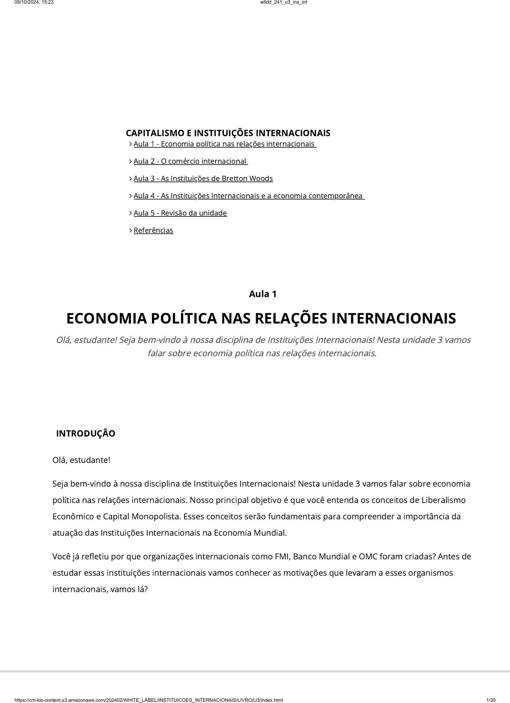 INTRODUÇÃO Olá, estudante! Seja bem-vindo à nossa disciplina de Instituições Internacionais! Nesta unidade 3 vamos falar sobre economia política nas relações internacionais. Nosso principal objetivo é que você entenda os conceitos de Liberalismo Econômico e Capital Monopolista. Esses conceitos serão fundamentais para compreender a importância da atuação das Instituições Internacionais na Economia Mundial. Você já re�etiu por que organizações internacionais como FMI, Banco Mundial e OMC foram criadas? Antes de estudar essas instituições internacionais vamos conhecer as motivações que levaram a esses organismos internacionais, vamos lá? Aula 1 ECONOMIA POLÍTICA NAS RELAÇÕES INTERNACIONAIS Olá, estudante! Seja bem-vindo à nossa disciplina de Instituições Internacionais! Nesta unidade 3 vamos falar sobre economia política nas relações internacionais. CAPITALISMO E INSTITUIÇÕES INTERNACIONAIS Aula 1 - Economia política nas relações internacionais Aula 2 - O comércio internacional Aula 3 - As Instituições de Bretton Woods Aula 4 - As Instituições Internacionais e a economia contemporânea Aula 5 - Revisão da unidade Referências 09/10/2024, 15:23 wlldd_241_u3_ins_int https://cm-kls-content.s3.amazonaws.com/202402/WHITE_LABEL/INSTITUICOES_INTERNACIONAIS/LIVRO/U3/index.html 1/35 O LIBERALISMO ECONÔMICO A economia política internacional envolve a vida de todo o ser humano. Trataremos de modo objetivo de três lentes teóricas clássicas do campo de estudos de Economia Política Internacional, são elas: mercantilismo, liberalismo econômico e marxismo. Passaremos brevemente sobre mercantilismo e marxismo e destinaremos maior ênfase ao liberalismo econômico. Falar sobre mercantilismo sugere uma discussão sobre os séculos XVI e XVII no contexto do Estado Moderno. Mas o que se entende por mercantilismo? Mercantilistas entendem que a economia internacional é um espaço de intensa competição econômica onde não há espaço para cooperação, o objetivo principal é a ampliação do poder estatal. Como o pensamento dominante consiste na competição e con�ito, os estados buscarão proteger suas economias visando aumentar sua riqueza. Em outros termos, o Estado deve subordinar a sua economia ao Estado, ator considerado essencial para defender os interesses econômicos, a riqueza e o poder (Jackson; Sorensen, 2007). A discussão sobre mercantilismo auxilia na compreensão do que é chamado Liberalismo econômico. De modo oposto ao mercantilismo, o liberalismo sugere uma economia autônoma sem intervenção estatal. Um importante pensador do Liberalismo econômico, considerado pai dessa corrente de pensamento, foi o �lósofo britânico Adam Smith (1723-1790) autor da obra A Riqueza das Nações. De modo objetivo liberalismo pode ser de�nido como um sistema econômico que assegura o direito à propriedade privada em um cenário de livre mercado e livre concorrência no mercado. A principal característica é a não intervenção do Estado na economia e com in�ação sob controle (Fiori, 1999; Fernandes, 2005). Talvez você já tenha ouvido a expressão “mão invisível” na economia. Essa expressão foi utilizada por Smith para descrever um modelo de economia em que o mercado pode se regular de maneira e�ciente sem a intervenção do Estado, visto que as economias tenderiam a se expandir espontaneamente a partir de regras e mecanismos próprios. Essa perspectiva entende a economia como “uma doutrina de princípios voltados a administrar o crescimento econômico e a riqueza individual” (Gilpin, 1987, p. 27). Smith criticava os altos impostos, o protecionismo e a ideia do Estado como o principal ator para tomar decisões na economia. Na visão liberal econômica, o indivíduo é o principal ator, pois é quem consome, produz e realiza as trocas comerciais. Não existe na visão liberal um entendimento de uma economia mundial con�itiva. Essa visão contrapõe a lógica mercantilista, que entende as trocas comerciais como instrumento para favorecer a prosperidade dos Estados. Figura 1 | Monopólio �nanceiro 09/10/2024, 15:23 wlldd_241_u3_ins_int https://cm-kls-content.s3.amazonaws.com/202402/WHITE_LABEL/INSTITUICOES_INTERNACIONAIS/LIVRO/U3/index.html 2/35 Fonte: Pixabay.( Monopólio Dinheiro Potência - Grá�co vetorial grátis no Pixabay - Pixabay) Alguns estudiosos da vertente liberal econômica preveem que em determinados cenários será necessária maior intervenção do Estado no mercado. Como exemplo, pode-se citar John Stuart Mill. Essa visão abriu espaço para a ascensão de uma teoria liberal reformulada, que se manteve até início dos anos 1980 (Gaspar, 09/10/2024, 15:23 wlldd_241_u3_ins_int https://cm-kls-content.s3.amazonaws.com/202402/WHITE_LABEL/INSTITUICOES_INTERNACIONAIS/LIVRO/U3/index.html 3/35 2015). Em relação ao Marxismo, teoria clássica associada aos estudos de Economia Política, essa vertente destaca como ponto central a luta de classes, que não �ca restrita às fronteiras dos Estados. Os Estados tendem a buscar novos mercados e ampliar seus lucros por meio do que os estudiosos dessa corrente de�niram como expansão capitalista, cronologicamente associado aos anos de 1870 a 1914, que se referiram ao período de colonização e exploração de riquezas dos países asiáticos e africanos. Na contemporaneidade, estudiosos da vertente marxista analisam a globalização econômica e atuação das grandes corporações transnacionais nas economias diversas como um fenômeno de busca por novos mercados para além das fronteiras (Gaspar, 2015; Fiori, 1999). 09/10/2024, 15:23 wlldd_241_u3_ins_int https://cm-kls-content.s3.amazonaws.com/202402/WHITE_LABEL/INSTITUICOES_INTERNACIONAIS/LIVRO/U3/index.html 4/35 A ECONOMIA POLÍTICA E SUA IMPORTÂNCIA PARA AS RELAÇÕES INTERNACIONAIS A partir da de�nição das teorias clássicas da Economia Política Internacional, resta-nos, pois, entender: qual a importân