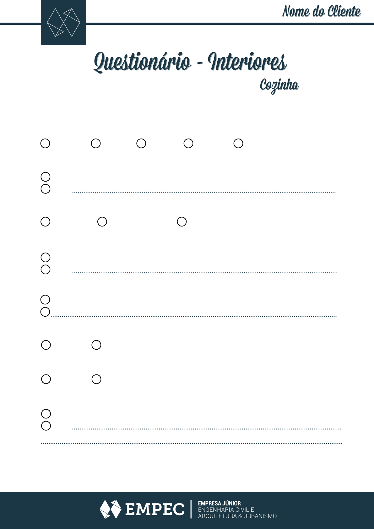 As refeições serão feitas neste ambiente? Não Sim Preferência por algum sistema de mobiliário? Portas? Gavetas? Não Sim Preferência por algum sistema de mobiliário? Portas? Gavetas? Não Sim, Quais as cores desejadas para o espaço? O cliente não tem preferências Quantas pessoas utilizarão a cozinha? 1 2 3 4 Mais de 4 Gostam de cozinhar? Quais equipamentos serão utilizados? Não Sim, Usam mais forno, micro-ondas ou fogão? Forno Micro-ondas Fogão Alguma outra necessidade? Não Sim, 1- Informações sobre o cliente Questionário - InterioresQuestionário - Interiores CozinhaCozinha Nome do ClienteNome do Cliente Modelo: Especificações: Modelo: Especificações: Modelo: Especificações: Modelo: Especificações: Modelo: Especificações: Qual material? Espessura: Área molhada: Sim Não Modelo de pia: Modelo de torneira ou misturador Filtro de água? Sim Não 2- Bancada 3- Geladeira 4- Fogão/Cooktop 5- Coifa ou Depurador 6- Máquina de lavar louça 7- Forno Elétrico 8- Micro-ondas Modelo: Especificações: 9- Acabamento tomadas Cor: 10- Iluminação Quente Fria Neutra 11- Acabamento mobiliário Sintético Natural Pintura Vidro Inox Outros Móveis Inferiores - Acabamento: Moveis superiores - Acabamento: Revestimento Pintura Pedra Outros 12- Acabamento das paredes Questionário - InterioresQuestionário - Interiores CozinhaCozinha Nome do ClienteNome do Cliente