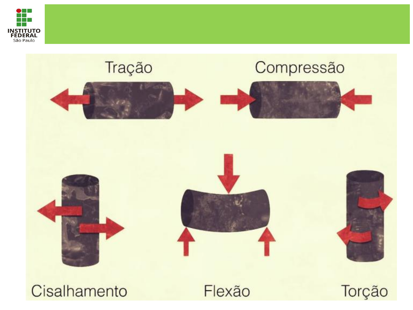 RESISTÊNCIA DOS MATERIAIS - ESFORÇOS ESFORÇOS DE TRAÇÃO (revisão) Solicitação abaixo do limite de escoamento (σe ) Deformação elástica kg f/ m m 2 ε (%) σ σr σe Solicitação acima do limite de escoamento (σe ) Lei de Hooke Deformação plástica σe : limite de escoamento σr : limite de resistência à tração materiais que apresentam deformação plástica significativa denominamos materiais dúcteis. materiais que apresentam pouca ou nenhuma deformação plástica denominamos materiais frágeis. fratura dúctil Gráfico tensão x deformação (material frágil x material dúctil) fratura frágil COMPORTAMENTO DÚCTIL x FRÁGIL (revisão) r e Rup Rup e: Limite de escoamento. Acima desse valor inicia- se a deformação plástica (ou permanente); r : Limite de resistência (tensão máxima que o material suporta); Rup: Limite de ruptura (tensão registrada no momento que o material se rompe). Rup: Limite de ruptura (maior valor de tensão que o material suporta). Nesse caso tem-se somente deformação elástica. Material Dúctil Material Frágil COMPORTAMENTO DÚCTIL x FRÁGIL (revisão) Professor: Iberê Santos AULA 3 Esforços de Compressão A compressão é uma solicitação mecânica que envolve duas forças aplicadas na mesma direção e de sentidos opostos, no sentido do centro do objeto. ESFORÇOS DE COMPRESSÃO IMPORTÂNCIA DA RESISTÊNCIA À COMPRESSÃO Solicitação de compressão tende a encurtar a peça no sentido da força aplicada. Na mecânica, o esforço de compressão está presente no dimensionamento de elementos estruturais, componentes de máquinas e em alguns processos de fabricação como a laminação, forjamento, entre outros ESFORÇOS DE COMPRESSÃO Exemplo 1 : Laminação de chapas CST (4:36 min) APLICAÇÃO DA COMPRESSÃO NOS PROCESSOS FABRICAÇÃO APLICAÇÃO DA COMPRESSÃO NOS PROCESSOS FABRICAÇÃO Exemplo 2: Forjamento a quente matriz aberta (0:30 min) Exemplo 3: Forjamento de virabrequim (1:05 min) APLICAÇÃO DA COMPRESSÃO NOS PROCESSOS FABRICAÇÃO Nos ensaios de compressão, os corpos de prova são submetidos a uma força axial para dentro, distribuída de modo uniforme em toda a seção transversal do corpo de prova. O ensaio de compressão pode ser realizado em corpos de prova ou em produtos acabados como molas e tubos. ENSAIO DE COMPRESSÃO Ensaio de compressão é muito utilizado em concreto, cerâmicas, plásticos e compósitos, sendo menos utilizado para ensaio de metais devido aos problemas envolvidos nos ensaios: o atrito entre corpo de prova e base de teste; o ausência de ruptura em materiais muito dúcteis; o deformação axial durante o ensaio (flambagem); ENSAIO DE COMPRESSÃO ENSAIO DE COMPRESSÃO EM MATERIAL METÁLICO (0:18 min) ENSAIO DE COMPRESSÃO EM CONCRETO (4:22 min) ENSAIO DE COMPRESSÃO EM FUNDIÇÃO - MATERIAL FRÁGIL (1:00 min) Assim como no ensaio de tração, um corpo de prova de um material dúctil submetido a compressão também sofre uma deformação elástica seguida de deformação plástica. Na fase de deformação elástica, o corpo volta ao tamanho original quando se retira a carga de compressão. Nos ensaios de compressão também é válida a lei de Hooke para a fase elástica da deformação, sendo possível determinar o módulo de elasticidade (ou módulo de rigidez) do material. Na fase de deformação plástica, o corpo retém uma deformação residual permanente depois de ser descarregado. . ENSAIO DE COMPRESSÃO deformação elástica deformação plástica Na compressão, o cálculo da tensão, da deformação e do módulo de elasticidade são semelhantes aos da tensão de tração. σC: Limite de resistência à compressão (MPa) F: Força máxima de compressão (N) A: Área da seção do corpo (m2) σC = F A ε = L0 - Lf L0 ε : Deformação (mm/mm) L0 : Comprimento inicial do corpo prova (mm) Lf : Comprimento final do corpo prova (mm) σC = E . ε σC : Limite de resistência à compressão (MPa) E: módulo de elasticidade (Mpa) ε : Deformação (mm/mm) EQUAÇÕES VÁLIDAS PARA OS ESFORÇOS DE COMPRESSÃO (Lei de Hook => válida somente no regime elástico) . ENSAIO DE COMPRESSÃO ENSAIO DE COMPRESSÃO EM MATERIAIS DÚCTEIS No ensaio de compressão em materiais dúcteis, a deformação lateral é significativa. Durante o ensaio, a deformação lateral prossegue até o corpo de prova se transformar num disco, sem que ocorra a ruptura. . ENSAIO DE COMPRESSÃO – MATERIAIS DÚCTEIS ENSAIO DE COMPRESSÃO – MATERIAIS DÚCTEIS ENSAIO DE COMPRESSÃO – MATERIAIS DÚCTEIS ENSAIO DE COMPRESSÃO – MATERIAIS DÚCTEIS As propriedades mecânicas avaliadas no ensaio de materiais dúcteis são (fase elástica): • Limite de escoamento ; • Módulo de elasticidade (Módulo de rigidez) ENSAIO DE COMPRESSÃO – MATERIAIS DÚCTEIS σ = E . ε Onde σ é a tensão aplicada ε é a deformação E é o módulo de elasticidade Lei de Hooke Propriedades mecânicas de materiais dúcteis no regime elástico podem ser obtidas através dos ensaios de tração e compressão (limite proporcionalidade, limite escoamento e módulo de elasticidade são bastante próximas) PROPRIEDADES MECÂNICAS TRAÇÃO x COMPRESSÃO – MATERIAIS DÚCTEIS ENSAIO DE COMPRESSÃO ENSAIO DE COMPRESSÃO EM MATERIAIS FRÁGEIS Nos materiais frágeis a fase elástica é muito pequena, não sendo possível determinar com precisão as propriedades relativas à fase elástica (limite de escoamento, módulo elasticidade). Nos ensaios de compressão de materiais frágeis, a única propriedade mecânica avaliada é o limite de resistência à compressão; . ENSAIO DE COMPRESSÃO – MATERIAIS FRÁGEIS ENSAIO DE COMPRESSÃO – MATERIAIS DÚCTEIS Assim como no ensaio de tração, o limite de resistência à compressão (materiais frágeis) é calculado dividindo a carga máxima pela seção original do corpo de prova. Onde: • Fmáx é a força máxima • A é a área inicial da seção • σc é o limite de resistência à compressão 