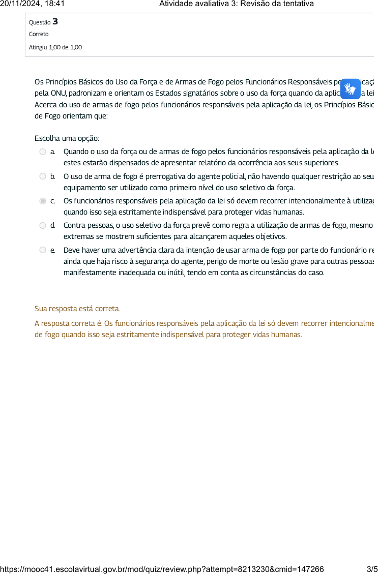 Questão 3 Correto Atingiu 1,00 de 1,00 Os Princípios Básicos do Uso da Força e de Armas de Fogo pelos Funcionários Responsáveis pela Aplicaçã pela ONU, padronizam e orientam os Estados signatários sobre o uso da força quando da aplicação da lei Acerca do uso de armas de fogo pelos funcionários responsáveis pela aplicação da lei, os Princípios Básic de Fogo orientam que: Escolha uma opção: a. Quando o uso da força ou de armas de fogo pelos funcionários responsáveis pela aplicação da le estes estarão dispensados de apresentar relatório da ocorrência aos seus superiores. b. O uso de arma de fogo é prerrogativa do agente policial, não havendo qualquer restrição ao seu equipamento ser utilizado como primeiro nível do uso seletivo da força. c. Os funcionários responsáveis pela aplicação da lei só devem recorrer intencionalmente à utilizaç quando isso seja estritamente indispensável para proteger vidas humanas. d. Contra pessoas, o uso seletivo da força prevê como regra a utilização de armas de fogo, mesmo extremas se mostrem su�cientes para alcançarem aqueles objetivos. e. Deve haver uma advertência clara da intenção de usar arma de fogo por parte do funcionário re ainda que haja risco à segurança do agente, perigo de morte ou lesão grave para outras pessoas manifestamente inadequada ou inútil, tendo em conta as circunstâncias do caso. Sua resposta está correta. A resposta correta é: Os funcionários responsáveis pela aplicação da lei só devem recorrer intencionalme de fogo quando isso seja estritamente indispensável para proteger vidas humanas. 20/11/2024, 18:41 Atividade avaliativa 3: Revisão da tentativa https://mooc41.escolavirtual.gov.br/mod/quiz/review.php?attempt=8213230&cmid=147266 3/5