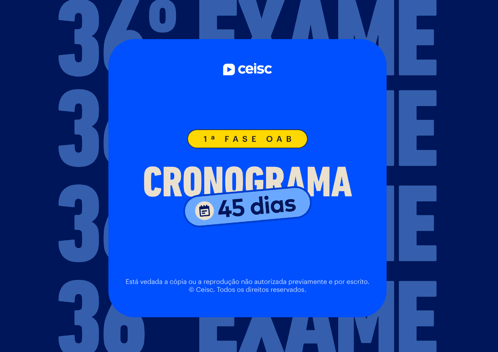 2 SEMANA 01 Dica: Leia seu material e assista videoaulas para compreender mais o conteúdo. dia 1 Realizar 35° Exame da OAB completo 1. Acesse as provas anteriores da OAB no site da FGV; 2. Baixe a prova e realize como se estivesse no dia do exame; 3. Confira o gabarito e faça uma análise de desempenho com a ajuda do nosso material de apoio. *Atenção: se você é nosso aluno Ceisc, você terá acesso a testes de nivelamento e simulados dentro do seu ambiente EAD. dia 2 Direito Penal Aplicação da Lei Penal; Fato Típico. □ Aplicação da lei penal: Lei penal no tempo e Tempo do crime. □ Fato típico: Nexo de causalidade; Consumação e tentativa; Desistência voluntária e arrependimento eficaz; Arrependimento posterior. □ Fato típico: Crime impossível. □ Erro de Tipo. Resolver questões Resolva questões relacionadas ao assunto que você estudou. Atenção: se você é nosso aluno Ceisc, acesse seu cronograma com questões já selecionadas no EAD. dia 3 Ética Legislação; Órgãos de gestão; Honorários advocatícios. □ Legislação. □ Órgãos de gestão da OAB. □ Honorários advocatícios. Resolver questões Resolva questões relacionadas ao assunto que você estudou. Atenção: se você é nosso aluno Ceisc, acesse seu cronograma com questões já selecionadas no EAD. dia 4 Direito Constitucional Direitos e Garantias Fundamentais; Direitos e Deveres Individuais e Coletivos. □ Direitos e Garantias Fundamentais. □ Direitos e Deveres Individuais e Coletivos. Resolver questões Resolva questões relacionadas ao assunto que você estudou. Atenção: se você é nosso aluno Ceisc, acesse seu cronograma com questões já selecionadas no EAD. dia 5 Direito do Trabalho Contrato de trabalho; Jornada do trabalho. □ Contrato de trabalho. □ Jornada do trabalho. Resolver questões Resolva questões relacionadas ao assunto que você estudou. Atenção: se você é nosso aluno Ceisc, acesse seu cronograma com questões já selecionadas no EAD. dia 6 Direito Civil Parte Geral; Direito das Coisas; Direito de Família; Direito Sucessório. □ P. Geral - Capacidade e Incapacidade; Tutela e Curatela; Direitos de personalidade; Bens Jurídicos. □ P. Geral - Negócio Jurídicos; Defeitos e Invalidade; Prescrição e Decadência. □ Dir. das Coisas-Posse; Detenção; Classificação; Direitos Reais; Formas de Aquisição da Propriedade Imóvel. □ Dir. de Família: Regime de Bens; Alimentos. □ Sucessão em Geral; Sucessão Legítima; Sucessão Testamentária. Resolver questões Resolva questões relacionadas ao assunto que você estudou. Atenção: se você é nosso aluno Ceisc, acesse seu cronograma com questões já selecionadas no EAD. dia 7 Direito Tributário Competência Tributária, Imunidades, Responsabilidade e Denúncia Espontânea. □ Competência Tributária. □ Limitações ao Poder de Tributar – Imunidades. □ Responsabilidade Tributária e Denúncia Espontânea. Resolver questões Resolva questões relacionadas ao assunto que você estudou. Atenção: se você é nosso aluno Ceisc, acesse seu cronograma com questões já selecionadas no EAD. d i a d i a d i a d i a d i a d i a https://oab.fgv.br/ https://ceisc.com.br/ https://ceisc.com.br/ https://ceisc.com.br/ https://ceisc.com.br/ https://ceisc.com.br/ https://ceisc.com.br/ https://ceisc.com.br/ https://ceisc.com.br/ 3 SEMANA 02 Dica: Leia seu material e assista videoaulas para compreender mais o conteúdo. dia 8 Processo Penal Competência; Provas; Procedimento Penal. □ Competência. □ Provas. □ Procedimento Penal. Resolver questões Resolva questões relacionadas ao assunto que você estudou. Atenção: se você é nosso aluno Ceisc, acesse seu cronograma com questões já selecionadas no EAD. dia 9 Direito Ambiental □ Meio Ambiente na Constituição Federal. □ Sistema Nacional de Unidades de Conservação. □ Responsabilidades. Dir. Criança e Adolescente □ Direito à convivência familiar e comunitária: família substituta e adoção. □ A perda e suspensão do poder familiar; Medidas de proteção; Ato infracional. □ Política de atendimento; Crimes praticados contra crianças e adolescentes. Resolver questões Resolva questões relacionadas ao assunto que você estudou. Atenção: se você é nosso aluno Ceisc, acesse seu cronograma com questões já selecionadas no EAD. dia 10 Direito Administrativo Organização da Administração Pública, Agentes públicos e Atos Administrativos. □ Organização da Administração Pública. □ Agentes públicos. □ Atos Administrativos. Resolver questões Resolva questões relacionadas ao assunto que você estudou. Atenção: se você é nosso aluno Ceisc, acesse seu cronograma com questões já selecionadas no EAD. dia 11 Processo do Trabalho Procedimentos; Reconvenção e Audiência; Provas. □ Procedimentos. □ Reconvenção e Audiência. □ Provas. Resolver questões Resolva questões relacionadas ao assunto que você estudou. Atenção: se você é nosso aluno Ceisc, acesse seu cronograma com questões já selecionadas no EAD. dia 12 Processo Civil Função Jurisdicional; Sujeitos do Processo; Atos Processuais; Procedimentos Especiais. □ Função jurisdicional: rito ou procedimento. □ Sujeitos do processo: acesso à justiça. □ Atos Processuais. □ Procedimentos Especiais: Ação de Consignação em Pagamento; Embargos de Terceiro; Ações Possessórias. Resolver questões Resolva questões relacionadas ao assunto que você estudou. Atenção: se você é nosso aluno Ceisc, acesse seu cronograma com questões já selecionadas no EAD. dia 13 Direito Empresarial Societário; Direito Falimentar; Títulos de Crédito. □ Societário: Sociedade Simples; Sociedade Limitada; Sociedade Anônima. □ Direito Falimentar: Falência; Recuperação Judicia. □ Títulos de Crédito: Princípios e Atos. Resolver questões Resolva questões relacionadas ao assunto que você estudou. Atenção: se você é nosso aluno Ceisc, acesse 