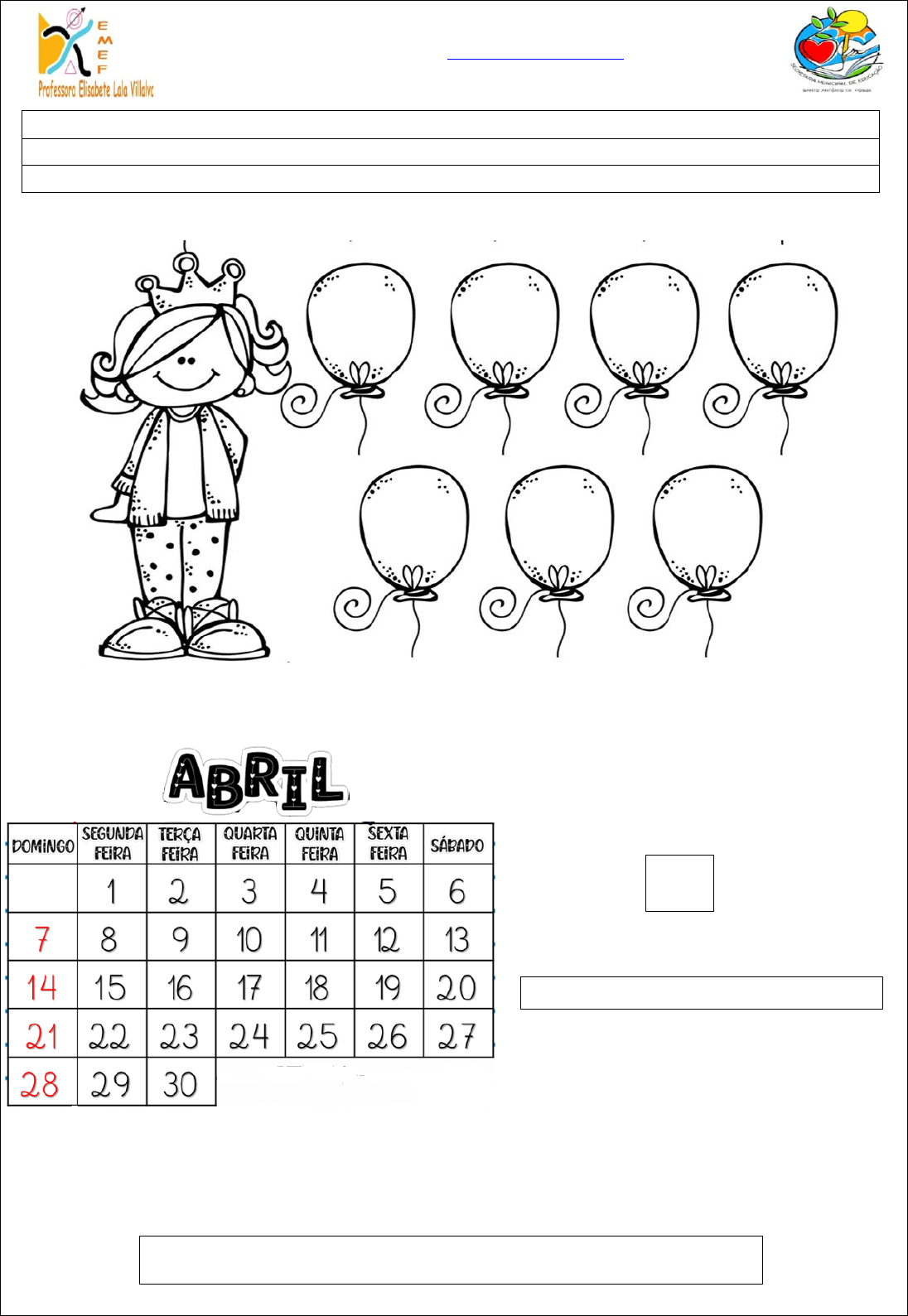 E.M.E.F. “PROFESSORA ELISABETE LALA VILLALVA” Rua: Cynira Marques Cesar, 433 – Bairro São Judas Tadeu Santo Antônio de Posse – SP Tel./Fax (19) 3896-3699 – E-mail:daycamargo2021@gmail.com Ato de Criação: Portaria D.E.R.M.M. de 16/07/2004, Publicada no D.O.E. em 17/07/2007, Seção I, Pág.99. Obs. A partir de 18/05/2007, Lei Municipal 2240 passou a ser EMEF “Profª Elisabete Lala Villalva”. 1. DITADO DOS NÚMEROS 2. VAMOS AGORA PRESTAR ATENÇÃO NO CALENDÁRIO E RESPONDER AS QUESTÕES ABAIXO: A- QUANTOS DIAS TEM O MÊS DE ABRIL? B- QUE DIA DA SEMANA CAIRÁ DIA 11 DE ABRIL? C- PINTE TODOS OS DIAS QUE CAIRÃO NOS SÁBADOS DE ABRIL. D- PINTE DE VERDE O DIA QUE ESTAMOS REALIZANDO ESSA ATIVIDADE. E- O PRIMEIRO DIA DESSE MÊS CAIU EM QUE DIA DA SEMANA? AVALIAÇÃO DE MATEMÁTICA - 2º ANO NOME: Nº PROFESSORA: DANIELE FERNANDES DATA: / 04 / 2024 3. VAMOS CONTAR OS NÚMEROS. • CONTINUE A SEQUÊNCIA NUMÉRICA DE 2 EM 2 • CONTINUE A SEQUÊNCIA NUMÉRICA DE 3 EM 3 • CONTINUE A SEQUÊNCIA NUMÉRICA DE 5 EM 5 • CONTINUE A SEQUÊNCIA NUMÉRICA DE 10 EM 10 4. CONTAS DE SUBTRAÇÃO 5. CONTAS DE ADIÇÃO 6. PREENCHA A TABELA COM OS NÚMEROS QUE FALTAM: SUCESSORES E ANTECESSORES 7. OBSERVE OS NÚMEROS E COLOQUE OS SINAIS DE MAIOR, MENOR E IGUAL. SUCESSORES NÚMEROS ANTECESSORES 40 97 151 188 8. AS PROFESSORAS DANIELE E NÁDIA RESOLVERAM FAZER UMA PESQUISA PARA DESCOBRIREM QUAL BRINQUEDO PREFERIDO DAS DUAS TURMAS DO 2º ANO. ELAS COLETARAM OS DADOS E CONSTRUIRAM O SEGUINTE GRÁFICO. OBSERVE O GRÁFICO E RESPONDA: QUAL É O TÍTULO DO GRÁFICO? ________________________________________________ QUAL O BRINQUEDO QUE OS ALUNOS MAIS GOSTAM? _____________________________ E O BRINQUEDO QUE ELES MENOS GOSTAM? ____________________________________ SE JUNTARMOS O PIÃO E A BONECA QUANTOS VOTOS TEREMOS? __________________ 9. OBSERVE A TABELA DE VALORES DE UMA DETERMINADA LANCHONETE: PINTE A QUANTIA EXATA QUE DEVERÁ SER USADA PARA PAGAR CADA PRODUTO