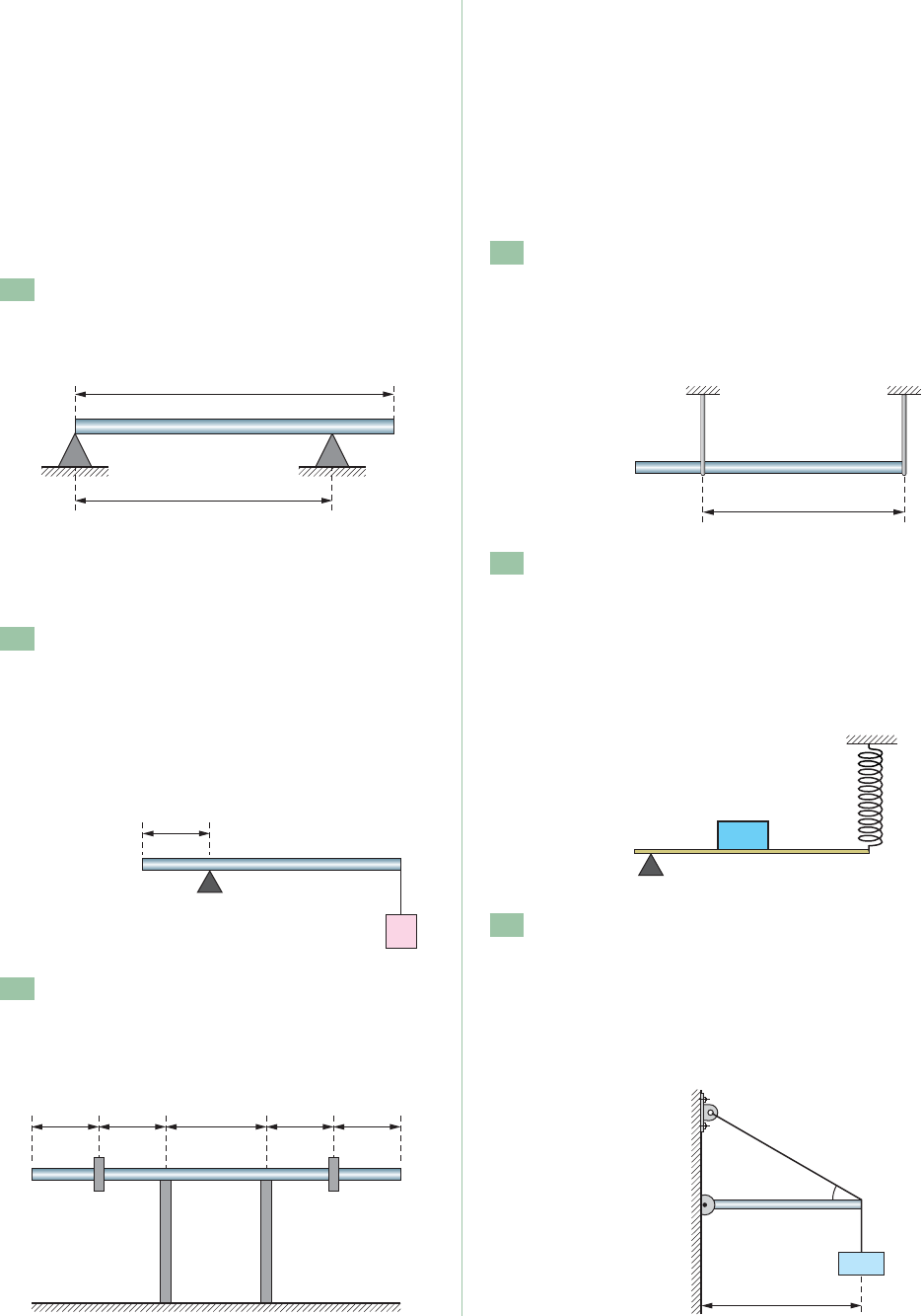 46 SIMULADÃO a) A força de atrito estático entre A e a superfície horizontal vale 196 N. b) A reação normal do plano sobre A, vale 196 N. c) Há uma força de 294 N puxando o bloco A para a direita. d) O bloco A não pode se mover porque não há for- ça puxando-o para a direita. e) O bloco B não pode se mover porque não há for- ça puxando-o para baixo. 253 (Unic-MT) A barra homogênea de peso P � 2 000 N está em equilíbrio sobre dois apoios. A força de reação no ponto B vale: a) 2 000 N c) 1 500 N e) 2 250 N b) 1 000 N d) 1 250 N 254 (Med. Catanduva-SP) Uma barra AB, homogê- nea e de secção reta e uniforme, de 80 cm de com- primento e peso 50 N, está apoiada num ponto O, como mostra a figura. O peso Q é de 100 N. Para o equilíbrio horizontal da barra AB, deve-se suspender à extremidade A um peso de: a) 150 N b) 250 N c) 350 N d) 500 N e) 400 N 255 (UEL-PR) Numa academia de ginástica, dois estu- dantes observam uma barra apoiada em dois pon- tos e que sustenta duas massas de 10 kg, uma de cada lado, conforme a figura a seguir. a) 1,0 � 102 N b) 2,0 � 102 N c) 3,0 � 102 N d) 4,0 � 102 N e) 5,0 � 102 N Após consultarem o professor, obtiveram a informa- ção de que a massa da barra era 12 kg. Dessa for- ma, concluíram que seria possível acrescentar em um dos lados da barra, junto à massa já existente e sem que a barra saísse do equilíbrio, uma outra massa de, no máximo: a) 10 kg c) 20 kg e) 30 kg b) 12 kg d) 24 kg 256 (Unitau-SP) Uma barra homogênea de 1,0 m de comprimento e peso igual a 30 N está suspensa por dois fios verticais, conforme a figura, manten- do-se na posição horizontal. As trações T1 e T2 nos fios 1 e 2 valem, respectivamente: a) 5 N; 15 N b) 10 N; 20 N c) 20 N; 20 N d) 20 N; 10 N e) 15 N; 15 N 257 (Fatec-SP) Uma tábua homogênea e uniforme de 3 kg tem uma de suas extremidades sobre um apoio e a outra é sustentada por um fio ligado a uma mola, conforme a figura. Sobre a tábua encon- tra-se uma massa m � 2 kg. Considerando a acele- ração da gravidade g � 10 m/s2, podemos afirmar que, com relação à força F → que a mola exerce: a) F � 50 N b) F � 25 N c) F � 25 N d) F 25 N e) F → ∞ 258 (Acafe-SC) A barra OP, uniforme, cujo peso é 1,0 � 102 N, pode girar livremente em torno de O. Ela sustenta, na extremidade P, um corpo de peso 2,0 � 102 N. A barra é mantida em equilíbrio, em posição horizontal, pelo fio de sustentação PQ. Qual é o valor da força de tração no fio? A B 10 m 8 m A B 20 cm Q O 40 cm 40 cm 40 cm 40 cm60 cm 0,75 m 1 2 m 1,0 m A O P 30° 2,0 � 102 N SIMULADÃO 47 (01) se os meninos sentarem nas extremidades da prancha, só poderá existir equilíbrio se Carmelita sentar-se em um determinado ponto da prancha do lado de Juquinha; (02) se Carmelita sentar-se junto com Zezinho, bem próximos da extremidade da prancha, não existirá uma posição em que Juquinha consiga equilibrar a gangorra; (04) se Juquinha sentar-se, no lado esquerdo, a 1 m do centro da gangorra, Zezinho terá que se sentar no lado direito e a 1,6 m do centro, para a gangorra ficar em equilíbrio; (08) se Juquinha sentar-se na extremidade esquerda (a 2 m do centro) e Zezinho na extremidade direita, haverá equilíbrio se Carmelita sentar-se a 1 m à di- reita do suporte; 259 (Cefet-PR) Um menino que pesa 200 N, cami- nha sobre uma viga homogênea, de secção cons- tante, peso de 600 N e apoiada simplesmente nas arestas de dois corpos prismáticos. Como ele cami- nha para a direita, é possível prever que ela rodará em torno do apoio B. A distância de B em que tal fato acontece, é, em metros, igual a: a) 0,5 b) 1 c) 1,5 d) 2 e) 3 260 (ITA-SP) Uma barra homogênea de peso P tem uma extremidade apoiada num assoalho na horizon- tal e a outra numa parede vertical. O coeficiente de atrito com relação ao assoalho e com relação à pa- rede são iguais a µ. Quando a inclinação da barra com relação à vertical é de 45º, a barra encontra-se na iminência de deslizar. Podemos, então, concluir que o valor de µ é: a) 1 � 2 2 ⎛ ⎝ ⎜ ⎞ ⎠ ⎟ d) 2 2 b) 2 � 1 e) 2 � 2 c) 1 2 261 (MACK-SP) Após uma aula sobre o “Princípio das Alavancas”, alguns estudantes resolveram testar seus conheci- mentos num playground, determinando a massa de um deles. Para tanto, quatro sentaram-se estrategi- camente na gangorra homogênea da ilustração, de secção transversal constante, com o ponto de apoio em seu centro, e atingiram o equilíbrio quando se encontravam sentados nas posições indicadas na fi- gura. Dessa forma, se esses estudantes assimilaram corretamente o tal princípio, chegaram à conclusão de que a massa desconhecida, do estudante senta- do próximo à extremidade B, é: a) indeterminável, sem o conhecimento do compri- mento da gangorra. b) 108 kg c) 63 kg d) 54 kg e) 36 kg 262 (UFGO) Três crianças, Juquinha, Carmelita e Zezinho, de massas 40, 30 e 25 kg, respectivamente, estão brincando numa gangorra. A gangorra possui uma prancha homogênea de 4 m e massa de 20 kg. Considerando que o suporte da gangorra seja centra- lizado na prancha e que g � 10 m/s2, pode-se afirmar: A B 5 m 3 m L B 1,0 m A L 1,5 m 2,0 m 0,5 m 54 kg 36 kg 27 kg x 48 SIMULADÃO a b a) F � 1 000 N d) F � 3 500 N b) F � 2 500 N e) F � 5 000 N c) F � 3 000 N 265 (Fatec-SP) Um homem de massa 80 kg suspen- de, com velocidade constante, um corpo de massa (16) numa situação de equilíbrio da gangorra, com as três crianças sentadas sobre a prancha, a força normal que o suporte faz sobre a prancha é de 950 N; (32) com Juquinha e Zezinho sentados nas extremi- dades da prancha, a gangorra tocará no chão no lado de Juquinha. Nesse caso, Zezinho ficará em equilíbrio porque a normal, que a prancha faz sobre ele, anula seu peso. 263 (MACK-SP) Por erro de fabricação, uma balan- ça de pratos, A e B, idênticos apresenta os braços com comprimentos diferentes (�1 e �2). Ao ser utili- zada por Rubinho na d