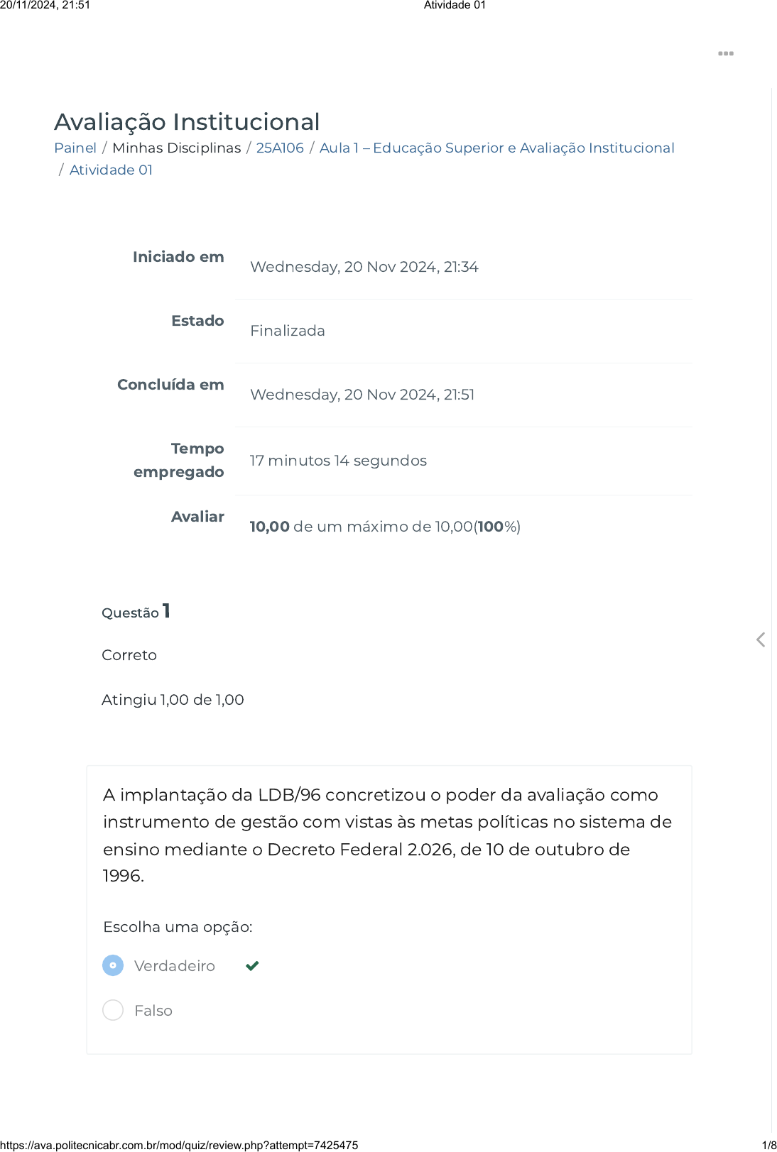 Painel / Minhas Disciplinas / 25A106 / Aula 1 – Educação Superior e Avaliação Institucional / Atividade 01 Avaliação Institucional Iniciado em Wednesday, 20 Nov 2024, 21:34 Estado Finalizada Concluída em Wednesday, 20 Nov 2024, 21:51 Tempo empregado 17 minutos 14 segundos Avaliar 10,00 de um máximo de 10,00(100%) Questão 1 Correto Atingiu 1,00 de 1,00 A implantação da LDB/96 concretizou o poder da avaliação como instrumento de gestão com vistas às metas políticas no sistema de ensino mediante o Decreto Federal 2.026, de 10 de outubro de 1996. Escolha uma opção: Verdadeiro Falso 20/11/2024, 21:51 Atividade 01 https://ava.politecnicabr.com.br/mod/quiz/review.php?attempt=7425475 1/8 https://ava.politecnicabr.com.br/my/ https://ava.politecnicabr.com.br/my/ https://ava.politecnicabr.com.br/course/view.php?id=989 https://ava.politecnicabr.com.br/course/view.php?id=989#section-2 https://ava.politecnicabr.com.br/mod/quiz/view.php?id=26673 https://ava.politecnicabr.com.br/ Questão 2 Correto Atingiu 1,50 de 1,50 Com relação ao papel do Estado e a expansão da Educação Superior podemos a�rmar que: Escolha uma opção: a. Os modelos econômicos atuais, o Estado age descompromissadamente e não assume seus papéis, ou, ainda pior, exime-se de suas responsabilidades, entre elas a de educação e de transformação social. b. A crise dos modelos econômicos atuais, o Estado age descompromissadamente e não assume seus papéis, ou, ainda pior, exime-se de suas responsabilidades, entre elas a de educação e de transformação social. c. Os modelos econômicos atuais faz com que o Estado não assuma o seu papel e ainda exime-se de suas responsabilidades, entre elas a de educação e de transformação social. d. A crise dos modelos anteriores ao século XXI afetaram o Estado que age descompromissadamente e não assume seus papéis, ou, ainda pior, exime-se de suas responsabilidades, entre elas a de educação e de transformação social. 20/11/2024, 21:51 Atividade 01 https://ava.politecnicabr.com.br/mod/quiz/review.php?attempt=7425475 2/8 https://ava.politecnicabr.com.br/ Questão 3 Correto Atingiu 1,00 de 1,00 A Avaliação Institucional pode ser compreendida, então, como meio propício para proporcionar e instigar discussões e re�exões, consubstanciando-se em compromisso ético e individualizado para gestão e ação da Instituição de Educação Superior, pois objetiva seu aperfeiçoamento Escolha uma opção: Verdadeiro Falso 20/11/2024, 21:51 Atividade 01 https://ava.politecnicabr.com.br/mod/quiz/review.php?attempt=7425475 3/8 https://ava.politecnicabr.com.br/ Questão 4 Correto Atingiu 2,00 de 2,00 Uma Instituição de Educação Superior necessita repensar constantemente suas___________, seus___________, seus ___________, sua___________, en�m, todo o conjunto que a constitui como instituição e, para isso, é possível apontar que o melhor caminho é a Avaliação Institucional, pois, em tese, rompe com visões centralizadoras e autoritárias. Escolha uma opção: a. práticas; princípios; valores; missão. b. metas; valores; prestígios; dedicação. c. práticas; princípios; valores; metas. d. metas; valores; prestígios; ação. 20/11/2024, 21:51 Atividade 01 https://ava.politecnicabr.com.br/mod/quiz/review.php?attempt=7425475 4/8 https://ava.politecnicabr.com.br/ Questão 5 Correto Atingiu 1,00 de 1,00 A Educação Superior enfrenta muitos desa�os e o maior deles é participar do processo de desenvolvimento econômico e social da realidade em que está inserida. Escolha uma opção: Questão 6 Correto Atingiu 1,00 de 1,00 Avaliação e competência – dois termos que, analisados separadamente, trazem uma multiplicidade de signi�cados e que, juntos, provocam diferentes interpretações. Escolha uma opção: Verdadeiro Falso Verdadeiro Falso 20/11/2024, 21:51 Atividade 01 https://ava.politecnicabr.com.br/mod/quiz/review.php?attempt=7425475 5/8 https://ava.politecnicabr.com.br/ Questão 7 Correto Atingiu 1,50 de 1,50 De acordo com Ristoff (1994), as primeiras discussões sobre Avaliação Institucional no Brasil têm início por volta de 1982, por iniciativa do(a): Escolha uma opção: a. Grupo Executivo para a Reformulação do Ensino Superior (Geres) b. Associação Brasileira de Reitores das Universidades Estaduais e Municipais (Abruem) c. Programa de Avaliação da Reforma Universitária (Paru) d. Associação Nacional de Docentes do Ensino Superior (Andes) 20/11/2024, 21:51 Atividade 01 https://ava.politecnicabr.com.br/mod/quiz/review.php?attempt=7425475 6/8 https://ava.politecnicabr.com.br/ Questão 8 Correto Atingiu 1,00 de 1,00 As instituições de educação estão construindo a concepção de que avaliar é um processo de mão dupla que, quando bem conduzido, proporciona o autoconhecimento e na mesma proporção, um feedback das muitas ações e relações vividas no interior das instituições. Escolha uma opção: Verdadeiro Falso Entre em Contato https://www.politecnicabr.com.br 0800 084 2627 0800 084 2627 Links Úteis Dicas da nossa Diretora Acadêmica Planner de Estudos Declaração de Matrícula Orientações do AVA Abertura de Ticket Fale com o Tutor Cronograma de Estudos Manual de Estágio Manual de Competência Siga-nos nas redes sociais 20/11/2024, 21:51 Atividade 01 https://ava.politecnicabr.com.br/mod/quiz/review.php?attempt=7425475 7/8 https://www.politecnicabr.com.br/ https://soundcloud.com/user-501638417/sets/escola-politecnica-brasileira https://soundcloud.com/user-501638417/sets/escola-politecnica-brasileira https://storage.googleapis.com/sirius-pubstore/semestre_plannerdeestudo%20poli.pdf https://storage.googleapis.com/sirius-pubstore/semestre_plannerdeestudo%20poli.pdf https://storage.googleapis.com/sirius-pubstore/declaracao_matricula.pdf https://storage.googleapis.com/sirius-pubstore/declaracao_matricula.pdf https://storage.googleapis.com/sirius-pubstore/orientacoes_ava.pdf https://storage.googleapis.com/sirius-pubstore/or