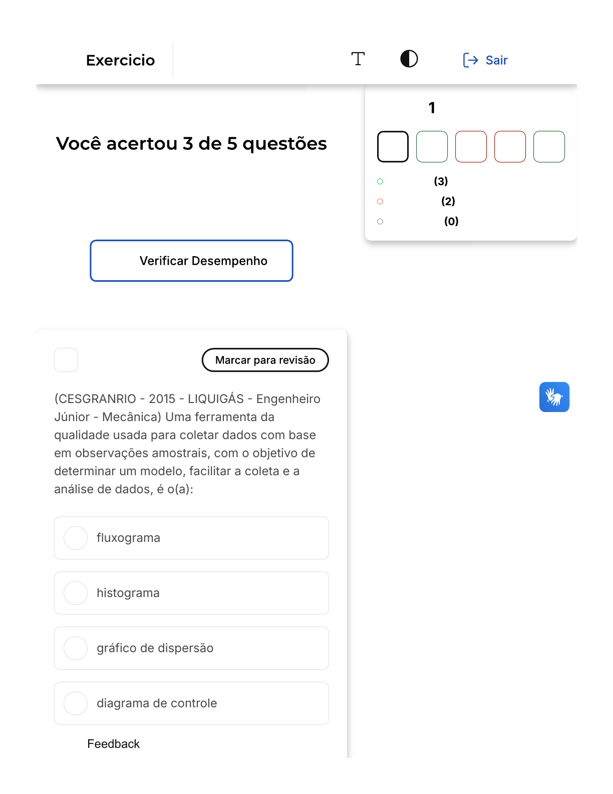 Verifique o seu desempenho e continue treinando! Você pode refazer o exercício quantas vezes quiser. A B C D 1 �CESGRANRIO � 2015 � LIQUIGÁS � Engenheiro Júnior - Mecânica) Uma ferramenta da qualidade usada para coletar dados com base em observações amostrais, com o objetivo de determinar um modelo, facilitar a coleta e a análise de dados, é o(a): fluxograma histograma gráfico de dispersão diagrama de controle Questão de 5 Corretas Incorretas Em branco 1 2 3 4 5 Conteúdo Feedback Firefox https://estacio.saladeavaliacoes.com.br/exercicio/673e3c8093e529c49d... 1 of 8 20/11/2024, 16:54 E folha de verificação Parabéns, você selecionou a alternativa correta. Confira o gabarito comentado! Folhas de verificação são formulários que podem ser divididos em tabelas, planilhas ou quadros com objetivo de coletar dados de processos de maneira estruturada. Registram itens que devem ser controlados, e podem também apontar, com facilidade, a ocorrência de não-conformidades. 2 �Quadrix - 2015 � CRF�RJ � Agente Administrativo) A Gestão da Qualidade visa à excelência dos serviços. Uma de suas ferramentas é o Diagrama de Pareto, utilizado pelo italiano Vilfredo Pareto. Esse diagrama é construído baseado em uma fonte de pesquisas de dados ou em folhas de verificação para detectar o problema. Está baseado no Princípio de Pareto, ou regra dos 80/20, que significa que 80% dos problemas são ocasionados por 20% das causas, ou seja, são poucas causas que originam a maioria dos problemas. Para construí-lo, é utilizado o gráfico que: Feedback Firefox https://estacio.saladeavaliacoes.com.br/exercicio/673e3c8093e529c49d... 2 of 8 20/11/2024, 16:54 A B C D E destaca em curvas as causas reais dos problemas. sugere a mudança de quadro de pessoal ou seu melhor treinamento para melhoria do trabalho individual e/ ou coletivo coloca em ordem os problemas e suas frequências do maior para o menor, a fim de dar prioridade àquele que deverá ser resolvido com maior urgência. padroniza rotinas a fim de sanar os problemas. aponta a análise das situações problemáticas e a solução imediata para elas. Parabéns, você selecionou a alternativa correta. Confira o gabarito comentado! O valor total dos itens deve ser calculado, e os itens deverão ser ordenados do maior para o menor. Posteriormente, deverá ser criado um gráfico de barras, adicionando uma linha de porcentgame acumulada para determinar o ponto de equilíbrio de 80%. Feedback Firefox https://estacio.saladeavaliacoes.com.br/exercicio/673e3c8093e529c49d... 3 of 8 20/11/2024, 16:54 A B C D E 3 Produção e Produtividade são as palavras mais utilizadas na operação de uma empresa. Neste sentido fazendo uma relação entre produção e produtividade, podemos afirmar que: a produção é uma medida de resultado; já a produtividade é uma medida de desempenho. A partir do texto, pode-se afirmar que: I � Produção significa ter um volume de bens produzidos. II � Produtividade significa a velocidade com que estes bens foram obtidos. III � Produção vai refletir a eficiência. IV � Produtividade vai refletir a capacidade. V � Produtividade está ligada ao método. É correto o que se afirma em: I, II, III e IV I, II e V apenas II, III e IV apenas II, IV e V apenas III, IV e V apenas Opa! A alternativa correta é a letra Feedback Firefox https://estacio.saladeavaliacoes.com.br/exercicio/673e3c8093e529c49d... 4 of 8 20/11/2024, 16:54 A B C D E B. Confira o gabarito comentado! I, II e V apenas estão corretas O item III está errado, pois a produção vai refletir a capacidade, e o item IV está errado, pois a produtividade vai refletir a eficiência. 4 Como se chama, em qualidade, a primeira impressão de um cliente sobre a qualidade de um produto: Serviço de atendimento ao consumidor Momento da verdade Contato prévio Conformidade Apresentação Feedback Firefox https://estacio.saladeavaliacoes.com.br/exercicio/673e3c8093e529c49d... 5 of 8 20/11/2024, 16:54 A B Opa! A alternativa correta é a letra B. Confira o gabarito comentado! Conceito da área de qualidade sobre o primeiro contato do cliente com o rproduto ou serviço. Conhecido como Momento da Verdade ----- 5 �FCC � 2019 � Prefeitura de Recife - PE � Analista de Planejamento, Orçamento e Gestão) O denominado Diagrama de Pareto constitui uma ferramenta que: e baseia nos pilares: planejamento, ação, controle e avaliação, todos eles permeados pelo fomento ao comprometimento individual a partir do fortalecimento das lideranças. se baseia em quatro categorias de problemas, situados na parte operacional, denominados 4M: método; mão de obra; material e máquina. Feedback Firefox https://estacio.saladeavaliacoes.com.br/exercicio/673e3c8093e529c49d... 6 of 8 20/11/2024, 16:54 C D E repensa conceitos, métodos e sistemas; primeiro define o que precisa ser feito e somente depois se preocupa em como fazer. parte da insatisfação com o estado atual das coisas, denominado estado da arte, redefinindo as dinâmicas da organização. considera que nem todos os itens merecem a mesma atenção da administração, eis que 80% do volume de problemas é constituído por apenas 20% de eventos causadores. Parabéns, você selecionou a alternativa correta. Confira o gabarito comentado! O objetivo da análise de Pareto é separar os ¿poucos vitais¿ (itens muito importantes) dos ¿muitos triviais¿. A maneira mais fácil para fazer isso é localizar o que chamamos de ¿ponto de equilíbrio¿ na inclinação da curva de porcentagem. Ele é visualizado como uma quebra na inclinação da curva e representa o limite entre os poucos vitais e muitos úteis (geralmente próximo de 80%�. Feedback Firefox https://estacio.saladeavaliacoes.com.br/exercicio/673e3c8093e529c49d... 7 of 8 20/11/2024, 16:54 Feedback Firefox https://estacio.saladeavaliacoes.com.br/exercicio/673e3c8093e529c49d... 8 of 8 20/11/2024, 16:54