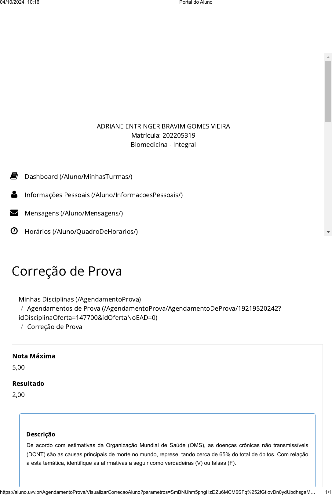 ADRIANE ENTRINGER BRAVIM GOMES VIEIRA Matrícula: 202205319 Biomedicina - Integral Dashboard (/Aluno/MinhasTurmas/) Informações Pessoais (/Aluno/InformacoesPessoais/) Mensagens (/Aluno/Mensagens/) Horários (/Aluno/QuadroDeHorarios/) Minhas Disciplinas (/AgendamentoProva) / Agendamentos de Prova (/AgendamentoProva/AgendamentoDeProva/19219520242? idDisciplinaOferta=147700&idOfertaNoEAD=0) / Correção de Prova Correção de Prova Nota Máxima 5,00 Resultado 2,00 Descrição De acordo com estimativas da Organização Mundial de Saúde (OMS), as doenças crônicas não transmissíveis (DCNT) são as causas principais de morte no mundo, representando cerca de 65% do total de óbitos. Com relação a esta temática, identifique as afirmativas a seguir como verdadeiras (V) ou falsas (F). 04/10/2024, 10:16 Portal do Aluno https://aluno.uvv.br/AgendamentoProva/VisualizarCorrecaoAluno?parametros=SmBNUhm5phgHzDZu6MCM6SFq%252fGtIovDn0ydUbdhsgaM… 1/11 https://aluno.uvv.br/Aluno/MinhasTurmas/ https://aluno.uvv.br/Aluno/InformacoesPessoais/ https://aluno.uvv.br/Aluno/Mensagens/ https://aluno.uvv.br/Aluno/QuadroDeHorarios/ https://aluno.uvv.br/AgendamentoProva https://aluno.uvv.br/AgendamentoProva https://aluno.uvv.br/AgendamentoProva/AgendamentoDeProva/19219520242?idDisciplinaOferta=147700&idOfertaNoEAD=0 https://aluno.uvv.br/AgendamentoProva/AgendamentoDeProva/19219520242?idDisciplinaOferta=147700&idOfertaNoEAD=0 https://aluno.uvv.br/AgendamentoProva/AgendamentoDeProva/19219520242?idDisciplinaOferta=147700&idOfertaNoEAD=0 ( ) A hipertensão arterial, doenças isquêmicas do coração, acidentes vasculares cerebrais, cânceres, tuberculose e diabetes são as DCNT mais comuns. ( ) O tabagismo, alimentação inadequada, álcool e inatividade física estão entre os fatores de risco modificáveis, enquanto que sexo, idade e herança genética estão entre os fatores de risco não modificáveis. ( ) Condições sócioeconômicas, culturais e ambientais são determinantes na história natural das DCNT. ( ) Crescimento da renda, industrialização e mecanização da produção, urbanização, maior acesso a alimentos em geral, incluindo os processados, e globalização de hábitos não saudáveis produziram rápida transição nutricional, expondo a população cada vez mais ao risco de doenças crônicas não transmissíveis. ( ) O stress e o sedentarismo estão entre os principais fatores de risco para o adoecimento por hipertensão. A F – V – V – V – V. B V – V – V – F – F. C V – F – F – V – F. D F – F – V – V – F. E V – V– V – F – V. Nota 0,00 Descrição Um grupo de pessoas saudáveis é acompanhado por um período de vários anos para observação acerca do desenvolvimento de uma doença. O estudo é observacional e prospectivo. Os resultados são descritos em termos de risco relativo. Que tipo de estudo é esse? 04/10/2024, 10:16 Portal do Aluno https://aluno.uvv.br/AgendamentoProva/VisualizarCorrecaoAluno?parametros=SmBNUhm5phgHzDZu6MCM6SFq%252fGtIovDn0ydUbdhsgaM… 2/11 A Caso-controle. B Meta-análise. C Coorte. D Estudo de caso. E Transversal. Nota 0,00 Descrição Medir saúde e doença é fundamental para a prática da Epidemiologia Descritiva. O conhecimento do comportamento das variáveis no aparecimento das doenças é fundamental para o planejamento em saúde, pois permite uma melhor utilização dos recursos através da identi�cação de problemas prioritários a população. A respeito do assunto, identi�que as a�rmativas como verdadeiras (V) ou falsas (F), sobre os possíveis usos da epidemiologia descritiva. 1 - ( ) Revela os padrões de ocorrência de doenças ou agravos à saúde em uma população, de acordo com características, particularmente, relacionadas à pessoa, lugar e tempo. 2 - ( ) Com o per�l epidemiológico de uma população podemos entender todos os problemas de saúde existentes numa população. 3 - ( ) Pode-se identi�car onde, quando e sobre quem ocorre uma doença/agravo. 4 - ( ) Uma doença de variação sazonal está diretamente ligada às estações do ano, tendo-se como exemplo algumas arboviroses como Dengue, Zika e Chikungunya. 5 - ( ) Considera-se endemia uma doença/agravo que apresente uma evolução temporal progressivamente crescente e inesperada do seu coe�ciente de incidência, ultrapassando valores limítrofes pré-estabelecidos 04/10/2024, 10:16 Portal do Aluno https://aluno.uvv.br/AgendamentoProva/VisualizarCorrecaoAluno?parametros=SmBNUhm5phgHzDZu6MCM6SFq%252fGtIovDn0ydUbdhsgaM… 3/11 A V – F – V – V – F. B V – V – V – V – F. C V – V – F– F – V. D F – F – V – V – F. E F – V – F –V – V. Nota 0,50 Descrição A epidemiologia é o ramo das ciências que estuda, na população, a ocorrência, a distribuição e os fatores determinantes dos eventos relacionados com a saúde (PEREIRA, 2008). Possui como objetivo geral a redução dos problemas de saúde da população. Para isso, é necessário conhecimento sobre distribuição das doenças, dos fatores que determinam esta distribuição e das possibilidades de êxito com as intervenções realizadas. Assim, assinale abaixo as alternativas que representam os usos da epidemiologia. I. A epidemiologia permite realizar o diagnóstico de saúde de uma população. II. O objetivo principal dessa ciência é o estudo das epidemias e sua propagação. III. Estudos epidemiológicos não permitem conhecer a história natural de uma doença. Após análise das a�rmações acima podemos concluir que A Apenas I está correta. B 04/10/2024, 10:16 Portal do Aluno https://aluno.uvv.br/AgendamentoProva/VisualizarCorrecaoAluno?parametros=SmBNUhm5phgHzDZu6MCM6SFq%252fGtIovDn0ydUbdhsgaM… 4/11 Apenas II estão corretas. C Apenas I e II estão corretas. D Apenas II e III estão corretas. E Todas estão corretas. Nota 0,00 Descrição Leavell & Clark, em 1965, propuseram o modelo da história natural da doença, composto por t