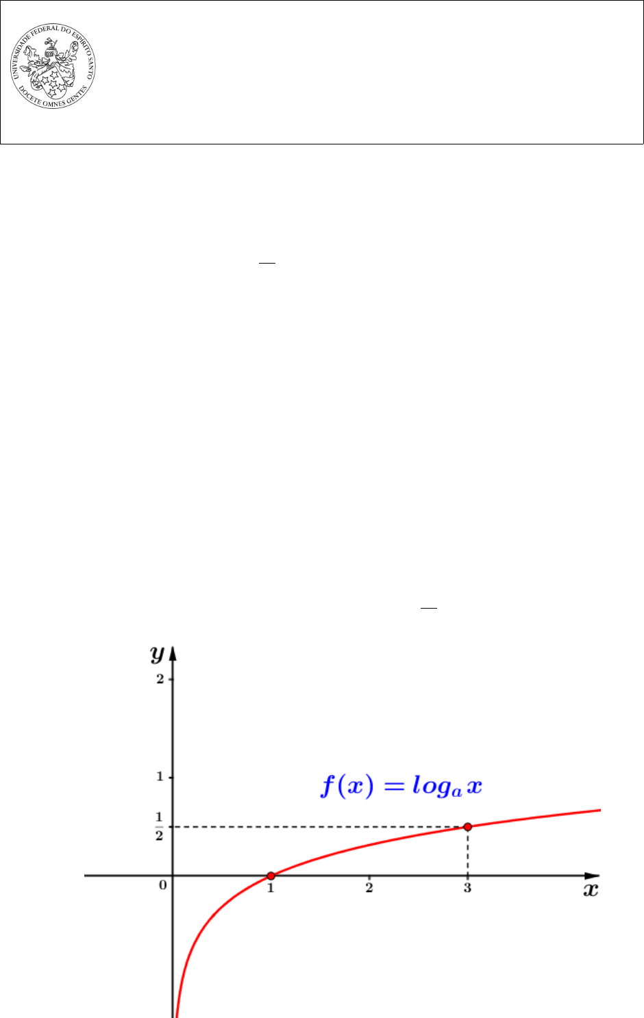 Universidade Federal do Esṕırito Santo Centro de Ciências Exatas, Naturais e da Saúde Cálculo de uma Variável - Prof. Paulo Henrique Souza da Costa Lista 4 - Função logaŕıtmica 1. Seja f(x) = log125 x. (a) Determine o valor de f(625). (b) Determine o valor de f ( 1 25 ) . 2. Seja f(x) = log25 x. (a) Determine o valor de f(125). (b) Determine o valor de f(625). 3. Seja f(x) = log243 x. (a) Determine o valor de f(1). (b) Determine o valor de f(27). 4. Dado o gráfico abaixo da função f(x) = loga x, onde a é um número real, a > 0 e a 6= 1, determine, e escreva na forma de fração, o valor de f ( 1 27 ) . 5. Sejam a, x e y números reais, onde a > 0 e a 6= 1, x > 0 e y > 0. (a) Se loga x = 7 e loga y = 20, determine o valor de loga ( x2 y ) . (b) Se loga x = 7 e loga y = 20, determine o valor de loga ( x y2 ) . (c) Se loga x = 12 e loga y = 5, determine o valor de loga ( x3 y ) . (d) Se loga x = 8 e loga y = 3, determine o valor de loga ( 3 √ x y2 ) . 6. Determine a(s) solução(ões) da equação: (a) 49x + 3.7x − 28 = 0. (b) 32x+1 − 31.3x + 36 = 0. 7. Determine o domı́nio da função f(x) = log21(−2x2 + x+ 6). 2