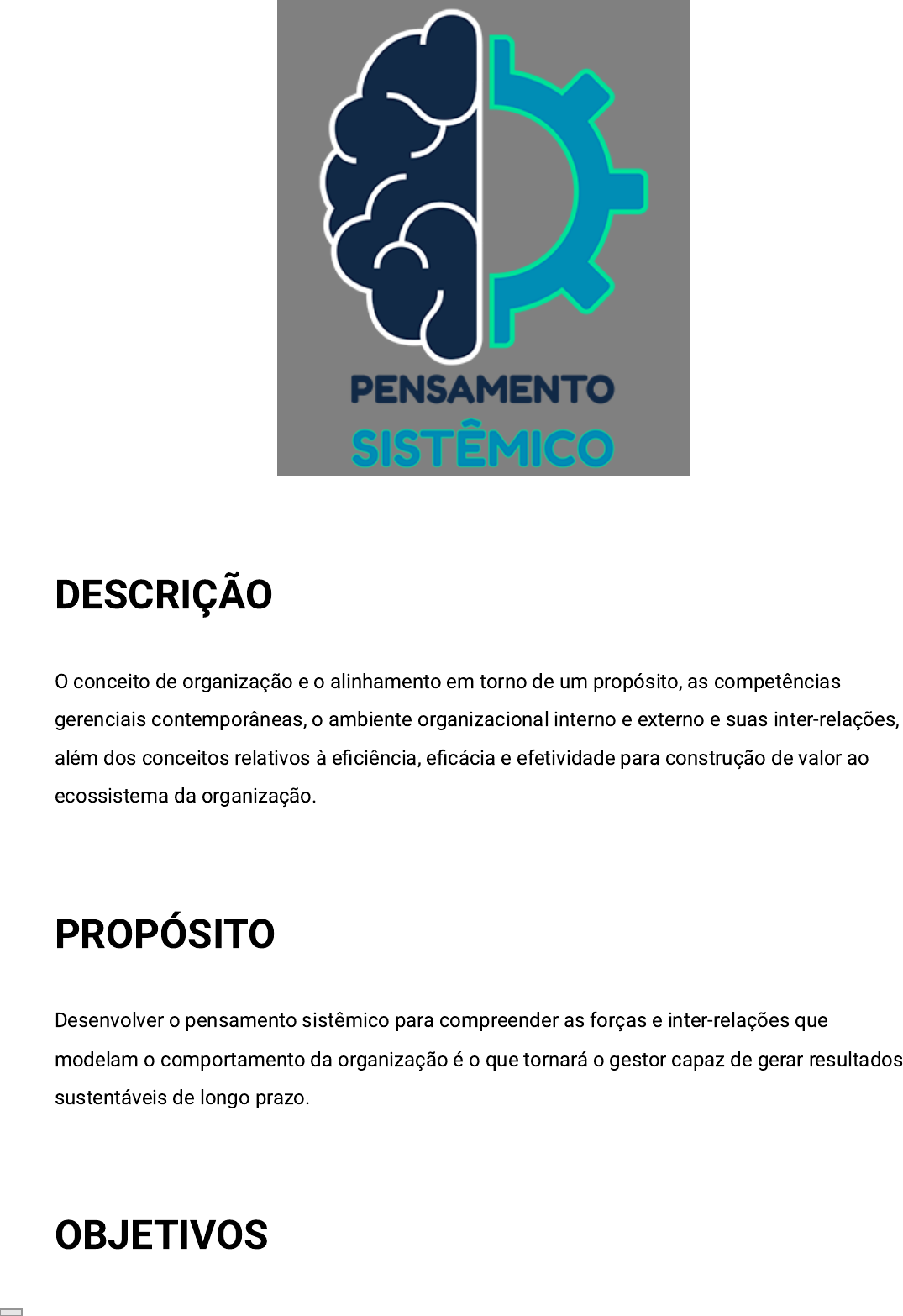 DESCRIÇÃO O conceito de organização e o alinhamento em torno de um propósito, as competências gerenciais contemporâneas, o ambiente organizacional interno e externo e suas inter-relações, além dos conceitos relativos à eficiência, eficácia e efetividade para construção de valor ao ecossistema da organização. PROPÓSITO Desenvolver o pensamento sistêmico para compreender as forças e inter-relações que modelam o comportamento da organização é o que tornará o gestor capaz de gerar resultados sustentáveis de longo prazo. OBJETIVOS MÓDULO 1 Identificar os desafios inerentes à atuação do gestor MÓDULO 2 Apresentar a dinâmica do universo organizacional MÓDULO 3 Compreender a importância de se construir valor para os stakeholders MÓDULO 1 Identificar os desafios inerentes à atuação do gestor INTRODUÇÃO A complexidade do mundo atual e o cenário em que estão inseridas as organizações contemporâneas exigem uma reflexão sobre o que pode ser considerado o estado da arte em gestão. O novo século surgiu trazendo questionamentos sobre o modelo tradicional e mecanicista, concebido a partir da influência da ciência positivista cartesiana. javascript:void(0) CARTESIANA O termo cartesiano vem de René Descartes, filósofo, físico e matemático, que introduziu na ciência um método de pensamento, cuja principal característica é a análise por meio da divisão, decomposição e segmentação das partes que compõem o todo. Ainda que o filósofo tenha contribuído de maneira significativa para o avanço das ciências e tecnologia, por outro lado, sua teoria foi a base para que se defendesse modelos de gestão a partir de uma visão fragmentada das organizações. (VERGARA, 2006) Foto: Por NicoElNino / Shutterstock.com. A principal consequência para a área de estudos organizacionais é que, em paralelo ao surgimento do novo século, nasceu a necessidade de se rever os modelos de gestão utilizados à época para que se pudesse garantir a sobrevivência da organização nesse ambiente mutável, incerto, ambíguo e turbulento. A crescente competitividade, as incertezas e os enormes desafios para a empresa moderna remodelam suas relações com todos os seus stakeholders, bem como as competências javascript:void(0) inerentes ao papel do gestor. No sentido de corresponder a essas expectativas e gerar resultados, o pensamento sistêmico surgiu como uma das competências centrais para enfrentar tais desafios, garantindo um novo olhar capaz de garantir sustentabilidade às organizações contemporâneas. Mas, o que de fato é pensamento sistêmico e onde podemos buscar referências para a sua fundamentação teórica e aplicação prática? É o que você vai aprender nesta trilha de conhecimento a partir de agora. STAKEHOLDERS Stakeholder é uma pessoa ou um grupo que legitima as ações de uma organização e que tem um papel direto ou indireto na gestão e resultados dessa mesma organização. Desta forma, um stakeholder pode ser afetado positivamente ou negativamente, dependendo das suas políticas e forma de atuação. Alguns exemplos de stakeholder de uma empresa podem ser os seus funcionários, gestores, gerentes, proprietários, fornecedores, concorrentes, ONGs, clientes, o Estado, credores, sindicatos e diversas outras pessoas ou empresas que estejam relacionadas com uma determinada ação ou projeto. CONCEITO DE ORGANIZAÇÃO Como toda ciência, a Administração também tem um objeto de estudo que lhe é próprio: A organização. Segundo Sobral e Peci (2013), em linhas gerais, organização é um sistema estruturado de pessoas que se reúnem em torno de objetivos comuns. Ela surge como uma resposta à necessidade dos indivíduos de alcançar metas que sozinhos jamais conseguiriam atingir pela própria variedade ou natureza do trabalho que precisam realizar. É um sistema que precisa ser organizado de maneira formal porque existem normas, regras e procedimentos que institucionalizam as atividades e processos das pessoas que nela trabalham. Foto: Por Rawpixel.com / Shutterstock.com Veja, a seguir, alguns exemplos de organização: Imagem: EnsineMe. O conceito de organização como sistema, cujas partes são articuladas para que se possa alcançar um objetivo comum, é uma aplicação da Teoria Geral dos Sistemas, desenvolvida pelo biólogo Ludwig Von Bertalanffy na década de 1930. A ideia do cientista era criar uma teoria que pudesse ser usada por várias outras áreas de conhecimento. javascript:void(0) Na gestão, a teoria nos ajuda a entender a organização como um sistema, um organismo vivo que interage com o ambiente em que está inserido. Ela deve ser analisada a partir do conceito de totalidade, levando-se em consideração o conjunto das partes que compõem o todo e se inter-relacionam mutuamente. (MORGAN, 1996). LUDWIG VON BERTALANFFY Karl Ludwig Von Bertalanffy (Viena, 19 de setembro de 1901 — Buffalo, Nova Iorque, 12 de junho de 1972) foi um biólogo austríaco. Foi o criador da Teoria Geral dos Sistemas, autor do livro de mesmo nome. Cidadão austríaco, desenvolveu seu trabalho científico na Áustria até 1948, quando se mudou para a América do Norte, trabalhando no Canadá e nos Estados Unidos. Foto: Wikipedia.org Imagem: EnsineMe. Se você observar, todo o trabalho é feito para que se possa alcançar objetivos previamente definidos. Quando os objetivos são alcançados, isto se reflete em resultados para as pessoas, os clientes, os acionistas, o governo, a sociedade, enfim, todos os grupos de interesse que compõem o universo organizacional. NO PASSADO, A ORGANIZAÇÃO PRIORIZAVA RESULTADOS MERAMENTE LUCRATIVOS. HOJE, SABE-SE QUE DEVEMOS ATENDER TODAS AS PARTES INTERESSADAS E GERAR RESULTADOS PLURALISTAS. De acordo com Sobral e Peci (2008), em um mundo cada vez mais competitivo, o sucesso de uma organização depende da qualidade da sua gestão. Independentemente do seu tamanho, porte ou segmento, sempre haverá um gestor no comand
