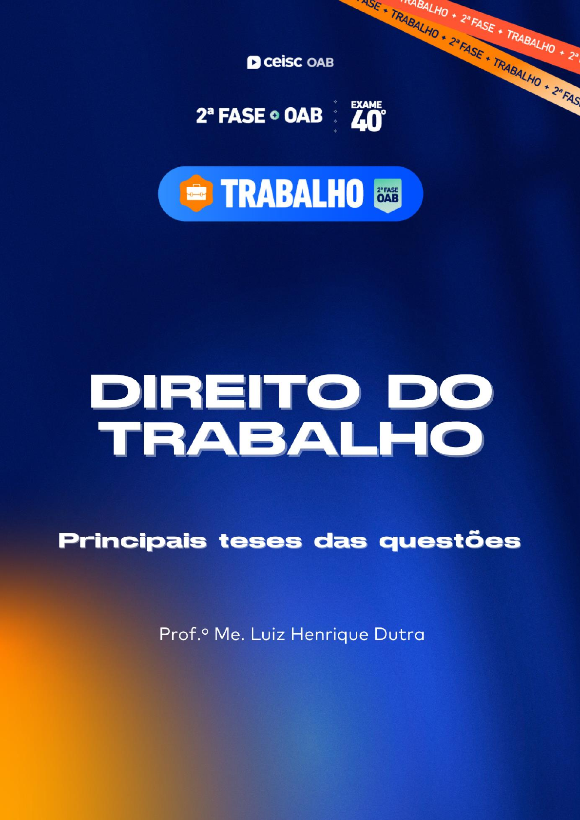 1 2 2ª FASE OAB | TRABALHO | 40º EXAME Principais teses das questões Prof. Luiz Henrique Dutra SUMÁRIO 1.Direito Material......................................................................................4 1.1 Sócio Retirante ...............................................................................4 1.2 Contrato de Trabalho .......................................................................4 1.3 Terceirização .................................................................................5 1.4 Jornada ........................................................................................5 1.5 Remuneração ................................................................................6 1.6 Descontos Salariais.........................................................................6 1.7 Adicionais .....................................................................................7 1.8 Rescisão .......................................................................................8 1.9 Estabilidade ................................................................................. 11 1.10 Prescrição ................................................................................. 12 1.11 Medicina e Segurança do Trabalho ........................................... 13 1.12 Acordo e Convenção Coletiva do Trabalho................................. 13 2. Direito Processual..............................................................................15 2.1 Inicial ......................................................................................... 15 2.2 Partes ........................................................................................ 15 2.3 Decisão Interlocutória .................................................................... 16 2.4 Audiência .................................................................................... 16 2.5 Provas ........................................................................................ 17 2.6 Ônus da Prova ............................................................................. 18 2.7 Sentença.................................................................................... 18 2.8 Acordo........................................................................................ 18 2.9 Honorários .................................................................................. 19 2.10 Recursos ................................................................................... 19 2.10 Execução .................................................................................. 21 https://ceisc-my.sharepoint.com/personal/cindy_ceisc_com_br/Documents/Área%20de%20Trabalho/Minha%20Pasta/39º%20EXAME/REGULAR/PROFº.%20LUIZ/E-book%20Principais%20teses%20das%20questões%20-%20Prof.%20Luiz%20Henrique%20⭐⭐⭐%20-%20DIAGRAMAÇÃO.docx#_Toc149322237 https://ceisc-my.sharepoint.com/personal/cindy_ceisc_com_br/Documents/Área%20de%20Trabalho/Minha%20Pasta/39º%20EXAME/REGULAR/PROFº.%20LUIZ/E-book%20Principais%20teses%20das%20questões%20-%20Prof.%20Luiz%20Henrique%20⭐⭐⭐%20-%20DIAGRAMAÇÃO.docx#_Toc149322238 https://ceisc-my.sharepoint.com/personal/cindy_ceisc_com_br/Documents/Área%20de%20Trabalho/Minha%20Pasta/39º%20EXAME/REGULAR/PROFº.%20LUIZ/E-book%20Principais%20teses%20das%20questões%20-%20Prof.%20Luiz%20Henrique%20⭐⭐⭐%20-%20DIAGRAMAÇÃO.docx#_Toc149322239 https://ceisc-my.sharepoint.com/personal/cindy_ceisc_com_br/Documents/Área%20de%20Trabalho/Minha%20Pasta/39º%20EXAME/REGULAR/PROFº.%20LUIZ/E-book%20Principais%20teses%20das%20questões%20-%20Prof.%20Luiz%20Henrique%20⭐⭐⭐%20-%20DIAGRAMAÇÃO.docx#_Toc149322240 https://ceisc-my.sharepoint.com/personal/cindy_ceisc_com_br/Documents/Área%20de%20Trabalho/Minha%20Pasta/39º%20EXAME/REGULAR/PROFº.%20LUIZ/E-book%20Principais%20teses%20das%20questões%20-%20Prof.%20Luiz%20Henrique%20⭐⭐⭐%20-%20DIAGRAMAÇÃO.docx#_Toc149322241 https://ceisc-my.sharepoint.com/personal/cindy_ceisc_com_br/Documents/Área%20de%20Trabalho/Minha%20Pasta/39º%20EXAME/REGULAR/PROFº.%20LUIZ/E-book%20Principais%20teses%20das%20questões%20-%20Prof.%20Luiz%20Henrique%20⭐⭐⭐%20-%20DIAGRAMAÇÃO.docx#_Toc149322242 https://ceisc-my.sharepoint.com/personal/cindy_ceisc_com_br/Documents/Área%20de%20Trabalho/Minha%20Pasta/39º%20EXAME/REGULAR/PROFº.%20LUIZ/E-book%20Principais%20teses%20das%20questões%20-%20Prof.%20Luiz%20Henrique%20⭐⭐⭐%20-%20DIAGRAMAÇÃO.docx#_Toc149322243 https://ceisc-my.sharepoint.com/personal/cindy_ceisc_com_br/Documents/Área%20de%20Trabalho/Minha%20Pasta/39º%20EXAME/REGULAR/PROFº.%20LUIZ/E-book%20Principais%20teses%20das%20questões%20-%20Prof.%20Luiz%20Henrique%20⭐⭐⭐%20-%20DIAGRAMAÇÃO.docx#_Toc149322244 https://ceisc-my.sharepoint.com/personal/cindy_ceisc_com_br/Documents/Área%20de%20Trabalho/Minha%20Pasta/39º%20EXAME/REGULAR/PROFº.%20LUIZ/E-book%20Principais%20teses%20das%20questões%20-%20Prof.%20Luiz%20Henrique%20⭐⭐⭐%20-%20DIAGRAMAÇÃO.docx#_Toc149322245 https://ceisc-my.sharepoint.com/personal/cindy_ceisc_com_br/Documents/Área%20de%20Trabalho/Minha%20Pasta/39º%20EXAME/REGULAR/PROFº.%20LUIZ/E-book%20Principais%20teses%20das%20questões%20-%20Prof.%20Luiz%20Henrique%20⭐⭐⭐%20-%20DIAGRAMAÇÃO.docx#_Toc149322246 https://ceisc-my.sharepoint.com/personal/cindy_ceisc_com_br/Documents/Área%20de%20Trabalho/Minha%20Pasta/39º%20EXAME/REGULAR/PROFº.%20LUIZ/E-book%20Principais%20teses%20das%20questões%20-%20Prof.%20Luiz%20Henrique%20⭐⭐⭐%20-%20DIAGRAMAÇÃO.docx#_Toc149322247 https://ceisc-my.sharepoint.com/personal/cindy_ceisc_com_br/Documents/Área%20de%20Trabalho/Minha%20Pasta/39º%20EXAME/REGULAR/PROFº.%20LUIZ/E-book%20Principais%20teses%20das%20questões%20-%20Prof.%20Luiz%20Henrique%20⭐⭐⭐%20-%20DIAGRAMAÇÃO.docx#_Toc149322248 https://ceisc-my.sharepoint.com/personal/cindy_ceisc_com_br/Documents/Área%20de%20Trabalho/Minha%20Pasta/39º%20EXAME/REGULAR/PROFº.%20LUIZ/E-book%20P