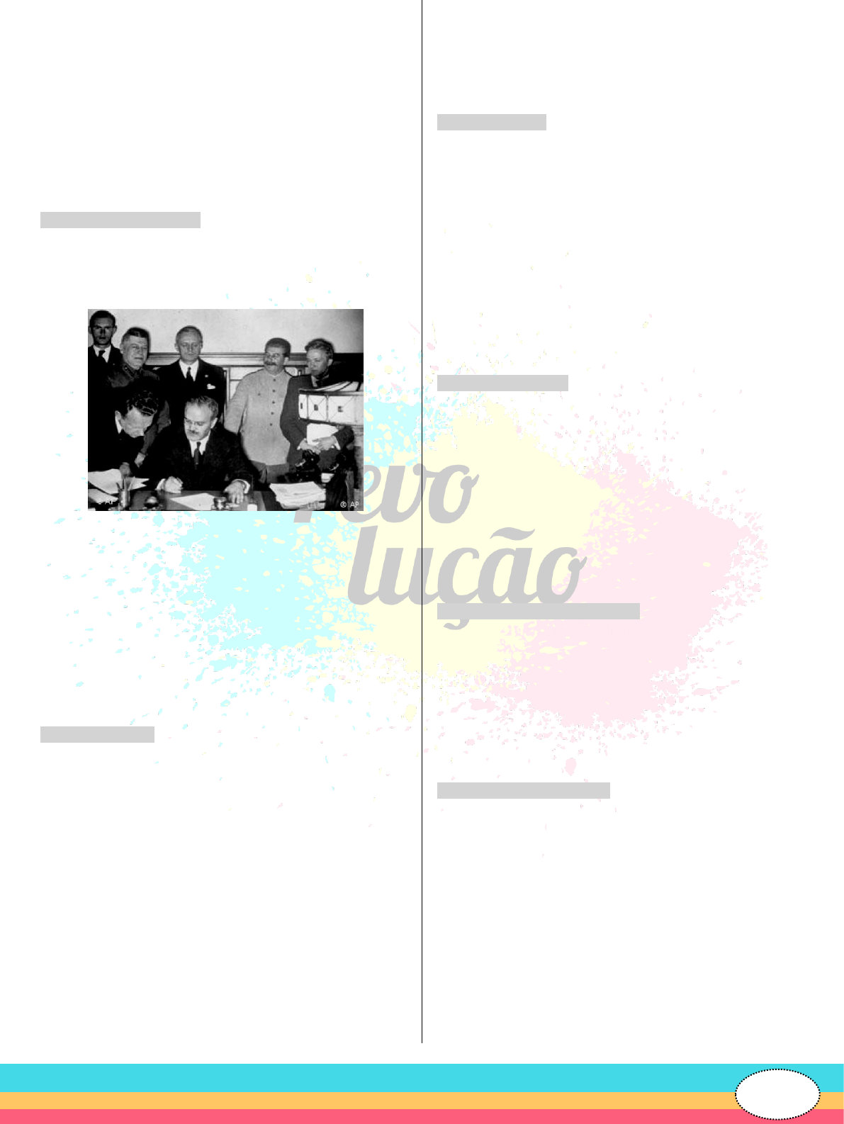 81 A charge russa de Mikhail Kupriyanov, Porfiry Krylov e Nikolai Sokolov retrata a) a expansão do Terceiro Reich alemão a partir do sucesso da guerra-relâmpago. b) o momento de equilíbrio de forças entre as tropas aliadas e as do Eixo. c) o esfacelamento do poderio alemão frente à coalizão con- tra o nazismo. d) o combate das tropas russas às forças nazistas na frente oriental. e) a invasão de territórios russos após a quebra do pacto de não agressão. 310. (UNCISAL AL/2017) Em 23 de agosto de 1939, Hitler e Stalin assinaram um pacto de não agressão. Alema- nha e União Soviética se comprometeram a não atacar uma à outra e se manter neutras se uma delas fosse atacada por uma terceira potência. Stalin (segundo à direita) na assinatura do pacto Disponível em: . Acesso em: 23 nov. 2016. A assinatura desse pacto teve importância crucial para a Segunda Guerra Mundial, pois, sem medo de ser ata- cado pela União Soviética, Hitler dá início à guerra a) invadindo a Polônia. b) conquistando a Suíça. c) ocupando os países baixos. d) invadindo os países bálticos. e) retomando a Alsácia-Lorena. 311. (UERJ/2020) O QUE É UMA NAÇÃO? O homem não é escravo nem de sua raça, nem de sua língua, nem de sua religião, nem do curso dos rios, nem da direção das cadeias de montanhas. Um grande agru- pamento de homens, de espírito sadio e coração ardo- roso, cria uma consciência moral que se chama nação. Enquanto puder provar sua força através dos sa- crifícios que exigem a abdicação dos indivíduos em prol de uma comunidade, essa consciência moral será legítima, terá o direito de existir. Se surgem dúvidas quanto a fronteiras, consultem-se as populações envol- vidas. Elas têm bem o direito de ter uma opinião na questão. ERNEST RENAN Conferência na Universidade de Sorbonne, 1882. revistas.usp.br Ao longo do século XX, houve acontecimentos vincula- dos a projetos nacionalistas similares à concepção de- fendida pelo historiador Ernest Renan, em 1882. Identifica-se como um desses acontecimentos a: a) emancipação do Vietnã na pacificação da Indochina b) divisão da Polônia no curso da Segunda Guerra Mundial c) criação da Iugoslávia no final da Primeira Guerra Mundial d) reunificação da Alemanha no contexto da crise da U.R.S.S. 312. (IFPR/2020) Durante as décadas de 1960 e 1970, o mundo viveu o auge da Guerra Fria. Esse era um con- fronto entre os EUA e URSS para expandir o seu domí- nio pelo mundo e aumentar sua área de influência. Como parte dessa política e para garantir seu poder na América, os EUA: a) patrocinaram e incentivaram diversos golpes militares nos países da América Latina, no período. b) organizaram campanhas para a eliminação das armas nucleares, afastando o perigo de uma guerra atômica. c) apoiaram os governos revolucionários como o de Fidel Castro, em Cuba. d) criaram grandes blocos econômicos para o desenvolvi- mento da região, pregando o livre mercado na relação entre os países. 313. (FUVEST/2019) Sobre a revolução cultural ocorrida na China, a partir de 1966, é correto afirmar que se tra- tou de a) movimento dirigido por intelectuais e estudantes contra o governo ditatorial de Mao Tsé-Tung. b) proposta encaminhada pelos camponeses em busca da retomada das raízes xintoístas da China imperial. c) reação dos intelectuais refratários ao regime comunista que pretendia restaurar o mandarinato. d) expurgo de cunho anti-intelectualista que recusava as in- fluências ocidental e soviética. e) um processo que culminou nas reivindicações de livre- pensamento e na abertura da China para o mercado. 314. (UniCESUMAR PR/2019) Na década de 1960, o mundo se viu na iminência de uma guerra de propor- ções jamais vistas, principalmente em razão da utiliza- ção de armamento nuclear. O evento que marcou esse embate foi a) a crise dos mísseis. b) o assassinato de John Kennedy. c) a chegada do homem à Lua. d) a guerra do Vietnã. e) a derrubada do presidente João Goulart. 315. (PUCCamp SP/2019) As noções de colonialismo, imperialismo, dependência e interdependência, assim como as de projeto nacional, via nacional, capitalismo nacional, socialismo nacional e outras, envelhecem, mudam de significado, exigem novas formulações. Na medida em que se desfazem as hegemonias construí- das durante a Guerra Fria, declinam as superpotências mundiais, envelhecem ou apagam-se as alianças e aco- modações estratégicas e táticas sob as quais se dese- nhava o mapa do mundo até 1989, quando caiu o Muro de Berlim, o emblema do mundo bipolarizado. Simultaneamente, começam a emergir novos polos de poder, revelam-se os primeiros traços de outros blocos geopolíticos, manifestam-se as primeiras acomoda- ções e tensões entre os estados-nações preexistentes, 82 bem como entre os que se formam com a desagregação da Iugoslávia, Tchecoslováquia e União Soviética. (Disponível em: IANNI, Octávio. A era do globalismo. Rio de Janeiro: Civilização Brasileira, 1999. p. 12) O Muro de Berlim, mencionado no texto, foi construído a) em decorrência da reação da Alemanha Ocidental ao Tratado de Versalhes, que a responsabilizava pelos ônus causados durante a guerra, provocando a cisão com a parte oriental do país, que havia aceitado o Tratado. b) com recursos norte-americanos, pelo governo da Alema- nha Ocidental, procurando isolar economicamente a parte oriental do país, dominada pela URSS desde o fim da II Guerra, de modo a inviabilizar o avanço do regime socialista no território germânico. c) pela República Democrática Alemã, procurando instituir uma barreira que circunscrevia e isolava a parte de Berlim vinculada à República Federal da Alemanha, capitalista, do resto do território da Alemanha comunista, evitando as fu- gas e migrações constantes da parte oriental da capital para a ocidental. d) em comum acordo entre a Alemanha Oriental e a Oci- dental, no auge da Guerra Fria, nos anos 1960