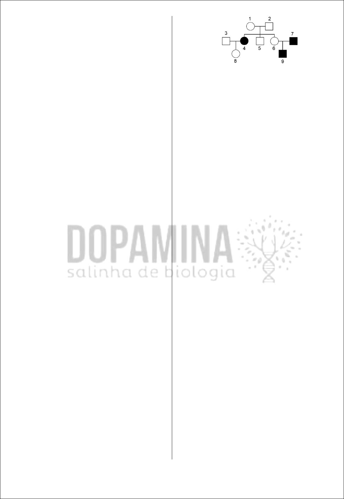PROFESSORA MARINA ESPÍNOLA SALINHA DOPAMINA 105 b) cruzando-as com as plantas recessivas, de flores brancas. As plantas VV produzirão apenas descendentes de flores vermelhas, enquanto as plantas Vv podem produzir descendentes de flores brancas. c) Cruzando-as com plantas de flores vermelhas da geração P. Os cruzamentos com plantas Vv produzirão descendentes de flores brancas. d) cruzando-as entre si, é possível que surjam plantas de flores brancas. As plantas Vv cruzadas com outras Vv produzirão apenas descendentes vermelhas, portanto as demais serão VV. e) cruzando-as com plantas recessivas e analisando as características do ambiente onde se dão os cruzamentos, é possível identificar aquelas que possuem apenas fatores V. Questão 08 A melanina participa de um mecanismo natural de proteção contra a radiação solar, principalmente a ultravioleta. Sua produção na pele depende necessariamente de uma enzima chamada tirosinase. Uma anomalia genética autossômica recessiva é responsável pela ausência de tirosinase, o que prejudica a ação desse mecanismo de proteção. Se um casal formado por indivíduos incapazes de produzir a tirosinase tiver um filho, a probabilidade da ausência dessa enzima no filho será de a) 100%. b) 75%. c) 50%. d) 25%. e) 0%. Questão 09 No esquema apresentado a seguir, os indivíduos assinalados em preto apresentam surdez causada pela mutação do gene conexina 26, de padrão autossômico recessivo. No heredograma acima, são obrigatoriamente heterozigotos os indivíduos: a) 4, 7 e 9 b) 1, 2, 6 e 8 c) 3, 6 e 8 d) 1, 2, 5 e 6 e) 1 e 2 Questão 10 O albinismo é considerado uma anomalia genética provocada pela ausência total ou parcial de pigmentação da pele, dos olhos e cabelos. No ser humano, o albinismo é um caráter hereditário recessivo. Considere uma situação em que progenitores com pigmentação normal tenham um filho albino e analise atentamente as proposições abaixo. I. Os progenitores são portadores do alelo recessivo. II. O genótipo do indivíduo albino é heterozigoto para tal característica. III. Os descendentes do filho albino serão sempre albinos. Marque abaixo a alternativa correta: a) Somente o item I é correto. b) Somente o item II é correto. c) Somente o item III é correto. d) Somente os itens I e II são corretos. Questão 11 André e Mariana pretendem ter dois filhos e procuraram um geneticista pois nas famílias de ambos há indivíduos afetados pela fibrose cística, uma doença de herança autossômica recessiva. Alguns testes mostraram que tanto André como Mariana são portadores de uma cópia do gene com a mutação para a fibrose cística. No caso de PROFESSORA MARINA ESPÍNOLA SALINHA DOPAMINA 106 duas gestações independentes, a probabilidade de seus filhos apresentarem a doença é de a) 100%. b) 25%. c) 12,5%. d) 6,25%. e) 0%. Questão 12 Heredogramas são representações do mecanismo de transmissão das características dentro de uma família. Por meio dos heredogramas torna-se mais fácil identificar os tipos de herança genética e as probabilidades de uma pessoa apresentar uma característica ou doença hereditária. Todas as alternativas abaixo são características de uma herança autossômica recessiva, EXCETO a) Em geral, os indivíduos afetados resultam de cruzamentos consanguíneos. b) O caráter aparece tipicamente apenas entre irmãos, mas não em seus pais, descendentes ou parentes. c) Em média, 25% dos irmãos do propósito são afetados. d) A incidência é mais alta nos homens do que nas mulheres. Questão 13 Observe a ilustração abaixo, que indica o genótipo de uma característica monogênica Mendeliana em um indivíduo. Adaptado de: . Acesso em: 26 set. 2017. Com relação ao que aparece na ilustração, é correto afirmar que a) o indivíduo é heterozigoto para a característica monogênica indicada e pode formar 50% dos gametas A e 50% dos gametas a. b) caso esse indivíduo tenha um filho gerado com outra pessoa de igual genótipo, a probabilidade de o filho ser heterozigoto é de 25%. c) esse genótipo é um exemplo de expressão de uma característica recessiva. d) quatro células haploides serão formadas na proporção de 1: 2: 1, ao final da meiose II desse indivíduo. e) as letras representam alelos para características diferentes e ocupam lócus diferentes nos cromossomos homólogos. Questão 14 O albinismo é caracterizado pela ausência de pigmentos na pele e estruturas epidérmicas, em função da incapacidade de produção da melanina. O gene alelo recessivo não produz a forma ativa da enzima que catalisa a síntese da melanina. Considerando-se o fato de um homem e uma mulher possuírem pigmentação da pele normal, sendo ele filho de um pai normal homozigoto e uma mãe albina, e ela filha de um pai albino e uma mãe normal homozigoto, é PROFESSORA MARINA ESPÍNOLA SALINHA DOPAMINA 107 correto afirmar que a probabilidade de esse casal ter uma filha albina é de a) 1/8. b) 1/2. c) 1/6. d) 1/4. Questão 15 Pedro e Márcia, em consulta ao geneticista, aguardam ansiosamente seu primeiro filho. Márcia sempre sonhou em ter uma menina. Mostra-se preocupada porque Pedro, com visão normal, filho de pais também de visão normal, tem um filho míope do seu primeiro casamento. Na família de Márcia, apenas João, seu irmão, apresenta miopia. Qual a probabilidade de o casal ter uma menina míope? a) 1/2 b) 1/4 c) 1/8 d) 1/10 e) 1/12 Questão 16 De acordo com a pesquisadora Rosana Nogueira Pires da Cunha (2000), não existe uma única causa para a miopia. Nesse sentido, a etiologia dessa doença pode ser genética ou ambiental, sendo, segundo a autora, três fatores importantes para o seu desenvolvimento: relação entre o esforço visual para perto e uma fraca acomodação; predisposição hereditária e relação entre a pressão intraocular e debilidade escleral. Quanto à predisposição hereditária, a miopia autossômica recessiva é característica de comunid