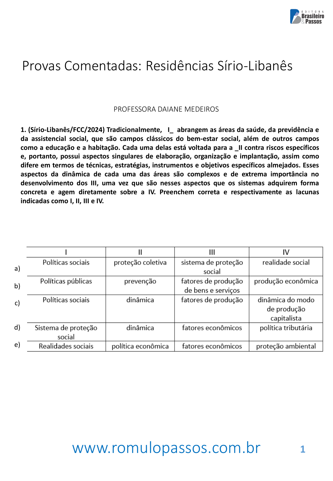 www.romulopassos.com.br 1 Provas Comentadas: Residências Sírio-Libanês 1. (Sírio-Libanês/FCC/2024) Tradicionalmente, I_ abrangem as áreas da saúde, da previdência e da assistencial social, que são campos clássicos do bem-estar social, além de outros campos como a educação e a habitação. Cada uma delas está voltada para a _II contra riscos específicos e, portanto, possui aspectos singulares de elaboração, organização e implantação, assim como difere em termos de técnicas, estratégias, instrumentos e objetivos específicos almejados. Esses aspectos da dinâmica de cada uma das áreas são complexos e de extrema importância no desenvolvimento dos III, uma vez que são nesses aspectos que os sistemas adquirem forma concreta e agem diretamente sobre a IV. Preenchem correta e respectivamente as lacunas indicadas como I, II, III e IV. a) b) c) d) e) PROFESSORA DAIANE MEDEIROS Karina Rocha Santos - 48275823862 www.romulopassos.com.br 2 2. (Sírio-Libanês/FCC/2023) No ordenamento constitucional brasileiro originado da Constituinte de 1988, que legou ao Brasil o Estado Democrático de Direito, a saúde está mencionada 52 vezes. No artigo 196 a Carta Magna afirma que a saúde é direito de todos e a) dever do Estado. b) o seu exercício é um dever de cidadania. c) dever das famílias. d) que cabe ao cidadão cuidar de si e dos seus semelhantes. e) que é direito da sociedade que cada um cumpra com o seu dever, cuidando da própria saúde. 3. (Sírio-Libanês/FCC/2023) O modelo biomédico exerceu grande influência sobre a saúde pública no século XX, mas na segunda metade do século passado, a publicação do “Relatório Lalonde” introduziu um novo conceito para as ações nessa área, conhecido como “Campo da Saúde”, segundo o qual adoecer e morrer dependem: a) Mais das condições gerais de vida do que da disponibilidade de serviços de saúde. b) Das condições ambientais, sendo mínimo o papel da biologia e do estilo de vida. c) Essencialmente das características biológicas predominantes nos diferentes grupos populacionais. d) Mais da disponibilidade de serviços de saúde do que das condições gerais de vida. e) Essencialmente da qualidade dos serviços de saúde e da boa formação dos profissionais de saúde. 4. (Sírio-Libanês/FCC/2023) São atividades que incorporaram as Tecnologias de Informação e Comunicação (TIC) em suas ações de saúde, e para as quais NÃO existem objeções quanto ao uso das TIC pelos órgãos reguladores do exercício profissional em saúde no Brasil: a) Teleconsulta, Graduação a Distância e Emissão Digital de Receita. b) Teleconsulta, Telediagnóstico e Tele-educação. c) Telediagnóstico, Tele-educação e Telecirurgia. d) Teleconsulta, Telediagnóstico e Telecirurgia. e) Graduação a Distância e Emissão Digital de Receita. 5. (Sírio-Libanês/FCC/2023) Um problema recorrente em sistemas de saúde, mesmo os muito bem-organizados, é que quando sentem necessidade de atendimento, muitos usuários nem sempre compreendem quais serviços devem ser procurados. Por essa razão, no âmbito do SUS, há a orientação de acolher a todos, atender emergencialmente e, tendo em vista as necessidades do usuário, orientar sobre a continuidade da atenção requerida. Esse processo denomina-se sistema a) de encaminhamento e controle de fluxo de usuários. b) regulado de saúde pública. c) de regulação e controle de vagas. d) de referência e contrarreferência. e) de referência e acolhimento humanizado. Karina Rocha Santos - 48275823862 www.romulopassos.com.br 3 6. (Sírio-Libanês/FCC/2024) Uma tendência no campo da saúde pública contemporânea é considerar que o fenômeno do adoecimento, em populações, não pode ser explicado apenas considerando-se os aspectos biológicos e microbiológicos envolvidos nas causas das enfermidades. De acordo com esse modelo explicativo, ações realizadas fora do setor da saúde, com ou sem participações de profissionais de saúde, são relevantes para a determinação do processo saúde-doença. O conjunto dessas ações é genericamente denominado como: a) Saúde Complementar. b) Promoção da saúde. c) Saúde Privada. d) Integração do setor de saúde. e) Saúde Suplementar. 7. (Sírio-Libanês/FCC/2023) Com relação aos níveis de atenção à saúde, os ambulatórios de especialidades são unidades compatíveis com o nível a) de Pronto Atendimento. b) quaternário de atenção. c) primário de atenção. d) terciário de atenção. e) secundário de atenção. 8. (Sírio-Libanês/FCC/2024) Unidades de Pronto Atendimento (UPA) são unidades incumbidas, no sistema de saúde brasileiro, de redirecionar a demanda de usuários e evitar superlotação dos hospitais, oferecendo atendimento ágil para urgências e estabilizando o quadro do paciente até que se possa encaminhá-lo a um hospital, quando necessário. Tomando como referência os níveis de atenção, pode-se afirmar que as UPAs são unidades de atenção a) primária ou secundária à saúde, conforme o porte da UPA. b) primária ou terciária à saúde, conforme o porte da UPA. c) secundária à saúde. d) primária à saúde. e) terciária à saúde. 9. (Sírio-Libanês/FCC/2024) A Saúde da Família é uma estratégia de intervenção, no âmbito da Atenção Primária à Saúde, adotada pelo sistema único de Saúde que se caracteriza, dentre outros aspectos, por ser a) a única estratégia para classificar risco de indivíduos e famílias em comunidades vulneráveis. b) menos efetiva do que a atenção básica tradicional, embora tenha o apoio da maioria dos políticos. c) a única estratégia adotada no âmbito do SUS para qualificar a atenção básica. d) uma, mas não a única, estratégia para desenvolvimento de ações de saúde nesse nível de atenção. e) a principal estratégia para classificar risco de indivíduos e famílias em comunidades vulneráveis. Karina Rocha Santos - 48275823862 www.romulo
