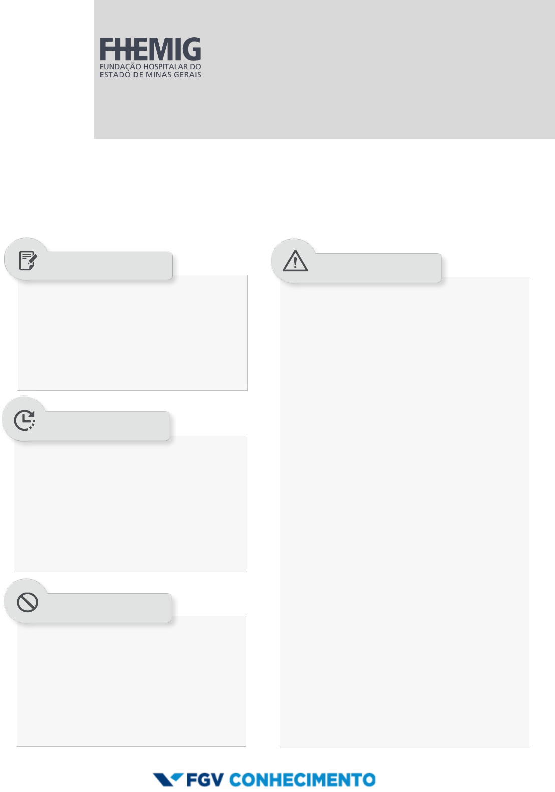 FUNDAÇÃO HOSPITALAR DO ESTADO DE MINAS GERAIS TARDE PROFISSIONAL DE ENFERMAGEM (PENF) ENFERMEIRO - 30H (NÍVEL IV) NÍVEL SUPERIOR TIPO 1 – BRANCA Além deste caderno contendo 45 (quarenta e cinco) questões objetivas e 2 (duas) questões discursivas, você receberá do fiscal de prova o cartão de respostas e a folha de textos definitivos; As questões objetivas têm 5 (cinco) opções de resposta (A, B, C, D e E) e somente uma delas está correta. Verifique se seu caderno de questões está completo, sem repetição de questões ou falhas. Caso contrário, notifique imediatamente o fiscal da sala, para que sejam tomadas as devidas providências; Confira seus dados pessoais, especialmente nome, número de inscrição e documento de identidade e leia atentamente as instruções para preencher o cartão de respostas e a folha de textos definitivos; Para o preenchimento do cartão de respostas e da folha de textos definitivos, use somente caneta esferográfica, fabricada em material transparente, com tinta preta ou azul; Assine seu nome apenas no(s) espaço(s) reservado(s) no cartão de respostas e na folha de textos definitivos; Confira seu cargo, cor e tipo do caderno de questões. Caso tenha recebido caderno de cargo ou cor ou tipo diferente do impresso em seu cartão de respostas ou em sua folha de texto definitivos, o fiscal deve ser obrigatoriamente informado para o devido registro na ata da sala; Reserve tempo suficiente para o preenchimento do seu cartão de respostas e da sua folha de textos definitivos. O preenchimento é de sua responsabilidade e não será permitida a troca do cartão de respostas e da folha de textos definitivos em caso de erro cometido pelo candidato; Para fins de avaliação, serão levadas em consideração apenas as marcações realizadas no cartão de respostas e na folha de textos definitivos; A FGV coletará as impressões digitais dos candidatos na lista de presença; Os candidatos serão submetidos ao sistema de detecção de metais quando do ingresso e da saída de sanitários durante a realização das provas. Boa sorte! Você dispõe de 4 (quatro) horas para a realização da prova, já incluído o tempo para a marcação do cartão de respostas e o preenchimento da folha de textos definitivos; 3 (três) horas após o início da prova, é possível retirar-se da sala, sem levar o caderno de questões; A partir dos 30 (trinta) minutos anteriores ao término da prova é possível retirar-se da sala levando o caderno de questões. Qualquer tipo de comunicação entre os candidatos durante a aplicação da prova; Anotar informações relativas às respostas em qualquer outro meio que não seja o caderno de questões; Levantar da cadeira sem autorização do fiscal de sala; Usar o sanitário ao término da prova, após deixar a sala. SUA PROVA TEMPO NÃO SERÁ PERMITIDO INFORMAÇÕES GERAIS FUNDAÇÃO HOSPITALAR DO ESTADO DE MINAS GERAIS - FHEMIG FGV Profissional de Enfermagem (PENF) - Enfermeiro - 30h (Nível IV) Tipo Branca – Página 3 MÓDULO I - CONHECIMENTOS BÁSICOS Língua Portuguesa 1 Nas opções a seguir, há a indicação de uma figura de linguagem com um exemplo correspondente. Assinale a opção em que a indicação do exemplo está correta. (A) Personificação: Por mim, teria evitado casar até mesmo com a sabedoria, caso ela me quisesse. (B) Antítese: A esposa diligente é a coroa do seu marido; e a que lhe causa problemas é o câncer dos seus ossos. (C) Eufemismo: Um marido nunca deve ser o primeiro a pegar no sono nem o último a acordar. (D) Paradoxo: Estou para realizar minha última viagem, um grande salto no escuro. (E) Hipérbole: O infinito é uma esfera infinita, cujo centro está em toda parte e a circunferência em nenhum lugar. 2 Biscoito significa “cozido duas vezes” (bis+ coctu), pois era, na verdade, o que acontecia: coziam a massa duas vezes para que, endurecida pela desidratação, pudesse durar mais tempo, o que era muito útil nas viagens demoradas pelo mar. BIS é um radical latino - também assume a forma BI (biforme) ou BA (balança) -, que entra como primeiro elemento na construção de novos vocábulos, com valor semântico de “dois ou duas vezes”. Assinale a opção em que, usando esse radical, o vocábulo indicado está correto. (A) Que tem dois pés: bipedestre. (B) Que ocorre de dois em dois meses: bimensal. (C) Que ocorre uma vez a cada dois anos: bianual. (D) Casado com duas esposas: bígamo. (E) Que fala duas línguas: biarticulado. 3 Assinale a opção em que todos os vocábulos grafados com e ou i estão escritos corretamente. (A) adiante / lampião / crâneo. (B) veado / pior / casimira. (C) palitó / Pireneus / arrepio. (D) irriquieto / digladiar / dilapidar. (E) crioulo / pátio / confissionário. 4 “Uns homens sobem por leves como os vapores e gazes, outros como os projetis pela força do engenho e dos talentos.” Marquês de Maricá. Sobre a estruturação dessa frase, assinale a observação incorreta. (A) O termo “Uns” corresponde estruturalmente a “outros”. (B) A forma verbal “sobem” está omitida na oração seguinte. (C) A preposição “por” tem o valor de “causa”. (D) O termo “como os vapores e gases” corresponde estruturalmente a “como os projetis”. (E) Os termos “por leves” e “pela força dos engenhos e dos talentos” correspondem-se estrutural e semanticamente. 5 O processo de reificação corresponde a tratar-se o ser humano como uma coisa, um objeto qualquer. Esse processo aparece nas opções a seguir, à exceção de uma. Assinale-a. (A) As garrafas de refrigerantes, quando retiradas da geladeira, ficam imediatamente suadas. (B) Nas grandes cidades, os passageiros vêm espremidos nos ônibus para o trabalho. (C) Após a violenta briga no final do show, alguns assistentes tinham a cara amassada. (D) Alguns clientes do bar, após beberem por muito tempo, saíam derrapando pelo chão de cerâmica. (E) O problema com as crianças é que e