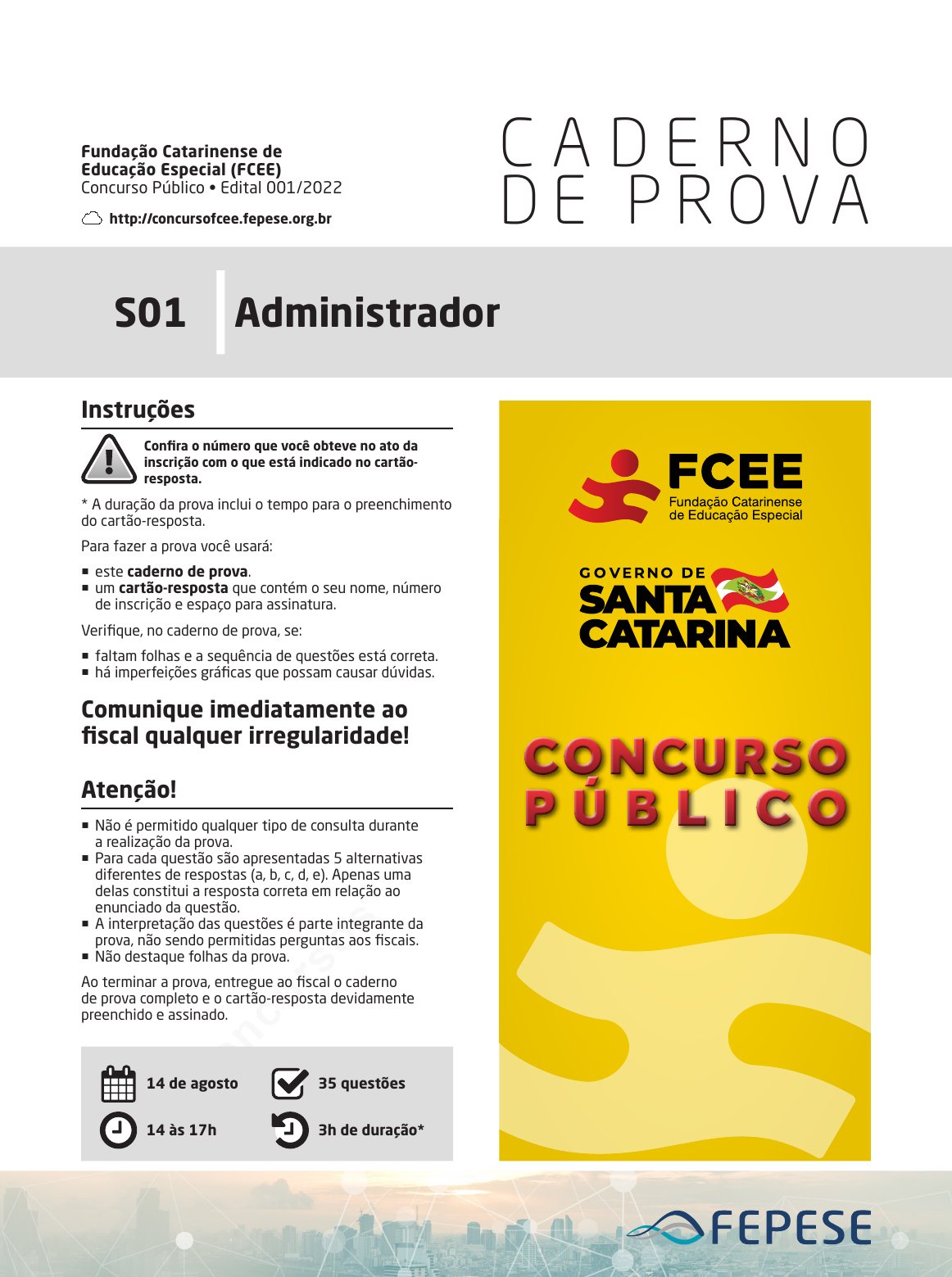 pcimarkpci MDAwMDowMDAwOjAwMDA6MDAwMDowMDAwOmZmZmY6YzkxMDpjMzEx:V2VkLCAyMCBOb3YgMjAyNCAxMDowMDowMSAtMDMwMA== www.pciconcursos.com.br C A D E R N O D E P R O V A Fundação Catarinense de Educação Especial (FCEE) Concurso Público • Edital 001/2022 http://concursofcee.fepese.org.br S01 Administrador CO N C U R S O P Ú B L I C O Instruções Confira o número que você obteve no ato da inscrição com o que está indicado no cartão- resposta. * A duração da prova inclui o tempo para o preenchimento do cartão-resposta. Para fazer a prova você usará: � este caderno de prova. � um cartão-resposta que contém o seu nome, número de inscrição e espaço para assinatura. Verifique, no caderno de prova, se: � faltam folhas e a sequência de questões está correta. � há imperfeições gráficas que possam causar dúvidas. Comunique imediatamente ao fiscal qualquer irregularidade! Atenção! � Não é permitido qualquer tipo de consulta durante a realização da prova. � Para cada questão são apresentadas 5 alternativas diferentes de respostas (a, b, c, d, e). Apenas uma delas constitui a resposta correta em relação ao enunciado da questão. � A interpretação das questões é parte integrante da prova, não sendo permitidas perguntas aos fiscais. � Não destaque folhas da prova. Ao terminar a prova, entregue ao fiscal o caderno de prova completo e o cartão-resposta devidamente preenchido e assinado. 14 de agosto 14 às 17h 35 questões 3h de duração* pcimarkpci MDAwMDowMDAwOjAwMDA6MDAwMDowMDAwOmZmZmY6YzkxMDpjMzEx:V2VkLCAyMCBOb3YgMjAyNCAxMDowMDowMSAtMDMwMA== www.pciconcursos.com.br . pcimarkpci MDAwMDowMDAwOjAwMDA6MDAwMDowMDAwOmZmZmY6YzkxMDpjMzEx:V2VkLCAyMCBOb3YgMjAyNCAxMDowMDowMSAtMDMwMA== www.pciconcursos.com.br Página 3 Fundação Catarinense de Educação Especial (FCEE) • Concurso Público • Edital 001/2022 S01 Administrador Língua Nacional 8 questões Texto 1. Notícia de jornal Leio no jornal a notícia de que um homem morreu de fome. Um homem de cor branca, trinta anos pre- sumíveis, pobremente vestido, morreu de fome, sem socorros, em pleno centro da cidade, permanecendo deitado na calçada durante setenta e duas horas, para finalmente morrer de fome. Morreu de fome. Depois de insistentes pedidos de comerciantes, uma ambulância do Pronto Socorro e uma radiopatrulha foram ao local, mas regressaram sem prestar auxílio ao homem, que acabou morrendo de fome. Um homem que morreu de fome. O comissário de plantão (um homem) afirmou que o caso (morrer de fome) era da alçada da Delegacia de Mendicância, especialista em homens que morrem de fome. E o homem morreu de fome. O corpo do homem que morreu de fome foi recolhido ao Instituto Médico Legal sem ser identificado. Nada se sabe dele, senão que morreu de fome. Um homem morre de fome em plena rua, entre centenas de pas- santes. Um homem caído na rua. Um bêbado. Um vagabundo. Um mendigo, um anormal, um tarado, um pária, um marginal, um proscrito, um bicho, uma coisa – não é homem. E os outros homens cumprem seu destino de passantes, que é o de passar. Durante setenta e duas horas todos passam, ao lado do homem que morre de fome, com um olhar de nojo, desdém, inquietação e até mesmo piedade, ou sem olhar nenhum, e o homem continua morrendo de fome, sozinho, isolado, perdido entre os homens, sem socorro e sem perdão. Não é da alçada do comissário, nem do hospital, nem da radiopatrulha, por que haveria de ser da minha alçada? Que é que eu tenho com isso? Deixa o homem morrer de fome. E o homem morre de fome. De trinta anos presumí- veis. Pobremente vestido. Morreu de fome, diz o jornal. Louve-se a insistência dos comerciantes, que jamais morrerão de fome, pedindo providências às autorida- des. As autoridades nada mais puderam fazer senão remover o corpo do homem. Deviam deixar que apo- drecesse, para escarmento dos outros homens. Nada mais puderam fazer senão esperar que morresse de fome. E ontem, depois de setenta e duas horas de inanição em plena rua, no centro mais movimentado da cidade do Rio de Janeiro, um homem morreu de fome. Morreu de fome. Fernando Sabino 1. Analise as afirmativas sobre o texto 1. 1. O autor mostra sua indignação diante da morte por inanição. 2. O autor critica a insensibilidade de pessoas da sociedade diante da miséria dos desabrigados. 3. O autor mostra a naturalização da morte no cotidiano das pessoas. 4. O autor, no terceiro parágrafo, prestando um serviço de utilidade pública, informa o fato de que os mendigos são da competência de autoridades especializadas, como a Delegacia de Mendicância. 5. O autor critica o fato de um homem estar morto na calçada, durante setenta e duas horas, e ser ignorado pelos transeuntes. Assinale a alternativa que indica todas as afirmativas corretas. a. SQUARE São corretas apenas as afirmativas 2 e 4. b. Check-square São corretas apenas as afirmativas 1, 2 e 3. c. SQUARE São corretas apenas as afirmativas 1, 3 e 4. d. SQUARE São corretas apenas as afirmativas 2, 3 e 4. e. SQUARE São corretas apenas as afirmativas 3, 4 e 5. 2. Na Redação Oficial, o pronome de tratamento confere ao texto a formalidade necessária a esse tipo de correspondência e possui aspectos peculiares de concordância. Assinale a alternativa correta de acordo com a afirma- ção acima. a. Check-square Vossa Senhoria nomeará seu substituto em breve. b. SQUARE A que vos referis, Vossa Excelência, neste contexto? c. SQUARE Sua Excelência, solicito-vos que cumprais com vosso compromisso. d. SQUARE Perguntou-lhe então o assessor: “Estais dispos- tos a levar sua promessa a cabo?” e. SQUARE “A Sua Excelência o senhor Secretário Executivo para dar vosso despacho” é o que se lia naquele cabeçalho. pcimarkpci MDAwMDowMDAwOjAwMDA6MDAwMDowMDAwOmZmZmY6YzkxMDpjMzEx:V2VkLCAyMCBOb3YgMjAyNCAxMDowMDowMSAtMDMwMA== www.pciconcursos.com.br Página 4 Fundação Catarinense de Educação Especial (FCEE) • Concurso Público • 