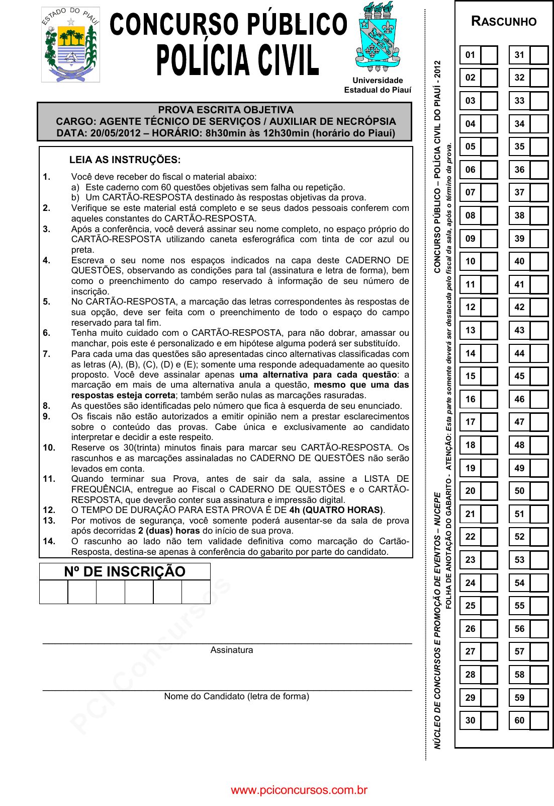 pcimarkpci MDAwMDowMDAwOjAwMDA6MDAwMDowMDAwOmZmZmY6YzkxMDpjMzEx:V2VkLCAyMCBOb3YgMjAyNCAxMTo0MToyNSAtMDMwMA== www.pciconcursos.com.br C PROVA ESCRITA OBJETIVA CARGO: AGENTE TÉCNICO DE SERVIÇOS / AUXILIAR DE NEC RÓPSIA DATA: 20/05/2012 – HORÁRIO: 8h30min às 12h30min (ho rário do Piauí) LEIA AS INSTRUÇÕES: 1. Você deve receber do fiscal o material abaixo: a) Este caderno com 60 questões objetivas sem falha ou repetição. b) Um CARTÃO-RESPOSTA destinado às respostas objetivas da prova. 2. Verifique se este material está completo e se seus dados pessoais conferem com aqueles constantes do CARTÃO-RESPOSTA. 3. Após a conferência, você deverá assinar seu nome completo, no espaço próprio do CARTÃO-RESPOSTA utilizando caneta esferográfica com tinta de cor azul ou preta. 4. Escreva o seu nome nos espaços indicados na capa deste CADERNO DE QUESTÕES, observando as condições para tal (assinatura e letra de forma), bem como o preenchimento do campo reservado à informação de seu número de inscrição. 5. No CARTÃO-RESPOSTA, a marcação das letras correspondentes às respostas de sua opção, deve ser feita com o preenchimento de todo o espaço do campo reservado para tal fim. 6. Tenha muito cuidado com o CARTÃO-RESPOSTA, para não dobrar, amassar ou manchar, pois este é personalizado e em hipótese alguma poderá ser substituído. 7. Para cada uma das questões são apresentadas cinco alternativas classificadas com as letras (A), (B), (C), (D) e (E); somente uma responde adequadamente ao quesito proposto. Você deve assinalar apenas uma alternativa para cada questão : a marcação em mais de uma alternativa anula a questão, mesmo que uma das respostas esteja correta ; também serão nulas as marcações rasuradas. 8. As questões são identificadas pelo número que fica à esquerda de seu enunciado. 9. Os fiscais não estão autorizados a emitir opinião nem a prestar esclarecimentos sobre o conteúdo das provas. Cabe única e exclusivamente ao candidato interpretar e decidir a este respeito. 10. Reserve os 30(trinta) minutos finais para marcar seu CARTÃO-RESPOSTA. Os rascunhos e as marcações assinaladas no CADERNO DE QUESTÕES não serão levados em conta. 11. Quando terminar sua Prova, antes de sair da sala, assine a LISTA DE FREQUÊNCIA, entregue ao Fiscal o CADERNO DE QUESTÕES e o CARTÃO- RESPOSTA, que deverão conter sua assinatura e impressão digital. 12. O TEMPO DE DURAÇÃO PARA ESTA PROVA É DE 4h (QUATRO HORAS) . 13. Por motivos de segurança, você somente poderá ausentar-se da sala de prova após decorridas 2 (duas) horas do início de sua prova. 14. O rascunho ao lado não tem validade definitiva como marcação do Cartão- Resposta, destina-se apenas à conferência do gabarito por parte do candidato. Nº DE INSCRIÇÃO ____________________________________________________________ Assinatura ____________________________________________________________ Nome do Candidato (letra de forma) Universidade Estadual do Piauí RASCUNHO 01 31 02 32 03 33 04 34 05 35 06 36 07 37 08 38 09 39 10 40 11 41 12 42 13 43 14 44 15 45 16 46 17 47 18 48 19 49 20 50 21 51 22 52 23 53 24 54 25 55 26 56 27 57 28 58 29 59 30 60 N Ú C LE O D E C O N C U R S O S E P R O M O Ç Ã O D E E V E N T O S – N U C E P E C O N C U R S O P Ú B LI C O – P O LÍ C IA C IV IL D O P IA U Í - 2 01 2 F O LH A D E A N O T A Ç Ã O D O G A B A R IT O - A T E N Ç Ã O : E st a pa rt e so m en te d ev er á se r de st ac ad a pe lo fi sc al d a sa la , a pó s o té rm in o da p ro va . www.pciconcursos.com.br pcimarkpci MDAwMDowMDAwOjAwMDA6MDAwMDowMDAwOmZmZmY6YzkxMDpjMzEx:V2VkLCAyMCBOb3YgMjAyNCAxMTo0MToyNSAtMDMwMA== www.pciconcursos.com.br Concurso Público – Núcleo de Concursos e Promoções de Eventos - NUCEPE / CARGO: Agente Técnico de Serviços / Auxiliar de Necrópsia 2 N º D E I N S C R I Ç Ã O www.pciconcursos.com.br pcimarkpci MDAwMDowMDAwOjAwMDA6MDAwMDowMDAwOmZmZmY6YzkxMDpjMzEx:V2VkLCAyMCBOb3YgMjAyNCAxMTo0MToyNSAtMDMwMA== www.pciconcursos.com.br Concurso Público – Núcleo de Concursos e Promoções de Eventos - NUCEPE / CARGO: Agente Técnico de Serviços / Auxiliar de Necrópsia 3 LÍNGUA PORTUGUESA TEXTO 1 O poder da língua A língua é o maior instrumento de interação do ser humano. Ela intercambia o ser humano com o resto do mundo. Embora existam várias línguas, todas elas interagem, e nenhuma pode ser exilada. Podemos exilar pessoas, povo, nação, mas a língua sempre vai existir. Até mesmo os mudos, que não se expressam através da boca, têm a sua língua. Por outro lado, a língua também é o maior instrumento de isolamento do ser humano. Se você não souber a língua do lugar onde vive, fica isolado, sem comunicação. Imigrantes sofrem com esse problema, quando vão para países onde nem sequer sabem como dar “bom-dia” na língua nativa, ficando isolados por um bom tempo. Sem a língua, não há comunicação. Sem comunicação, não há interação. A língua é, também, o maior instrumento de guerra do ser humano. É... a velha língua já arrumou grandes encrencas pela história. Já imaginou se Hitler não abrisse a boca para falar? Provavelmente mais de 50 milhões de pessoas não teriam morrido. E se o Presidente norte- americano Harry S. Truman não tivesse usado do poder da língua para autorizar o bombardeio atômico no Japão? É... a língua pode ser cruel, pode ferir, machucar, destruir e matar. Por outro lado, a língua é o maior instrumento de paz do ser humano. A mesma língua que mata pode transformar dor em felicidade, tristeza em alegria, perseguição em livramento. Não precisamos ir longe para pegar um exemplo de paz que a língua proporcionou: o poder da língua nas “Diretas Já!” proporcionou ao povo brasileiro um tempo de paz que havia mais de vinte anos o povo não gozava. E como Jesus Cristo passaria seus ensinamentos se não fosse pelo poder único e incomensurável da língua? A língua faz reviver pessoa