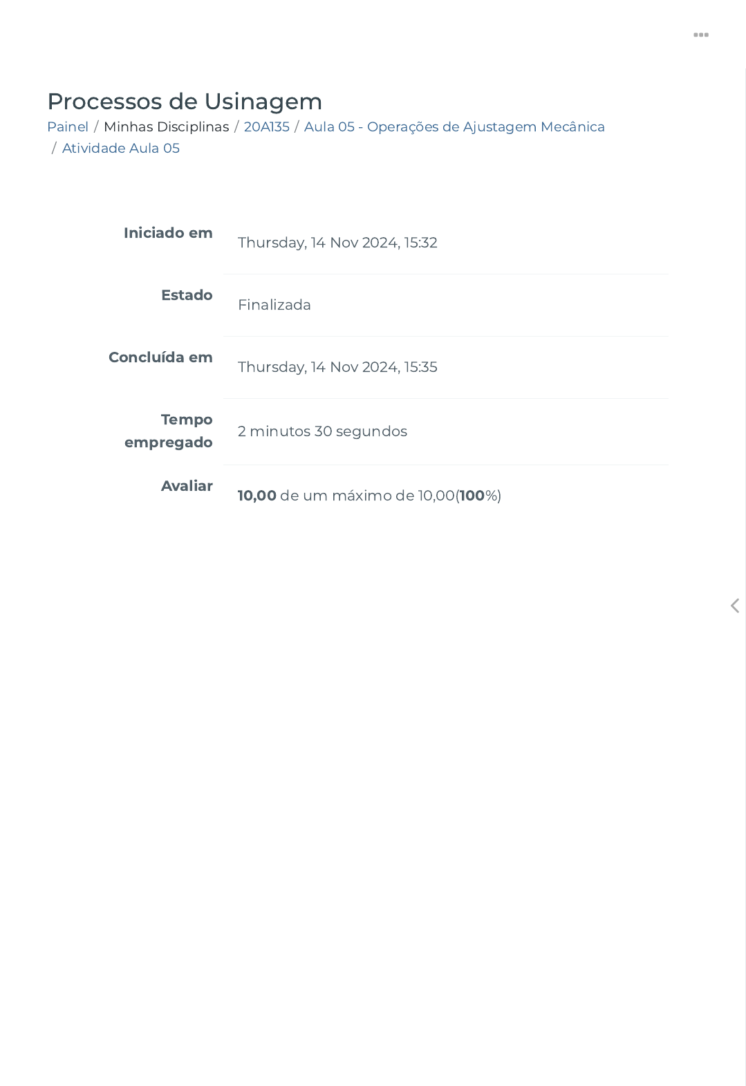 Painel / Minhas Disciplinas / 20A135 / Aula 05 - Operações de Ajustagem Mecânica / Atividade Aula 05 Processos de Usinagem Iniciado em Thursday, 14 Nov 2024, 15:32 Estado Finalizada Concluída em Thursday, 14 Nov 2024, 15:35 Tempo empregado 2 minutos 30 segundos Avaliar 10,00 de um máximo de 10,00(100%) https://ava.politecnicabr.com.br/my/ https://ava.politecnicabr.com.br/my/ https://ava.politecnicabr.com.br/course/view.php?id=972 https://ava.politecnicabr.com.br/course/view.php?id=972#section-6 https://ava.politecnicabr.com.br/mod/quiz/view.php?id=31578 https://ava.politecnicabr.com.br/ Questão 1 Correto Atingiu 2,00 de 2,00 Marque Verdadeiro ou Falso: ( ) Serra de �ta horizontal Sua estrutura se assemelha à da serra de �ta vertical, porém é móvel a parte que contém as duas polias que acomodam a serra de �ta. Isso permite a regulagem da altura e do movimento do avanço de corte. Em sua base �xa há uma morsa especial para �xação do material a ser cortado. Procedimento para operação de serra de �ta horizontal » Utilizar óculos de proteção, sapato de segurança e protetor auricular. » Traçar a medida onde ocorrerá o corte. » Apertar �rmemente a morsa para evitar que o material escape. Precauções » Não utilizar luvas durante a operação de corte, para evitar pontos de agarramento. » Apoiar o material a ser cortado para que o mesmo não caia ao �nal do corte, causando acidentes. Escolha uma opção: Verdadeiro Falso https://ava.politecnicabr.com.br/ Questão 2 Correto Atingiu 2,00 de 2,00 Para uma operação de limagem adequada, é importante seguir as recomendações a seguir: Escolha uma opção: a. iniciar a limagem com passos paralelos à lateral da peça ou inclinados para controle da planicidade da superfície. b. veri�car a planeza com o esquadro e a régua paralela. c. antes de iniciar a operação de limar, veri�que se o cabo e o picado da lima estão em boas condições. d. prender a peça na morsa de modo que a superfície a ser limada �que pouco para fora dos mordentes, evitando que a lima atinja os mordentes. e. todas as alternativas corretas. https://ava.politecnicabr.com.br/ Questão 3 Correto Atingiu 2,00 de 2,00 Recomendações para a utilização de furadeiras: Escolha uma opção: a. Nas furadeiras de coluna e bancada, a peça a ser furada deve estar bem �xada por meio de morsa ou grampos. b. Nunca utilizar luvas, roupas folgadas ou de manga comprida na operação da furadeira ou qualquer outra máquina rotativa. c. Selecionar a broca ideal e veri�car se os ângulos de corte estão bem a�ados. d. Utilizar óculos de proteção, protetor auricular; em caso de cabelo comprido, utilizar rede para prendê-lo; e se o material a ser furado produzir pó (concreto, ferro fundido etc.), utilizar máscara para partículas sólidas em suspensão. e. Todas as alternativas corretas. https://ava.politecnicabr.com.br/ Questão 4 Correto Atingiu 2,00 de 2,00 De acordo com o tipo de picado, as limas são classi�cadas em cinco tipos: utilizadas em materiais endurecidos com tratamento térmico de têmpera e para pequenos ajustes de precisão. É muito utilizada em ferramentaria de corte, dobra e repuxo e moldes plásticos. possui o picado �no, o que possibilita melhor rugosidade e permite bom acabamento de superfície, inclusive para encaixes que devem ser ajustados manualmente. Indicada também para limar a lateral de chapas. trata-se de lima com picado médio, que permite retirar uma quantidade de material menor em relação à lima bastarda, porém com melhor acabamento super�cial. a distância entre os dentes é maior, o que torna esse tipo de lima indicado para desbastes, ou seja, maior retirada de material com rugosidade alta. utilizadas em trabalhos especiais como limagem de furos de pequeno diâmetro, construção de ranhuras e acabamento de cantos vivos e outras superfícies de pequenas dimensões. Limas d Murça Bastard Bastard Limas-a https://ava.politecnicabr.com.br/ Questão 5 Correto Atingiu 2,00 de 2,00 Marque Verdadeiro ou Falso: ( ) A serra de �ta é destinada a cortar materiais metálicos ou não metálicos. Pode ser utilizada na área de alimentação (em açougues ou marcenarias) e na área de metalmecânica (serralheria, funilaria industrial, caldeiraria, ferramentaria e usinagem). Na área de usinagem, é utilizada para corte de chapas e barras de diversos per�s. Essas operações serão executadas em máquinas operatrizes. Em função de suas características construtivas e de aplicação, as serras de �ta podem ser: » Horizontais: sua aplicação é limitada ao corte seriado de per�s e barras. » Verticais: possuem vasta aplicação em caldeiraria, ferramentaria e mecânica em geral, pois permitem mudança de direção moderada no sentido de corte, porém sem muita precisão. Escolha uma opção: Verdadeiro Falso Entre em Contato https://www.politecnicabr.com.br 0800 084 2627 0800 084 2627 Links Úteis Dicas da nossa Diretora Acadêmica Planner de Estudos Declaração de Matrícula Orientações do AVA Abertura de Ticket Fale com o Tutor Cronograma de Estudos Manual de Estágio Manual de Competência https://www.politecnicabr.com.br/ https://soundcloud.com/user-501638417/sets/escola-politecnica-brasileira https://soundcloud.com/user-501638417/sets/escola-politecnica-brasileira https://storage.googleapis.com/sirius-pubstore/semestre_plannerdeestudo%20poli.pdf https://storage.googleapis.com/sirius-pubstore/semestre_plannerdeestudo%20poli.pdf https://storage.googleapis.com/sirius-pubstore/declaracao_matricula.pdf https://storage.googleapis.com/sirius-pubstore/declaracao_matricula.pdf https://storage.googleapis.com/sirius-pubstore/orientacoes_ava.pdf https://storage.googleapis.com/sirius-pubstore/orientacoes_ava.pdf https://storage.googleapis.com/sirius-pubstore/abertura_ticket.pdf https://storage.googleapis.com/sirius-pubstore/abertura_ticket.pdf https://storage.googleapis.com/sirius-pubstore/fale_co