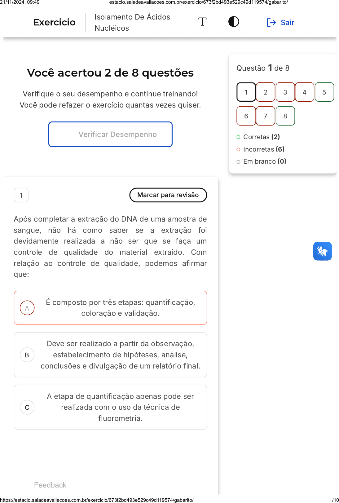 Você acertou 2 de 8 questões Verifique o seu desempenho e continue treinando! Você pode refazer o exercício quantas vezes quiser. Verificar Desempenho A B C 1 Marcar para revisão Após completar a extração do DNA de uma amostra de sangue, não há como saber se a extração foi devidamente realizada a não ser que se faça um controle de qualidade do material extraído. Com relação ao controle de qualidade, podemos afirmar que: É composto por três etapas: quantificação, coloração e validação. Deve ser realizado a partir da observação, estabelecimento de hipóteses, análise, conclusões e divulgação de um relatório final. A etapa de quantificação apenas pode ser realizada com o uso da técnica de fluorometria. Questão 1 de 8 Corretas �2� Incorretas �6� Em branco �0� 1 2 3 4 5 6 7 8 Exercicio Isolamento De Ácidos Nucléicos Sair Feedback 21/11/2024, 09:49 estacio.saladeavaliacoes.com.br/exercicio/673f2bd493e529c49d119574/gabarito/ https://estacio.saladeavaliacoes.com.br/exercicio/673f2bd493e529c49d119574/gabarito/ 1/10 D E A espectrofotometria mede a quantidade de luz, na faixa de 260 nm, absorvida pelo DNA e RNA, desta forma é capaz de quantificar e identificar a pureza da amostra. A eletroforese é feita para medir a integridade do extraído e tem como princípio diferenciar a solubilidade de cada componente. Resposta incorreta Opa! A alternativa correta é a letra D. Confira o gabarito comentado! Gabarito Comentado A espectrofotometria é uma técnica que mede a quantidade de luz que é absorvida por uma substância em uma determinada faixa de comprimento de onda, neste caso, 260 nm. Esta técnica é utilizada para quantificar e identificar a pureza de amostras de DNA e RNA, pois essas moléculas absorvem luz nessa faixa de comprimento de onda. Portanto, a espectrofotometria é uma ferramenta essencial no controle de qualidade após a extração do DNA de uma amostra de sangue. 2 Marcar para revisão O DNA (ácido desoxirribonucleico), material genético de seres vivos, é uma molécula de fita dupla, que pode ser extraída de forma caseira a partir de frutas, como morango ou banana amassados, com uso de detergente, de sal de cozinha, de álcool comercial e de uma peneira ou de um coador de papel. O papel do detergente nessa extração de DNA é: 21/11/2024, 09:49 estacio.saladeavaliacoes.com.br/exercicio/673f2bd493e529c49d119574/gabarito/ https://estacio.saladeavaliacoes.com.br/exercicio/673f2bd493e529c49d119574/gabarito/ 2/10 A B C D E Aglomerar o DNA em solução para que se torne visível. Promover lise mecânica do tecido para obtenção de DNA. Emulsificar a mistura para promover a precipitação do DNA. Promover atividades enzimáticas para acelerar a extração do DNA. Romper as membranas celulares para liberação do DNA em solução. Resposta incorreta Opa! A alternativa correta é a letra E. Confira o gabarito comentado! Gabarito Comentado O detergente tem a função de romper as membranas celulares para liberação do DNA em solução. Isso ocorre porque as membranas celulares são compostas principalmente por lipídios, e os detergentes são substâncias que têm a capacidade de interagir com esses lipídios, desestabilizando e rompendo a membrana celular. Com a ruptura da membrana, o DNA contido no interior da célula é liberado na solução. 3 Marcar para revisão Considerando a sequência de RNAm abaixo, qual dos primers específicos para esta sequência deve ser 21/11/2024, 09:49 estacio.saladeavaliacoes.com.br/exercicio/673f2bd493e529c49d119574/gabarito/ https://estacio.saladeavaliacoes.com.br/exercicio/673f2bd493e529c49d119574/gabarito/ 3/10 A B C D E utilizado? 5' AUGCAAUUGGUCCAGUCGAUGCAGUCAGAACCAUG 3' 5' ATGCTTUUGGUCCAG 3' 5' GACCUGGTTAACGTA 3' 5' CATGGTTCTGACTGC 3' 5' TTTTTTTTTTTTTTT 3' 5' CGTCAGTCTTGGTAC 3' Resposta incorreta Opa! A alternativa correta é a letra C. Confira o gabarito comentado! Gabarito Comentado A resposta correta é: 5' CATGGTTCTGACTGC 3'. O primer deve ser complementar à sequência de RNAm, ou seja, deve ser antiparalelo à sequência de RNAm. Além disso, o primer deve ser de tamanho adequado para ser amplificado pelo PCR. O primer 5' CATGGTTCTGACTGC 3' é complementar à sequência de RNAm e é de tamanho adequado para ser amplificado pelo PCR. Portanto, este é o primer que deve ser utilizado. 4 Marcar para revisão Você foi contratado por uma empresa de coleta de DNA para realizar testes de ancestralidade, a coleta é 21/11/2024, 09:49 estacio.saladeavaliacoes.com.br/exercicio/673f2bd493e529c49d119574/gabarito/ https://estacio.saladeavaliacoes.com.br/exercicio/673f2bd493e529c49d119574/gabarito/ 4/10 A B C D E feita com swab pelo próprio cliente e o tubo chega em suas mãos. Leia as alternativas e marque a incorreta. A amostra coletada pode ficar por até uma semana em temperatura ambiente. O kit utilizado para a coleta de DNA deve possuir informações claras e objetivas. A coleta pode ser realizada, sem a necessidade de ir ao laboratório. O swab utilizado deve estar limpo, sem detritos, caso tenha marcas de batom ou restos de comida o cliente deve repetir o procedimento. O tubo deve conter apenas o swab limpo dentro dele. É importante checar se tem dupla identificação através de um código de barras ou código numérico, além do nome do cliente. Resposta incorreta Opa! A alternativa correta é a letra D. Confira o gabarito comentado! Gabarito Comentado A resposta correta é: O tubo deve conter apenas o swab limpo dentro dele. O tubo deve conter apenas o swab limpo dentro dele, pois o swab é o material que contém a amostra de DNA. Se o tubo conter outros materiais, como saliva, ele pode contaminar a amostra e comprometer o resultado do teste. 21/11/2024, 09:49 estacio.saladeavaliacoes.com.br/exercicio/673f2bd493e529c49d119574/gabarito/ https://estacio.saladeavaliacoes.com.br/exercicio/673f2bd493e529c49d119574/gabarito/ 5/10 A B C D E 5 Marcar para revisão Hoje em dia, o trabalho com mate