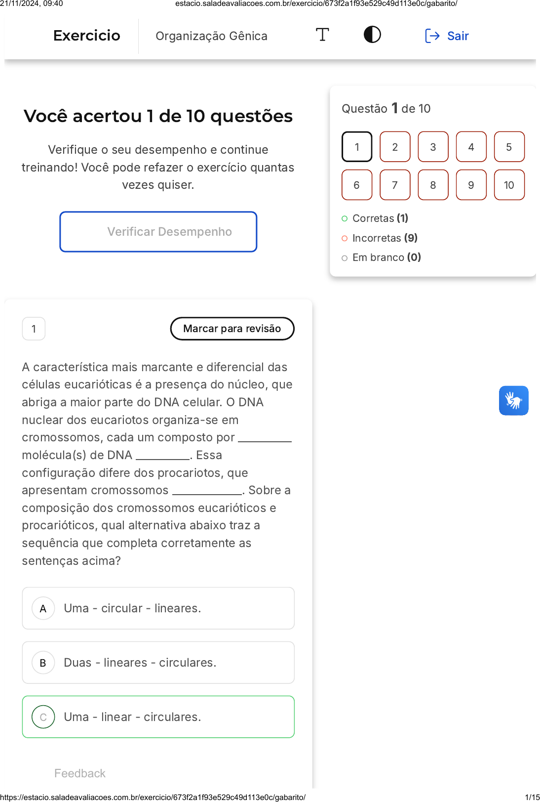Você acertou 1 de 10 questões Verifique o seu desempenho e continue treinando! Você pode refazer o exercício quantas vezes quiser. Verificar Desempenho A B C 1 Marcar para revisão A característica mais marcante e diferencial das células eucarióticas é a presença do núcleo, que abriga a maior parte do DNA celular. O DNA nuclear dos eucariotos organiza-se em cromossomos, cada um composto por __________ molécula(s) de DNA __________. Essa configuração difere dos procariotos, que apresentam cromossomos _____________. Sobre a composição dos cromossomos eucarióticos e procarióticos, qual alternativa abaixo traz a sequência que completa corretamente as sentenças acima? Uma - circular - lineares. Duas - lineares - circulares. Uma - linear - circulares. Questão 1 de 10 Corretas �1� Incorretas �9� Em branco �0� 1 2 3 4 5 6 7 8 9 10 Exercicio Organização Gênica Sair Feedback 21/11/2024, 09:40 estacio.saladeavaliacoes.com.br/exercicio/673f2a1f93e529c49d113e0c/gabarito/ https://estacio.saladeavaliacoes.com.br/exercicio/673f2a1f93e529c49d113e0c/gabarito/ 1/15 D E Duas - lineares - triplicados. Uma - descompactado - compactados. Resposta correta Parabéns, você selecionou a alternativa correta. Confira o gabarito comentado! Gabarito Comentado O DNA nuclear dos eucariotos encontra-se compactado na forma de cromossomos, cada um composto por uma única molécula de DNA linear. Essa configuração difere dos procariotos, que apresentam cromossomos circulares. A maioria dos eucariotos possui dois conjuntos completos de cromossomos em cada célula somática, mas existem espécies com 3 ou mais cópias de cada cromossomo em cada célula e, ainda, aquelas que apresentam um único conjunto de cromossomos por célula. 2 Marcar para revisão A característica mais marcante e diferencial das células eucarióticas é a presença do núcleo, além de outras organelas. Análises genômicas sugerem que certas organelas se originaram de uma relação evolutiva simbiótica com bactérias ancestrais. Observe os itens abaixo. Quais opções indicam corretamente as organelas às quais se referem o enunciado? I - ribossomos II - cloroplastos III - lisossomos 21/11/2024, 09:40 estacio.saladeavaliacoes.com.br/exercicio/673f2a1f93e529c49d113e0c/gabarito/ https://estacio.saladeavaliacoes.com.br/exercicio/673f2a1f93e529c49d113e0c/gabarito/ 2/15 A B C D E IV - retículo endoplasmático V - mitocôndrias I e IV II e III III e V II e V I e III Resposta incorreta Opa! A alternativa correta é a letra D. Confira o gabarito comentado! Gabarito Comentado A questão aborda a origem de algumas organelas presentes nas células eucarióticas. De acordo com estudos genômicos, acredita-se que algumas organelas, como as mitocôndrias e os cloroplastos, tenham se originado de uma relação simbiótica com bactérias ancestrais. No caso das mitocôndrias, acredita-se que elas sejam descendentes de bactérias aeróbicas que foram englobadas por uma célula ancestral. Já os cloroplastos, organelas responsáveis pela fotossíntese nas células vegetais, teriam se originado de bactérias fotossintetizantes. 21/11/2024, 09:40 estacio.saladeavaliacoes.com.br/exercicio/673f2a1f93e529c49d113e0c/gabarito/ https://estacio.saladeavaliacoes.com.br/exercicio/673f2a1f93e529c49d113e0c/gabarito/ 3/15 A B C D E 3 Marcar para revisão Basicamente, cada um dos genes é formado por uma região codificadora, sequência nucleotídica que codifica o RNA, e pelas sequências reguladoras que controlam a sua expressão. Sobre esse assunto, analise as asserções abaixo e marque a alternativa correta. Uma característica típica dos genes procarióticos é a colinearidade entre um gene e seu produto PORQUE Há exata correspondência entre a sequência nucleotídica do DNA e a sequência de nucleotídeos do RNA. As duas asserções são verdadeiras, e a segunda justifica a primeira. A primeira asserção é verdadeira, e a segunda é falsa. As duas asserções são falsas. A primeira asserção é falsa, e a segunda é verdadeira. As duas asserções são verdadeiras, mas a segunda não justifica a primeira. Resposta incorreta Opa! A alternativa correta é a letra E. Confira o gabarito comentado! Gabarito Comentado 21/11/2024, 09:40 estacio.saladeavaliacoes.com.br/exercicio/673f2a1f93e529c49d113e0c/gabarito/ https://estacio.saladeavaliacoes.com.br/exercicio/673f2a1f93e529c49d113e0c/gabarito/ 4/15 As duas asserções são verdadeiras. De fato, uma característica típica dos genes procarióticos é a colinearidade entre um gene e seu produto, o que significa que há uma correspondência exata entre a sequência nucleotídica do DNA e a sequência de nucleotídeos do RNA ou sequência de aminoácidos da proteína, dependendo se o transcrito do gene for um tRNA, rRNA ou mRNA. No entanto, a segunda asserção não justifica a primeira. A colinearidade dos genomas procarióticos deve-se à presença mínima de sequências que interrompem as sequências codificadoras, e não simplesmente à correspondência entre a sequência nucleotídica do DNA e a sequência de nucleotídeos do RNA. 4 Marcar para revisão O genoma dos organismos procariotos possui características que os diferem dos eucariotos. Em relação à organização do material genético dos procariotos, julgue as alternativas a seguir como verdadeiras �V) ou falsas �F�. ( ) Nucleoide é a região onde está localizado o material genético das bactérias. ( ) O cromossomo bacteriano é envolvido por uma membrana nuclear. ( ) Bactérias do gênero Borrelia apresentam cromossoma linear. ( ) Os procariotos não possuem proteínas associadas ao nucleoide. Assinale a alternativa que apresenta a sequência correta. 21/11/2024, 09:40 estacio.saladeavaliacoes.com.br/exercicio/673f2a1f93e529c49d113e0c/gabarito/ https://estacio.saladeavaliacoes.com.br/exercicio/673f2a1f93e529c49d113e0c/gabarito/ 5/15 A B C D E V � F � V � F V � F � V � V V � F � F � F F � V � 