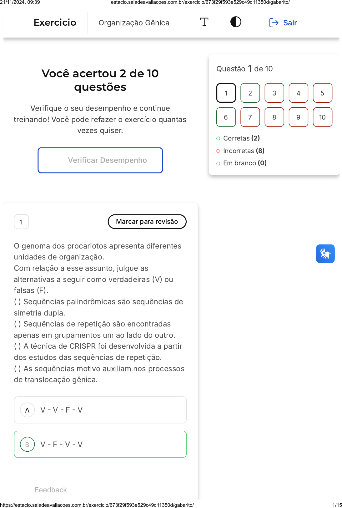 Você acertou 2 de 10 questões Verifique o seu desempenho e continue treinando! Você pode refazer o exercício quantas vezes quiser. Verificar Desempenho A B 1 Marcar para revisão O genoma dos procariotos apresenta diferentes unidades de organização. Com relação a esse assunto, julgue as alternativas a seguir como verdadeiras �V) ou falsas �F�. ( ) Sequências palindrômicas são sequências de simetria dupla. ( ) Sequências de repetição são encontradas apenas em grupamentos um ao lado do outro. ( ) A técnica de CRISPR foi desenvolvida a partir dos estudos das sequências de repetição. ( ) As sequências motivo auxiliam nos processos de translocação gênica. V � V � F � V V � F � V � V Questão 1 de 10 Corretas �2� Incorretas �8� Em branco �0� 1 2 3 4 5 6 7 8 9 10 Exercicio Organização Gênica Sair Feedback 21/11/2024, 09:39 estacio.saladeavaliacoes.com.br/exercicio/673f29f593e529c49d11350d/gabarito/ https://estacio.saladeavaliacoes.com.br/exercicio/673f29f593e529c49d11350d/gabarito/ 1/15 C D E F � V � F � V V � F � F � V F � V � V � V Resposta incorreta Opa! A alternativa correta é a letra B. Confira o gabarito comentado! Gabarito Comentado As sequências palindrômicas são, de fato, sequências de simetria dupla. No entanto, as sequências de repetição não são encontradas apenas em agrupamentos lado a lado, elas podem estar espalhadas pelo genoma. A técnica de CRISPR, uma ferramenta revolucionária para a edição de genes, foi desenvolvida com base nos estudos das sequências de repetição. Por fim, as sequências motivo desempenham um papel crucial nos processos de translocação gênica, auxiliando na movimentação de genes dentro do genoma. 2 Marcar para revisão A característica mais marcante e diferencial das células eucarióticas é a presença do núcleo, que abriga a maior parte do DNA celular. O DNA nuclear dos eucariotos organiza-se em cromossomos, cada um composto por __________ molécula(s) de DNA __________. Essa configuração difere dos procariotos, que 21/11/2024, 09:39 estacio.saladeavaliacoes.com.br/exercicio/673f29f593e529c49d11350d/gabarito/ https://estacio.saladeavaliacoes.com.br/exercicio/673f29f593e529c49d11350d/gabarito/ 2/15 A B C D E apresentam cromossomos _____________. Sobre a composição dos cromossomos eucarióticos e procarióticos, qual alternativa abaixo traz a sequência que completa corretamente as sentenças acima? Uma - circular - lineares. Duas - lineares - circulares. Uma - linear - circulares. Duas - lineares - triplicados. Uma - descompactado - compactados. Resposta correta Parabéns, você selecionou a alternativa correta. Confira o gabarito comentado! Gabarito Comentado O DNA nuclear dos eucariotos encontra-se compactado na forma de cromossomos, cada um composto por uma única molécula de DNA linear. Essa configuração difere dos procariotos, que apresentam cromossomos circulares. A maioria dos eucariotos possui dois conjuntos completos de cromossomos em cada célula somática, mas existem espécies com 3 ou mais cópias de cada cromossomo em cada célula e, ainda, aquelas que apresentam um único conjunto de cromossomos por célula. 21/11/2024, 09:39 estacio.saladeavaliacoes.com.br/exercicio/673f29f593e529c49d11350d/gabarito/ https://estacio.saladeavaliacoes.com.br/exercicio/673f29f593e529c49d11350d/gabarito/ 3/15 A B C D E 3 Marcar para revisão O genoma dos organismos procariotos possui características que os diferem dos eucariotos. Em relação à organização do material genético dos procariotos, julgue as alternativas a seguir como verdadeiras �V) ou falsas �F�. ( ) Nucleoide é a região onde está localizado o material genético das bactérias. ( ) O cromossomo bacteriano é envolvido por uma membrana nuclear. ( ) Bactérias do gênero Borrelia apresentam cromossoma linear. ( ) Os procariotos não possuem proteínas associadas ao nucleoide. Assinale a alternativa que apresenta a sequência correta. V � F � V � F V � F � V � V V � F � F � F F � V � F � V F � F � V � V Resposta incorreta Opa! A alternativa correta é a letra A. Confira o gabarito comentado! Gabarito Comentado A primeira afirmação é verdadeira, pois o nucleoide é de fato a região onde está 21/11/2024, 09:39 estacio.saladeavaliacoes.com.br/exercicio/673f29f593e529c49d11350d/gabarito/ https://estacio.saladeavaliacoes.com.br/exercicio/673f29f593e529c49d11350d/gabarito/ 4/15 A B C localizado o material genético das bactérias. A segunda afirmação é falsa, pois o cromossomo bacteriano não é envolvido por uma membrana nuclear. A terceira afirmação é verdadeira, pois as bactérias do gênero Borrelia apresentam cromossoma linear. A última afirmação é falsa, pois os procariotos possuem proteínas associadas ao nucleoide. Portanto, a sequência correta é V � F � V � F. 4 Marcar para revisão A característica mais marcante e diferencial das células eucarióticas é a presença do núcleo, além de outras organelas. Análises genômicas sugerem que certas organelas se originaram de uma relação evolutiva simbiótica com bactérias ancestrais. Observe os itens abaixo. Quais opções indicam corretamente as organelas às quais se referem o enunciado? I - ribossomos II - cloroplastos III - lisossomos IV - retículo endoplasmático V - mitocôndrias I e IV II e III III e V 21/11/2024, 09:39 estacio.saladeavaliacoes.com.br/exercicio/673f29f593e529c49d11350d/gabarito/ https://estacio.saladeavaliacoes.com.br/exercicio/673f29f593e529c49d11350d/gabarito/ 5/15 D E II e V I e III Resposta incorreta Opa! A alternativa correta é a letra D. Confira o gabarito comentado! Gabarito Comentado A questão aborda a origem de algumas organelas presentes nas células eucarióticas. De acordo com estudos genômicos, acredita-se que algumas organelas, como as mitocôndrias e os cloroplastos, tenham se originado de uma relação simbiótica com bactérias ances