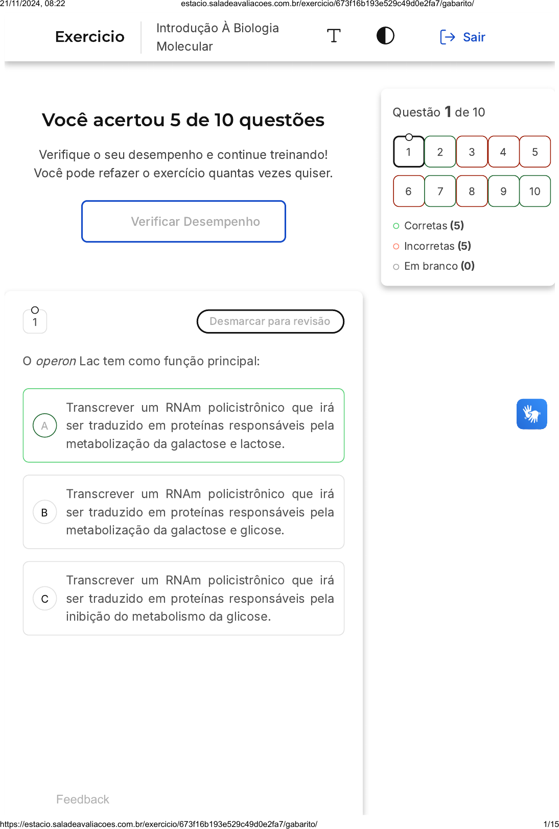 Você acertou 5 de 10 questões Verifique o seu desempenho e continue treinando! Você pode refazer o exercício quantas vezes quiser. Verificar Desempenho A B C 1 Desmarcar para revisão O operon Lac tem como função principal: Transcrever um RNAm policistrônico que irá ser traduzido em proteínas responsáveis pela metabolização da galactose e lactose. Transcrever um RNAm policistrônico que irá ser traduzido em proteínas responsáveis pela metabolização da galactose e glicose. Transcrever um RNAm policistrônico que irá ser traduzido em proteínas responsáveis pela inibição do metabolismo da glicose. Questão 1 de 10 Corretas �5� Incorretas �5� Em branco �0� 1 2 3 4 5 6 7 8 9 10 Exercicio Introdução À Biologia Molecular Sair Feedback 21/11/2024, 08:22 estacio.saladeavaliacoes.com.br/exercicio/673f16b193e529c49d0e2fa7/gabarito/ https://estacio.saladeavaliacoes.com.br/exercicio/673f16b193e529c49d0e2fa7/gabarito/ 1/15 D E Transcrever um RNAm policistrônico que irá ser traduzido em proteínas responsáveis pela inibição do metabolismo da galactose e lactose. Transcrever um RNAm monocistrônico que irá ser traduzido em proteínas responsáveis pela metabolização da galactose e lactose. Resposta correta Parabéns, você selecionou a alternativa correta. Confira o gabarito comentado! Gabarito Comentado O operon Lac é um conjunto de genes que trabalham juntos para realizar uma função específica, neste caso, a metabolização da galactose e lactose. A alternativa correta é a A, pois o operon Lac transcreve um RNAm policistrônico, que é um único RNA mensageiro que codifica para múltiplas proteínas. Essas proteínas são responsáveis pela metabolização da galactose e lactose, que são tipos de açúcares. Portanto, a principal função do operon Lac é transcrever um RNAm policistrônico que será traduzido em proteínas responsáveis pela metabolização da galactose e lactose. 2 Marcar para revisão A metilação e a acetilação têm papel importante na compactação e descompactação do DNA em eucariotos, devido à sua modulação das histonas. Sobre o processo de metilação, assinale a alternativa correta. 21/11/2024, 08:22 estacio.saladeavaliacoes.com.br/exercicio/673f16b193e529c49d0e2fa7/gabarito/ https://estacio.saladeavaliacoes.com.br/exercicio/673f16b193e529c49d0e2fa7/gabarito/ 2/15 A B C D E Adição de grupamentos metila favorece a compactação do DNA pelas histonas, impossibilitando a atuação da maquinaria transcricional. Remoção de grupamentos metila favorece a compactação do DNA pelas histonas, impossibilitando a atuação da maquinaria transcricional. Adição de grupamentos metila dificulta a compactação do DNA pelas histonas, impossibilitando a atuação da maquinaria transcricional. Remoção de grupamentos metila dificulta a compactação do DNA pelas histonas, impossibilitando a atuação da maquinaria transcricional. Adição e remoção de grupamentos metila dificultam a compactação do DNA pelas histonas, impossibilitando a atuação da maquinaria transcricional. Resposta correta Parabéns, você selecionou a alternativa correta. Confira o gabarito comentado! Gabarito Comentado A compactação e descompactação do DNA em eucariotos são controladas pelas proteínas histonas, que desempenham um papel crucial na regulação gênica. As histonas determinam o grau de compactação da cromatina e são moduladas por pequenas alterações químicas em sua estrutura. A metilação, que envolve a adição de grupamentos metila, favorece a compactação do 21/11/2024, 08:22 estacio.saladeavaliacoes.com.br/exercicio/673f16b193e529c49d0e2fa7/gabarito/ https://estacio.saladeavaliacoes.com.br/exercicio/673f16b193e529c49d0e2fa7/gabarito/ 3/15 A B C D E DNA pelas histonas, o que impede a atuação da maquinaria transcricional. Por outro lado, a acetilação, que envolve a adição de grupamentos acetil, favorece a descompactação do DNA, permitindo a atuação da maquinaria de transcrição. 3 Marcar para revisão A origem da vida é uma das questões mais polêmicas e que intrigam a humanidade. Como a vida originou-se na Terra? Na tentativa de responder essa questão, surgiram várias hipóteses. �Origem da Vida. Disponível em:https://www.biologianet.com/origem-universo-vida. Acessado em 21/09/2022�. Uma das hipóteses se baseia na ideia da formação espontânea. Assinale a alternativa que contém o nome dessa teoria. Criacionismo. Darwinismo. Lamarckismo. Teoria de Oparin e Haldane Teoria da panspermia. Resposta incorreta Opa! A alternativa correta é a letra D. Confira o gabarito comentado! 21/11/2024, 08:22 estacio.saladeavaliacoes.com.br/exercicio/673f16b193e529c49d0e2fa7/gabarito/ https://estacio.saladeavaliacoes.com.br/exercicio/673f16b193e529c49d0e2fa7/gabarito/ 4/15 Gabarito Comentado Entre as diversas teorias que tentam explicar a origem da vida, a Teoria de Oparin e Haldane se destaca por propor a ideia da formação espontânea de pequenas moléculas orgânicas. Segundo essa teoria, essas moléculas, ao longo do tempo, passaram a se organizar de maneira cada vez mais complexa até se replicarem e evoluírem, formando as células primitivas. A Teoria da Panspermia, por outro lado, sugere que a vida na Terra pode ter sido originada a partir de compostos orgânicos presentes em meteoritos. No entanto, essa teoria ainda carece de evidências científicas suficientes para ser amplamente aceita. O Criacionismo, o Darwinismo e o Lamarckismo são outras teorias que tentam explicar a origem e a evolução da vida, mas não se baseiam na ideia de formação espontânea. O Criacionismo é uma visão religiosa que atribui a criação do universo e de todos os seres vivos a Deus, enquanto o Darwinismo e o Lamarckismo são teorias científicas que explicam a evolução das espécies. 4 Marcar para revisão "Uma dica para quem quer entender com mais facilidade o vocabulário da ciência moderna: aprenda as preposições do 
