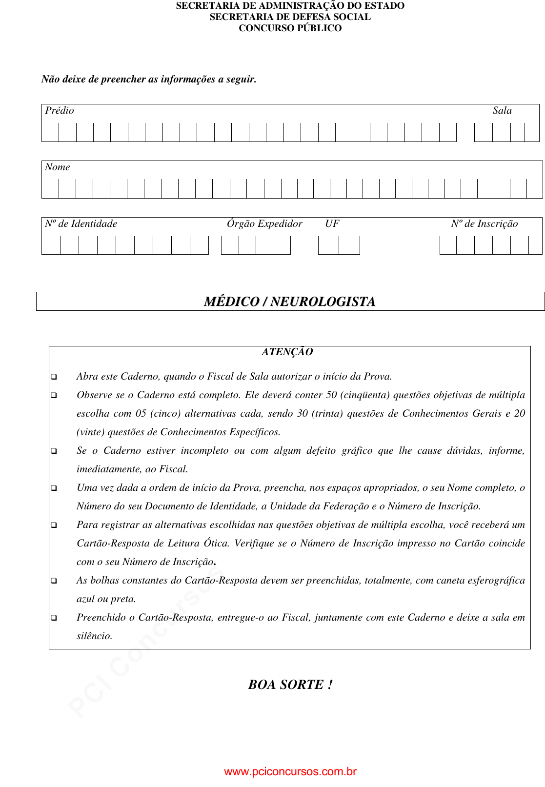 pcimarkpci MDAwMDowMDAwOjAwMDA6MDAwMDowMDAwOmZmZmY6YzkxMDpjMzEx:VGh1LCAyMSBOb3YgMjAyNCAxMDoyODozMiAtMDMwMA== www.pciconcursos.com.br SECRETARIA DE ADMINISTRAÇÃO DO ESTADO SECRETARIA DE DEFESA SOCIAL CONCURSO PÚBLICO Não deixe de preencher as informações a seguir. Prédio Sala Nome Nº de Identidade Órgão Expedidor UF Nº de Inscrição MMÉÉDDIICCOO // NNEEUURROOLLOOGGIISSTTAA ATENÇÃO �� Abra este Caderno, quando o Fiscal de Sala autorizar o início da Prova. �� Observe se o Caderno está completo. Ele deverá conter 50 (cinqüenta) questões objetivas de múltipla escolha com 05 (cinco) alternativas cada, sendo 30 (trinta) questões de Conhecimentos Gerais e 20 (vinte) questões de Conhecimentos Específicos. �� Se o Caderno estiver incompleto ou com algum defeito gráfico que lhe cause dúvidas, informe, imediatamente, ao Fiscal. �� Uma vez dada a ordem de início da Prova, preencha, nos espaços apropriados, o seu Nome completo, o Número do seu Documento de Identidade, a Unidade da Federação e o Número de Inscrição. �� Para registrar as alternativas escolhidas nas questões objetivas de múltipla escolha, você receberá um Cartão-Resposta de Leitura Ótica. Verifique se o Número de Inscrição impresso no Cartão coincide com o seu Número de Inscrição. �� As bolhas constantes do Cartão-Resposta devem ser preenchidas, totalmente, com caneta esferográfica azul ou preta. �� Preenchido o Cartão-Resposta, entregue-o ao Fiscal, juntamente com este Caderno e deixe a sala em silêncio. BOA SORTE ! www.pciconcursos.com.br pcimarkpci MDAwMDowMDAwOjAwMDA6MDAwMDowMDAwOmZmZmY6YzkxMDpjMzEx:VGh1LCAyMSBOb3YgMjAyNCAxMDoyODozMiAtMDMwMA== www.pciconcursos.com.br 2 CONHECIMENTOS GERAIS 01. Paciente de 56 anos, hipertenso e diabético chega à emergência com quadro de dor precordial em aperto, com irradiação para membro superior esquerdo, sudorese, palidez e náusea, com duração de 40 minutos, contínua. Pressão arterial na entrada de 70 X 40. No eletrocardiograma, encontramos supra desnivelamento de ST em D2, D3 e AVF, além de supra desnivelamento de ST em V3R e V4R. Marque a alternativa INCORRETA. A) Provável infarto de ventrículo direito, pela presença de hipotensão e supra desnivelamento de V3R e V4R. B) Nos casos de sinais de infarto inferior, é mandatório lembrar as derivações que fazem diagnóstico de infarto de ventrículo direito, presente em 50% destes casos. C) Neste caso, a reposição volêmica é uma das principais medidas para restauração da pressão arterial. D) Se disponível no hospital, o encaminhamento para a sala de hemodinâmica para este paciente, nas primeiras 12 horas do início da dor, seria fundamental para tentativa de revascularização da artéria culpada (provavelmente a artéria coronária direita). E) Iniciar o tratamento padrão para infarto do miocárdio, com nitrato, beta-bloqueador, AAS, heparina e oxigênio. 02. Paciente de 60 anos, coronariopata, hipertenso e diabético chega à emergência com queixa de dispnéia progressiva relacionada com esforço, dispnéia paroxística noturna e edema de MMII. Ao exame, você percebe estase de jugular, hepatomegalia dolorosa à palpação e refluxo hepato-jugular, além de creptações nas bases pulmonares. O paciente fazia uso de propranolol, diltiazem, AAS e metformina. Marque a alternativa INCORRETA. A) A presença de B3 na ausculta cardiovascular seria, também, um dos sinais clínicos com maior especificidade para o diagnóstico de insuficiência cardíaca. B) A presença de creptações nas bases pulmonares é mais um dado que fala a favor da presença de congestão pulmonar, mas pode estar ausente em até 70% dos casos. C) Se um ecocardiograma confirmar insuficiência cardíaca sistólica, deveremos, a princípio, pensar em suspender o propranolol e o diltiazem e iniciar um beta-bloqueador, como o carvedilol, associado a um inibidor da enzima conversora de angiotensina e aldactone, além de medicações para congestão pulmonar, conforme necessidade do paciente (digoxina e diuréticos). D) A associação de estatina para este caso deve ser feita, buscando níveis de LDL abaixo de 130mg/dL e triglicerídeos abaixo de 150mg/dL. E) Evitar uso da rosiglitazona para seu controle glicêmico, por esta ter recentemente mostrado eventos adversos relacionados ao sistema cardiovascular. 03. Paciente de 68 anos, diabético, com história de tabagismo importante, chega à emergência com história de tosse com secreção nos últimos 4 dias, associado a quadro de dispnéia, desorientação, cianose de extremidades, estertores grosseiros em hemitórax direito, taquicardia e pressão arterial de 80 X 40. Marque a alternativa INCORRETA. A) A presença de estertores grosseiros no hemitórax direito pode indicar congestão pulmonar, e o início mais precoce de drogas vasoativas no lugar da reposição volêmica vigorosa é o mais indicado. B) A gasometria arterial é fundamental na avaliação inicial, para verificação do grau de acidemia, oxigenação, dosagem de lactato, entre outros parâmetros importantes na condução deste caso. C) O paciente parece estar em iminência de intubação orotraqueal, e, nesta situação, o uso da ventilação não invasiva não é adequado. D) A associação de beta lactâmico de amplo espectro com macrolídeo seria adequada para este caso na ausência de fatores de risco importantes para bactérias multirresistentes. E) A associação de corticóide venoso está indicada na ausência de resposta de elevação da pressão arterial após reposição volêmica adequada e início de drogas vasoativas. 04. Paciente de 49 anos chega à emergência com queixa de cefaléia frontal, em faixa, associada a náuseas, quadro que está sempre associado a pressões elevadas, segundo ele. Ao exame físico, não há sinais focais neurológicos nem de hipertensão craniana, ausculta respiratória e cardíaca normais e pressão arterial de 170 por 11