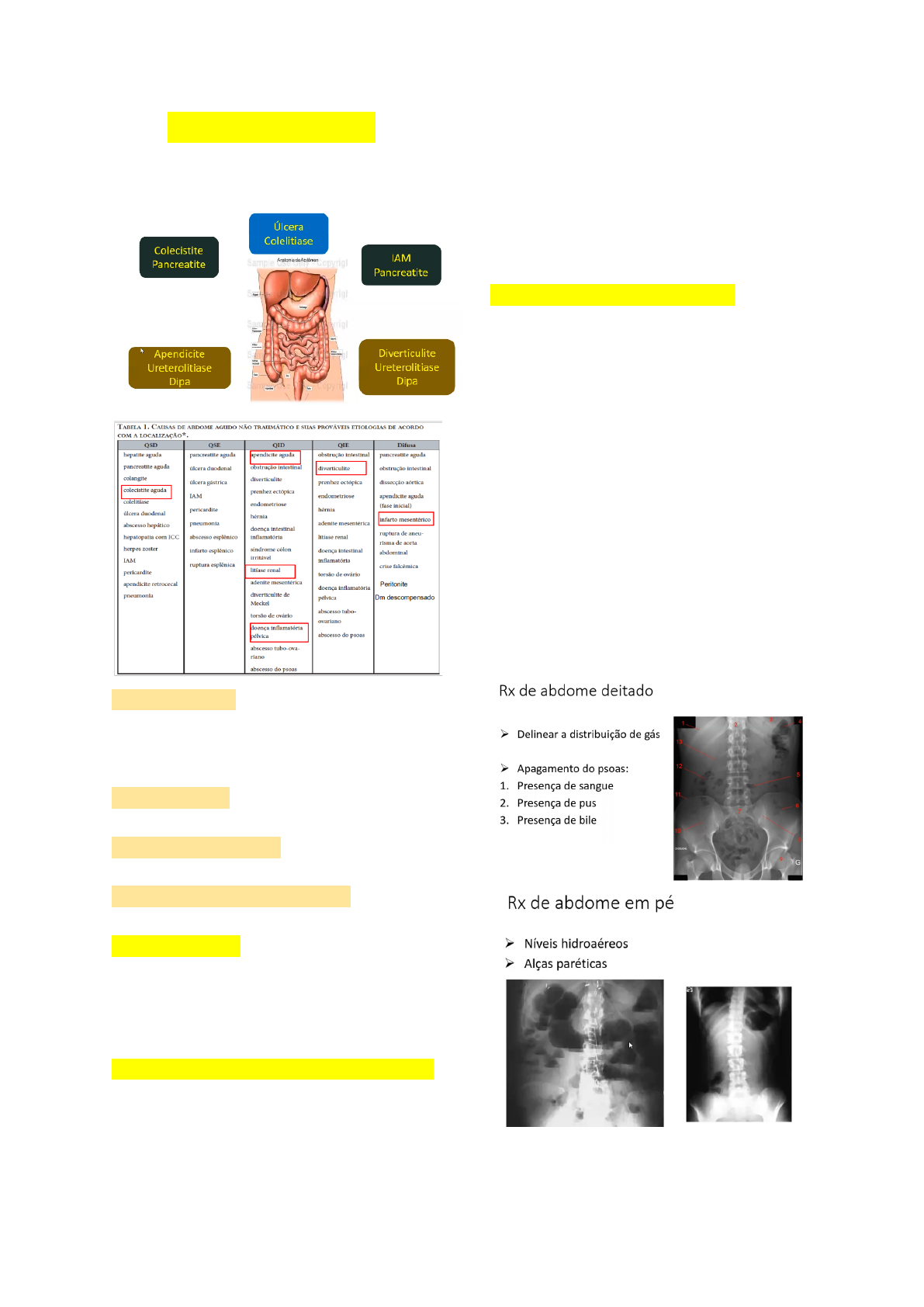 CLÍNICA CIRÚRGICA /ISABELLA AFONSO DE SOUZA ABDOME AGUDO Dor súbita: Isquemia mesentérica, Perfuração de víscera oca, Dissecção aguda de aorta, Litíase renal E Gravidez ectópica rota Dor Insidiosa : Apendicite, Colecistite, Pancreatite, Diverticulite, DIPA, ITU Dor em Cólica: Cólica biliar, Obstrução intestinal, Cólica nefrética Dor em Queimação : DRGE, Isquemia DOR Visceral: Imprecisa, cólica ou queimação, paciente inquieto. Causas da dor visceral: Distensão, contração, inflamação ou isquemia. Geralmente acompanhada de náusea e vômito. DOR Parietal (somática profunda): aguda, intensa e persistente. Quando acomete o peritônio parietal. Localização precisa. Frequentemente acompanhada de contratura da musculatura abdominal. Leva o doente a permanecer quieto. Ex: Apendicite aguda a dor inicialmente é visceral, quando a inflamação acomete o peritônio parietal é momento em que o paciente consegue indicar a localização da dor. Dor referida ou irradiada: Dor de origem intra-abdominal que se manifesta em área anatomicamente distante, por compartilhar os mesmos circuitos neurais centrais. Exemplo: dor no ombro por irritação do diafragma (Sinal de Kher). Como por exemplo, um paciente está no 1° dia de pósoperatório de uma laparotomia, tinha muito pus em cavidade, depois no 5° dia de pós-operatório começa uma dor no ombro. Devemos, nesse caso, pensar que o paciente esteja fazendo uma nova coleção de pus próximo ao diafragma e isso possa está irritando o diafragma. CLÍNICA CIRÚRGICA /ISABELLA AFONSO DE SOUZA ● Cirurgia abdominal prévia + dor tipo cólica+ distensão? Obstrução por bridas ● História de úlcera péptica + dor abdominal difusa + abdome em tábua?Úlcera perfurada Inspeção Distensão abdominal ( Ascite, Obstrução intestinal, Sangue, Bile, Íleo paralítico), Posições antálgicas, Hérnias, Manchas e Cicatriz cirúrgica ROTINA DE ABDOME AGUDO Rx de tórax, Rx de abdome em pé e deitado, Hemograma completo, Sumário de urina, Amilase, Beta HCG ☆O raio x de abdome deitado serve para delinear a distribuição de gases e visualizar uma alça sentinela. ☆ O raio x de abdome em pé= visualizar os níveis hidroaéreos (obstrução intestinal), ou uma sentinela na fossa ilíaca direta (pode sugerir apendicite TIPOS: inflamatório,Perfurativo, Obstrutivo, Hemorrágico, Vascular/isquêmico Sinal de irritação peritoneal= descompressão brusca. Como pesquisar se o paciente tem uma irritação peritoneal? Blumberg. Quando que ele é positivo? Á pesquisar se o paciente tem sinal de irritação peritoneal, pois a chance dele ser cirúrgico é grande. CLÍNICA CIRÚRGICA /ISABELLA AFONSO DE SOUZA ABDOME AGUDO INFLAMATÓRIO causas: Apendicite, diverticulite, colecistite, pancreatite, anexite, abscesso hepático e adenite mesentérica. Nem todos os exemplos citados anteriormente são cirúrgicos, mas são quadros de abdômen agudo inflamatório (geralmente tem febre) 1. Apendicite aguda •Artéria apendicular é ramo da ileal que é ramo da ileocólica que é ramo da mesentérica superior • 7-10 cm de comprimento e 0,5-2,5 cm de largura QUADRO CLINCO Dor vagal periumbilical que migra para a fossa ilíaca direita. •homem jovem + dor à descompressão em fossa ilíaca direita + vômitos + anorexia + febre. •Paciente inicia com epigastralgia ou dor periumbilical/ mesogástrio, de moderada intensidade, as vezes com cólicas abdominais sobrepostas, que é acompanhada por anorexia e náusea. •Posteriormente, 12-24 horas após, se irradia para fossa ilíaca direita 1- Acontece que a distensão do órgão estimula fibras aferentes viscerais e produz uma dor visceral mal delimitada. Apenas quando o processo inflamatório ultrapassar a serosa e entrar em contato com o peritônio parietal, ocorrerá estimulação de inervação aferente parietal e dor bem localizada em FID •Anorexia, náuseas e vômitos (vomito é + comum em criança mas em adultos também ocorre) + febre baixa 37,5 a 38°C • A dor abdominal é tipo em cólica com piora a movimentação e tosse e NÃO melhora com a evacuação e eliminação de flatos. • 25% dos casos a dor se inicia em fossa ilíaca direita sem migrar. • Constipação > diarreia •Atenção: febre alta é perfuração, peritonite difusa. O QUE PODE DESENCADEAR? • Obstrução do lúmen apendicular por: 1- Hiperplasia linfoide (causa+ comum), fecalito, corpo estranho e tumores •A obstrução do apêndice pode causar proliferação bacteriana e secreção de CLÍNICA CIRÚRGICA /ISABELLA AFONSO DE SOUZA muco, causando distensão do apêndice, e obstrução venosa e linfática, por consequência tem se edemaciação, necrose e perfuração do apêndice em até 48 horas. Perfuração do apêndice pode causar: 1- Bloqueio de intestino delgado e omento levando a formação de abscesso/ plastrão. O paciente pode estar oligossintomático, apenas com desconforto em FID. 2- Ou se for perfuração livre pode causar peritonite difusa. Paciente com abdome em tábua e temperatura elevada. Inspeção= paciente com flexão de MMII direito ou distensão abdominal, quieto no leito Ausculta= ruídos hidroaéreos diminuídos ou ausentes Palpação= ponto de Mc burney 1- Hiperestesia cutânea ao pinçamento da pele, + aumento da tensão em FID ou em todo abdome+ massa palpável+ dor em FID+ dor a descompressão brusca em FID ou difusamente SINAIS DE IRRITAÇÃO PERITONEAL Sinal de Blumberg: manobra de descompressão brusca na fossa ilíaca direita, no ponto de McBurney. https://youtu.be/95zhFvo7RaU?si=mIC W5wOjqDo5aS0o Sinal de Rovsing: Comprime-se o quadrante inferior esquerdo do abdome do paciente, resultando em dor no quadrante inferior direito pois mobiliza gases e/ou fezes Sinal Psoas: o paciente deita em decúbito lateral esquerdo com flexão da coxa direita, positivo se tiver dor no quadrante inferior direito. https://youtu.be/9frS7KfWb0Q?si=9g0 w0JVkA9Vj3YRQ https://youtu.be/9frS7KfWb0Q?si=9g0w0J