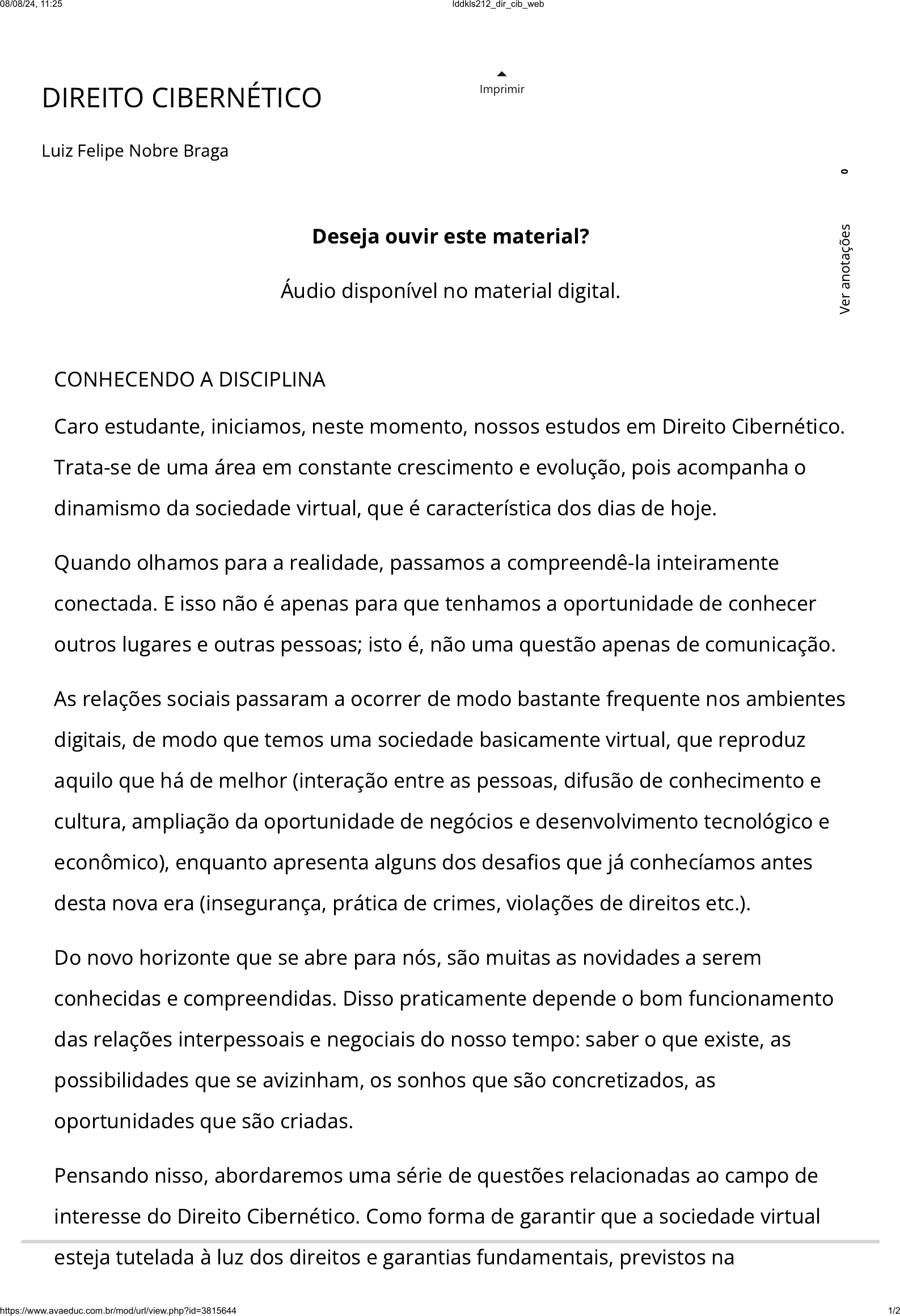 DIREITO CIBERNÉTICO Luiz Felipe Nobre Braga Imprimir CONHECENDO A DISCIPLINA Caro estudante, iniciamos, neste momento, nossos estudos em Direito Cibernético. Trata-se de uma área em constante crescimento e evolução, pois acompanha o dinamismo da sociedade virtual, que é característica dos dias de hoje. Quando olhamos para a realidade, passamos a compreendê-la inteiramente conectada. E isso não é apenas para que tenhamos a oportunidade de conhecer outros lugares e outras pessoas; isto é, não uma questão apenas de comunicação. As relações sociais passaram a ocorrer de modo bastante frequente nos ambientes digitais, de modo que temos uma sociedade basicamente virtual, que reproduz aquilo que há de melhor (interação entre as pessoas, difusão de conhecimento e cultura, ampliação da oportunidade de negócios e desenvolvimento tecnológico e econômico), enquanto apresenta alguns dos desa�os que já conhecíamos antes desta nova era (insegurança, prática de crimes, violações de direitos etc.). Do novo horizonte que se abre para nós, são muitas as novidades a serem conhecidas e compreendidas. Disso praticamente depende o bom funcionamento das relações interpessoais e negociais do nosso tempo: saber o que existe, as possibilidades que se avizinham, os sonhos que são concretizados, as oportunidades que são criadas. Pensando nisso, abordaremos uma série de questões relacionadas ao campo de interesse do Direito Cibernético. Como forma de garantir que a sociedade virtual esteja tutelada à luz dos direitos e garantias fundamentais, previstos na Deseja ouvir este material? Áudio disponível no material digital. 0 V e r a n o ta çõ e s 08/08/24, 11:25 lddkls212_dir_cib_web https://www.avaeduc.com.br/mod/url/view.php?id=3815644 1/2 Constituição da República, nos dedicaremos ao estudo sistemático dos temas fundamentais da tecnologia e da inovação, como a segurança e proteção das informações e dos dados, a matéria do blockchain, no itinerário do mercado das novas moedas digitais (criptomoedas, como a bitcoin), bem como a seara do Big Data e da Internet das Coisas. Também falaremos da Lei Geral de Proteção de Dados (Lei nº 13.709/2018), do Marco Civil da Internet (Lei nº 12.965/2014) e das questões polêmicas da chamada “herança digital”. É importante tanto conhecer as legislações e a disciplina jurídica em relação ao tratamento das informações e dos dados, além do acesso e interação nos ambientes virtuais, quanto é fundamental compreender a sistemática de proteção da propriedade intelectual em relação às marcas e patentes, além dos direitos autorais na era digital. Por �m, nos dedicaremos a investigar o direito contratual eletrônico no domínio das relações consumeristas, encerrando com uma abordagem acerca das questões criminais envolvidas no cenário cibernético. Com os estudos propostos neste material, espera-se a construção de uma visão panorâmica e su�ciente dos principais institutos que permeiam o Direito Cibernético, algo que surge não apenas como uma exigência de qualquer pro�ssional, mas como uma necessidade própria do nosso tempo histórico. Bons estudos! 0 V e r a n o ta çõ e s 08/08/24, 11:25 lddkls212_dir_cib_web https://www.avaeduc.com.br/mod/url/view.php?id=3815644 2/2