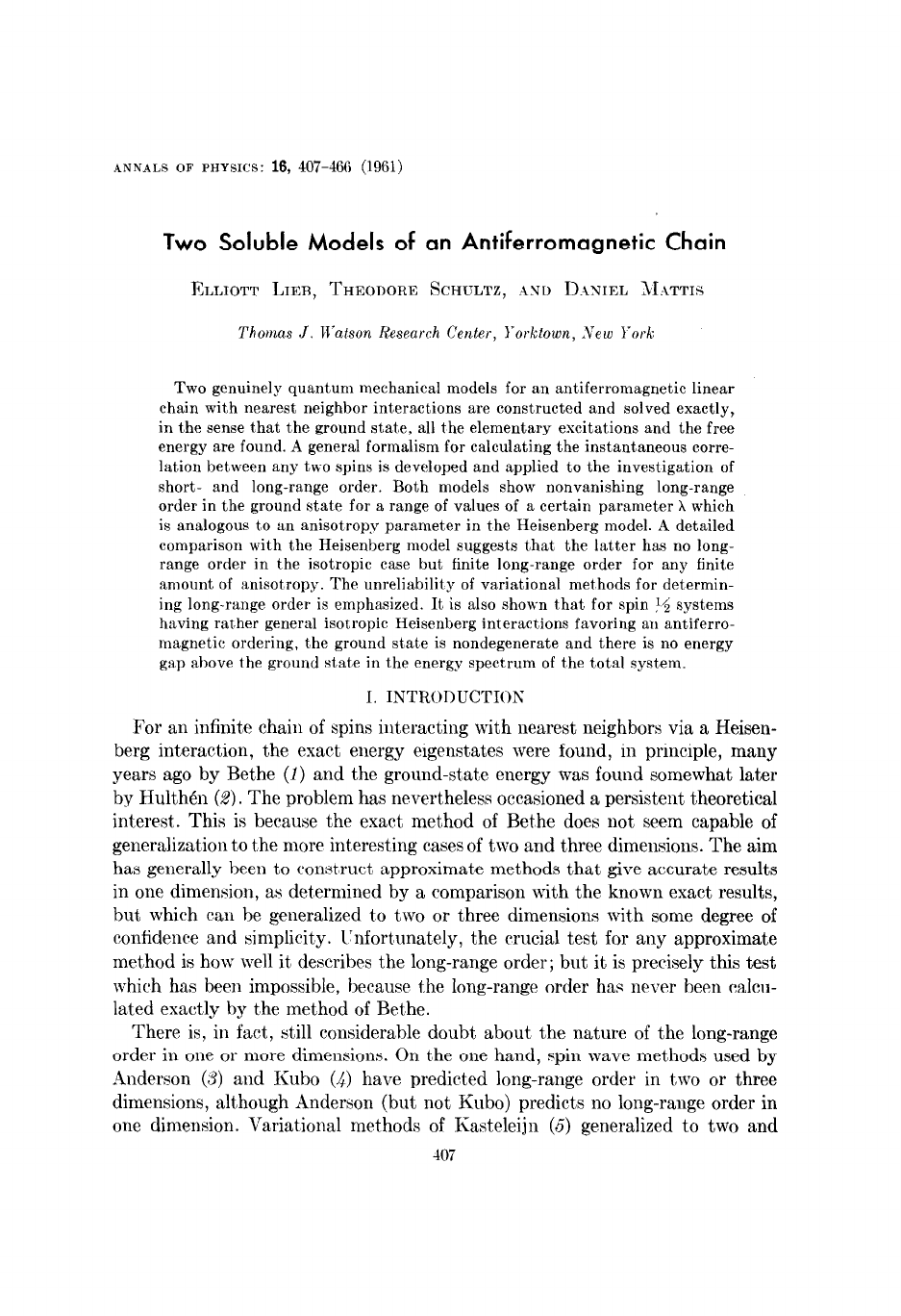 ANNALS OF PHYSICS: 16, 407-466 (1961) Two Soluble Models of an Antiferromagnetic Chain ELLIOTT LIER, THEODORE SCHULTZ, .m~ D.INIEL MATTE Thomas J. Watson Research Center, Iyorktown, AY’ew I7ark Two genuinely quantum mechanical models for an antiferromagnetic linear chain with nearest neighbor interactions are constructed and solved exactly, in the sense that the ground stat,e, all the elementary excitations and the free energy are found. A general formalism for calculating the instantaneous corre- lation between any two spins is developed and applied to the investigation of short- and long-range order. Both models show nonvanishing long-range order in the ground state for a range of values of a certain parameter X which is analogous t,o an anisotropy parameter in the Heisenberg model. A detailed comparison with the Heisenberg model suggests t,hat the latter has no long- range order in the isotropic case but finite long-range order for any finite amount of anisotropy. The unreliability of variational methods for determin- ing long-range order is emphasized. It is also shown that for spin r4 systems having rat,her general isotropic Heisenberg interactions favoring an antiferro- magnetic ordering, t,he ground state is nondegenerate and there is no energy gap above the ground st,at)e in the energy spectrum of t,he total system. I. INTRODUCTIOiX For an infinite chain of spins interact,ing with nearest neighbors via a Heisen- berg interaction, the exact energy eigenstates were found, in principle, many years ago by Bethe (1) and the ground-state energy was fouled somewhat later by Hulthen (2). The problem has nevertheless occasioned a persistent theoretical interest. This is because the exact method of Bethe does not seem capable of generalization t’o the more interesting cases of two and three dimensions. The aim has generally been t,o con&ruct, approximate methods that give accurate results in one dimension, as determined by a comparison with the known exact results, but which can be generalized to two or three dimensions with some degree of confidence and simplicit’y. I’nfort8unately, the crucial test for any approximate method is how well it describes the long-range order; but it is precisely this test which has been impossible, because the long-range order has never been calcu- lated exactly by t,he method of Bethe. There is, in fact, still considerable doubt about t,he nature of the long-range order in one or more dimensions. On t#he one hand, spin wave met)hods used by ilnderson (3) and Kubo (4) have predicted long-range order in two or three dimensions, although Anderson (but not Kubo) predicts no long-range order in one dimension. Variational methods of Kasteleijn (6) generalized to two and 407 408 LIEB, SCHULTZ, APiD MATTIS three dimensions by Taketa and Kakamura (h’), and of Marshall (7’), all related to a variational method of Hulth6n (2)) indicate no long-range order in one, two, and three dimensions for the completely isotropic interaction. On the other hand, they all predict the onset of long-range order for a certain critical amount of anisotropy-the same amount at which a kink is predict’ed for the short,-range order. Exact calculations by Orbach (8) on the anisotropic case, generalizing the method of Bethe, show the kink to be spurious for the one-dimensional case, hut throw no further light on the long-range order. Walker (9) has observed that the ground-state energy calculated by Orbach has a power series expansion around the limit,ing case of the completely anisotropic interaction (Ising limit) which seems to give a good representation of the ground-state energy even for the isotropic case, although he observes that a similar expansion for the long- range order suggest’s the long-range order might vanish when the anisotropy falls below a certain critical value. Ruijgrok and Rodriguez (10) have developed a variational method for the one-dimensional case which gives a good value for t,he ground-state energy, significantly better than previous variational methods, and which also predicts finite long-range order. Davis (11) has performed a perturbation theoretic calculation which indicates, to the order to which it has been carried, a long-range order in any number of dimensions even for the iso- tropic case. There are two questions raised by all these investigations. First, can a purely isotropic Heisenberg interact#ion between nearest neighbors produce long-range order in any number of dimensions? Second, if such an ordering tendency exists in, say, two or Ohree dimensions, will it also exist, in only one dimension, or would the absence of order in one dimension prove nothing at all about order in two or three dimensions? The purpose of the present paper is to gain further insight into t,he effectIs of anisotropy in one dimension. Two models will be constructed which can be solved exact,ly in considerable detail and which bear a reasonably close re- semblance to the Heisenberg model. The investigation of t’he first of t#hese models strongly suggests that the isotropic Heisenberg model has no long-range order but that such order exists for any finite amount, of anisotropy. Both models emphasize the subtle nature of long-range order and the insufficiency of vari- ational methods as a reliable approach to this question. The question of the relation of t#hese results t,o two- and three-dimensional (aascs is left complet’ely open. h Section II we consider the first’ of these models, the “XY model.” It is shown that t’he Hamiltonian can be expressed as a quadratic form in creation and anrlihilation operators for fermions, and this quadratic form ran be diagonalized, thereby giving the complete set of stat,es, excit,ation energies, and partition sum. In terms of these operators, general expressions for the order het’ween any two spins are derived involving a kind of Green function, Gil , which can be explicitly .4NTIFF,l2RO~~IAC;NETI~ ('HAIS 100 evalua