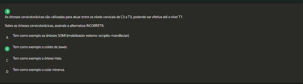 3 As órteses cervicotorácicas são utilizadas para atuar entre os níveis cervicais de C3 a podendo ser efetiva até nível T7. Sobre as órteses cervicotorácicas, assinale a alternativa INCORRETA: A Tem como exemplo as SOMI (imobilizador esterno-occipito-mandibular) B Tem como exemplo colete de Jewet Tem como exemplo a órtese Halo. D Tem como exemplo colar minerva