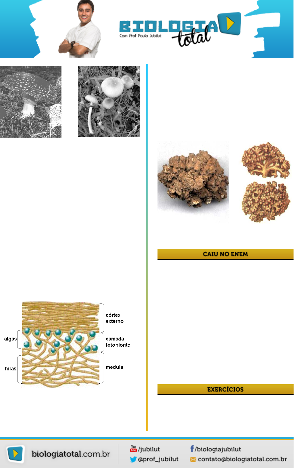 Amanita muscaria Psilocybe mexicana (Cogumelos alucinógenos) LIQUENS Liquens são associações mutualísticas entre algas e fungos. Na maioria dos casos, as algas pertencem ao grupo das clorofíceas ou cianobactérias, enquanto os fungos pertencem ao grupo dos ascomicetos. Nessa associação, as algas, ao fazerem fotossíntese, fornecem glicose para o fungo, enquanto este envolve e protege a alga, fornecendo-lhes água e sais minerais que absorvem do meio ambiente. A reprodução dos liquens se faz por meio de estruturas denominadas sorédios, formadas por hifas do fungo e gonídias das algas. Os sorédios são transportados pelo vento e originam novos liquens quando caem em terreno favorável. São organismos pioneiros, muito resistentes, que vivem sobre rochas, troncos de árvores, etc. Quando se instalam sobre rochas, secretam ácidos que desmineralizam o substrato, preparando assim o terreno para a instalação de outras espécies. Estrutura de um liquen O líquen cresce como se fosse um único organismo, de tal forma que os botânicos os classificam dentro da classe Lichene e lhes dão nomes de gêneros e espécie vegetal. Em sua maioria os liquens são verde-acinzentados, mas algumas formas podem apresentar coloração preta, avermelhada, alaranjada. Entre estes últimos, algumas espécies são indicadoras de poluição ambiental, pois não se desenvolvem em locais em que há altos índices de poluição. Alguns liquens são comestíveis, como o Lecanora esculenta que se desenvolvem nos desertos, o Umbilicaria esculenta típico do Japão e os liquens que se desenvolvem nas regiões de tundra, servindo como alimento para as renas. Lecanora esculenta – liquen comestível 1. (ENEM) Para preparar uma massa básica de pão, deve-se misturar apenas farinha, água, sal e fermento. Parte do trabalho deixa-se para o fungo presente no fermento: ele utiliza amido e açúcares da farinha em reações químicas que resultam na produção de alguns outros compostos importantes no processo de crescimento da massa. Antes de assar, é importante que a massa seja deixada num recipiente por algumas horas para que o processo de fermentação ocorra. Esse período de espera é importante para que a massa cresça, pois é quando ocorre a a) reprodução do fungo na massa. b) formação de dióxido de carbono. c) liberação de energia pelos fungos. d) transformação da água líquida em vapor d’água. e) evaporação do álcool formado na decomposição dos açúcares. 2. (UTFPR) Os materiais orgânicos na natureza passam por um processo de reaproveitamento chamado de reciclagem que é fundamental para a manutenção do equilíbrio do meio ambiente. Para que a reciclagem ocorra de forma satisfatória são necessários os seguintes agentes biológicos: a) insetos carnívoros e plantas aquáticas. b) fungos e vegetais. c) bactérias e fungos. d) protozoários e minhocas. e) bactérias e plantas. 3. (UDESC) Analise as proposições em relação aos fungos. I. Os basidiomicetos são fungos conhecidos como cogumelos e orelhas-de-pau por apresentarem o corpo de frutificação denominado basidiocarpo, a exemplo, champignon. II. Os deuteromicetos são fungos com corpos de frutificação em forma de base, formando projeções denominadas basidiósporos, os quais darão origem aos micélios, a exemplo, os bolores. III. Os ascomicetos são fungos que possuem asco (saco), onde são formados os esporos na reprodução sexuada, a exemplo, o Saccharomyces cerevisiae usado na fabricação de bebidas alcoólicas. IV. Os zigomicetos são fungos autotróficos filamentosos que vivem no solo como decompositores ou parasitas e apresentam estrutura assexuada característica denominada zigosporângio. Assinale a alternativa correta. a) Somente as afirmativas I e III são verdadeiras. b) Somente as afirmativas III e IV são verdadeiras. c) Somente as afirmativas I, II e III são verdadeiras. d) Somente as afirmativas I, II e IV são verdadeiras. e) Todas as afirmativas são verdadeiras. 4. (UEMG) Doenças provocadas por fungos destroem cada vez mais culturas Cientistas estudaram o aumento do número e a gravidade das infecções por fungos sobre a fauna e a flora a partir de meados do século XX. De acordo com o artigo, o aumento das doenças provocadas por fungos nas plantas e nos animais ameaça a segurança alimentar e a estabilidade dos ecossistemas naturais. As infecções por fungos destroem anualmente 125 milhões de toneladas das cinco principais culturas – arroz, trigo, milho, batata e soja – que proporcionam a maior parte das calorias consumidas. As infecções por fungos ameaçam também espécies como abelhas, tartarugas marinhas, corais, anfíbios e morcegos. Nature. Emerging fungal threats to animal, plant and ecosystem health.12/4/2012. Adaptado. Além do que já foi apresentado, os fungos, ao eliminarem muitas espécies de anfíbios, têm contribuído para o aumento da incidência de viroses no homem, como a dengue e a febre amarela, transmitidas por mosquitos. Assinale a alternativa que contém uma explicação ADEQUADA para esse fato: a) Os anfíbios são também hospedeiros dos vírus causadores dessas doenças. Desde que foram eliminados, os vírus se readaptaram e, com isso, passaram em seguida a parasitar o homem. b) As larvas de anfíbios são aquáticas e predam as larvas dos mosquitos, que também são aquáticas. Assim, com a eliminação dos anfíbios, ocorre um grande aumento da população desses mosquitos. c) Os mosquitos transmissores dessas viroses são competidores dos fungos, também parasitando os anfíbios. Com a eliminação dos anfíbios, passaram em seguida a parasitar o ser humano. d) Mosquitos, ao sugarem o sangue de anfíbios parasitados por esses fungos, desenvolvem mais resistência e proliferam mais rapidamente, o que favorece o aumento da incidência dessas doenças no homem. 5. (FUVEST) A lei 7678 de 1988 define que “vinho é a bebida obtida pela fermentação alcoóli
