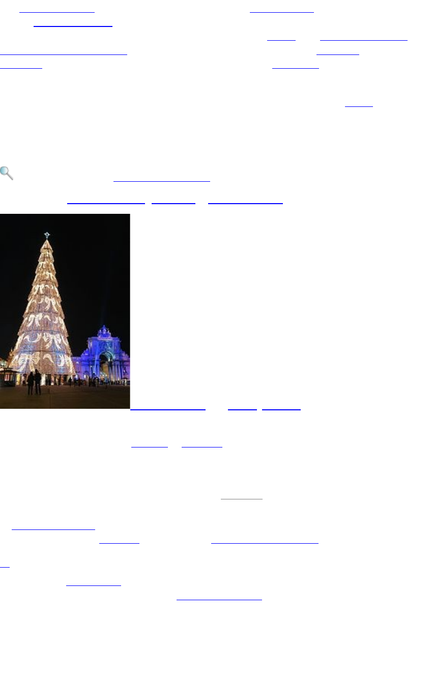 Na teologia cristã, o nascimento de Jesus é a encarnação de Jesus como segundo Adão como realização da vontade de Deus para desfazer o dano provocado pela queda do primeiro homem, Adão. As representações artísticas da Natividade tem sido um grande tema para os artistas cristãos desde o século IV. Desde o século XIII, o presépio enfatiza a humildade de Jesus e promove uma imagem mais terna d'Ele, um importante ponto de inflexão em relação às mais antigas imagens do "Senhor e Mestre", o que acabou por influenciar o ministério pastoral do cristianismo.[32][33][34] Símbolos e tradições Decorações Ver artigo principal: Decoração natalina Ver também: Árvore de Natal, Presépio e Luzes de Natal Terreiro do Paço, em Lisboa, Portugal em época natalícia. Uma outra tradição do Natal é a decoração de casas, edifícios, elementos estáticos, como postes, pontes e árvores, estabelecimentos comerciais, prédios públicos e cidades com elementos que representam o Natal, como, por exemplo, as luzes de natal e guirlandas. Em alguns lugares, existe até uma competição para ver qual casa, ou estabelecimento, teve a decoração mais bonita, com direito a receber um prêmio.[carece de fontes] A árvore de Natal é considerado por alguns como uma "cristianização" da tradições e rituais pagãos em torno do Solstício de Inverno, que incluía o uso de ramos verdes, além de ser uma adaptação de adoração pagã das árvores.[35] Outra versão sobre a procedência da árvore de Natal, a maioria delas indicando a Alemanha como país de origem, uma das mais populares atribui a novidade ao monge agostiniano Martinho Lutero (1483-1546), autor da Reforma Protestante do século XVI. Olhando para o céu através de uns pinheiros que cercavam a trilha, viu-o intensamente estrelado parecendo-lhe um colar de diamantes encimando a copa das árvores. Tomado pela beleza daquilo, decidiu arrancar um galho para levar para casa. Lá chegando, entusiasmado, colocou o pequeno pinheiro num vaso com terra e, chamando a esposa e os filhos, decorou-o com pequenas velas acesas afincadas nas pontas dos ramos. Arrumou em seguida papéis coloridos para enfeitá-lo mais um tanto. Era o que ele vira lá fora. Afastando-se, todos ficaram pasmos ao verem aquela árvore iluminada a quem parecia terem dado vida. Nascia assim a árvore de Natal. Queria, assim, mostrar as crianças como deveria ser o céu na noite do nascimento de Cristo.[35] image1.png image2.jpeg